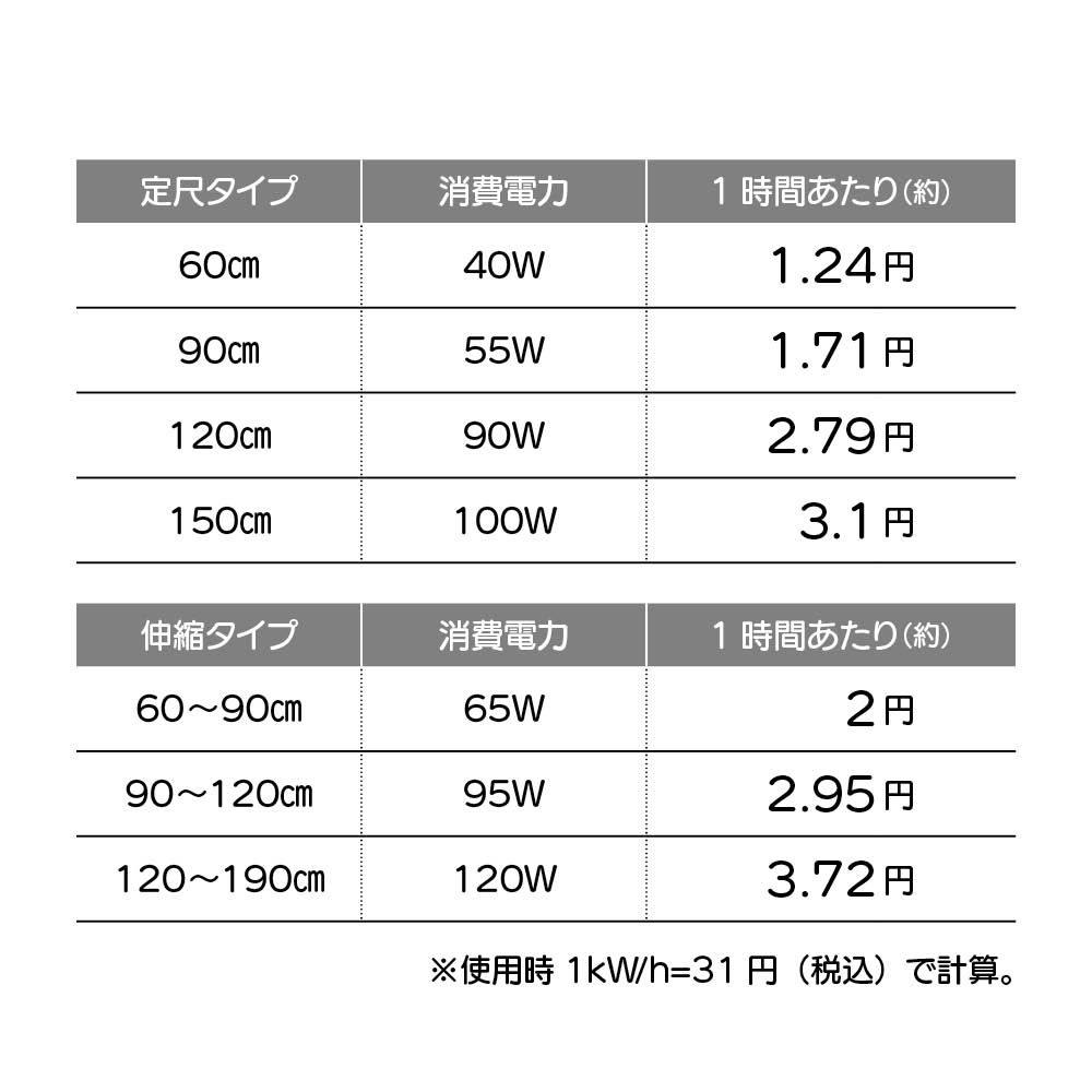 消費電力が少なく1日8時間使用でもわずか29.76円※1と省エネ・節約効果も。※1 幅120〜190cm伸縮式使用時。1kw/h=31円で計算。(1kw(1000w)の電力を1時間使った時にかかる電気代)