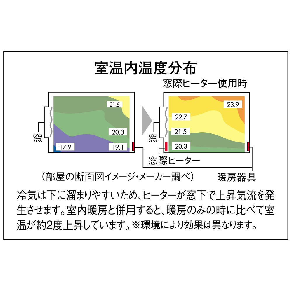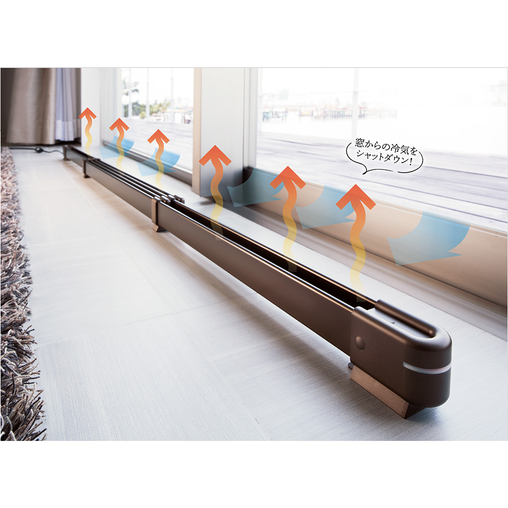 窓から流れ込む冷気をシャットアウトし、お部屋の快適温度を保つ窓際ヒーター。冬の結露を抑え、省エネ対策にも一役。窓から部屋を暖めれば、いいことづくめ!暖房器具をつけても、窓際はヒンヤリ…。エアコンだと部屋の上部ばかりが暖まって、足元は冷えたまま…。そんな経験、ありませんか?窓側ヒーターは、窓際に置いてスイッチを入れるだけで効率的に部屋を暖めて、もっと心地のいいお部屋環境を実現します!【窓際ヒーターのメリットとは?】(1)窓からの冷気を防ぐ(2)結露抑制(3)エアコンの設定温度が下げられる(4)豊富なサイズから選べる【メリットその1】窓からの冷気を防ぐエアコンをつけていても、部屋がなかなか暖まらないのは、実は窓から侵入する冷気のせい。部屋が暖まっても、窓際がなんとなくひんやり感じることはありませんか?そこで、窓際の床付近から暖かい上昇気流を発生させて、冷気をシャットアウト。すると暖房のみを使用したときに比べ、なんと室内温度がおよそ2度もアップ!(※)ムラの少ない、自然な暖かさがお部屋全体を包みます。(※)メーカー調べ。環境により効果は異なります。★温度ムラを解消し、暖房効率が上がる。★窓に近いベッドでも、朝のひんやり感を防止。【メリットその2】結露抑制結露は室内の暖かい空気が、外気で冷えた窓にぶつかることで起こります。だから、暖房で部屋を暖める冬は、結露が生じやすくなるのです。そして、結露した窓をそのままにしておくと、カビの原因にも。窓際ヒーターを置けば、窓際の温度差が縮まり結露の発生が抑制され、カビの防止にもつながります!【メリットその3】省エネ・節約効果も消費電力が少なく1日8時間使用してもたったの26円(※)温度ムラを解消するから体感温度が上がって、エアコンの設定温度を低く保つことができます。暖房器具の補助アイテムとして使用すれば、暖房の設定温度を下げて省エネ・節約にも貢献!(※)幅120〜190cm伸縮式使用時。1kw/h=27円で計算。【メリットその4】豊富なサイズから選べるリビングの掃き出し窓から、キッチンやトイレの幅が狭い窓にも置けるサイズ設計。固定タイプと伸縮タイプがあり、最大190cmまで対応しています。幅の狭い窓にも置ける、60〜90cm伸縮式が今回新しく追加! 60cm以上の窓には伸縮式で対応できるラインナップになりました。★固定タイプは幅60/90/120/150(全てcm)★伸縮タイプは幅60〜90/90〜120/120〜190(全てcm)★幅120〜190伸縮タイプはシルバーと、ディノス限定色のブロンズも選択可設置もお手入れもラクラク設置工事は必要ありません。コンセントにつないで、窓際に置くだけ。1.5mある電源コードで、置きたいところに自由に置けるのもうれしいポイント!本体に付着したホコリや汚れは、掃除機で吸い取るか乾いた布で取り除けるので、お手入れも簡単♪安心で安全の設計運転時の本体表面温度は約65℃で、誤って触れてもやけどの心配ナシ。作動音がないから、家族のおやすみタイムを邪魔しません! さらに安心の日本製。★バイメタルサーモヒューズ(安全装置)付き。★カーテンに触れても、着火や火災の心配はありません。※本体全体を布で覆い被せないようにしてください。