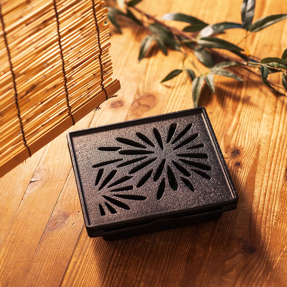 日本家屋でも、モダンな家でも馴染む、古くて新しい国産の鋳物の蚊やり器/蚊取り器。【ブランドコンセプト】城下町・三重県桑名地域の鉄鋳物。城下町らしく夏の題材を着物柄のように図案化しました。【メーカー/デザイナープロフィール】メーカー:株式会社マルデ鋳器…業務用ガスコンロなどを製造ディレクション・プロダクトデザイン:山崎 宏1970年 神戸生まれ。1991年 コクヨ株式会社に入社、商品開発に携わる。2000年 独立2005年 YAMASAKI DESIGN WORKS設立。図柄・グラフィックデザイン:スワミヤソニー株式会社、ソニープラザにてインハウスデザイナーとして勤務、退社後スイスへ 。ボダム、オーダニング&レダのデザイナーとして活動後、ロンドンを経て帰国。現在フリーランスデザイナーとしてグラフィックを中心に幅広い商品を手がける。JAGDA(社団法人日本グラフィックデザイナー協会)正会員。【商品説明】蚊取り線香を入れる蚊やり器も様々。この蚊やり器は、重量感のある鉄鋳物でペットが接触して破損する心配もありません。デザイン面ではあまり見かける事がないスクエアでモダンなフォルムが特長。建物の新旧問わず相性がよく、柄も6種類から選べます。また、使わない季節はしまいやすいようにコンパクトな設計になっています。複数片づけるときは重ねて収納することもできます。桑名の鋳物は江戸時代に徳川家康の家臣、本多忠勝公が桑名藩主となり、鉄砲の製造を始めたことが起源といわれています。現在はマンホールや街灯、業務用ガスコンロなどが造られており、今回は一般家庭で使われるアイテムを商品化しました。