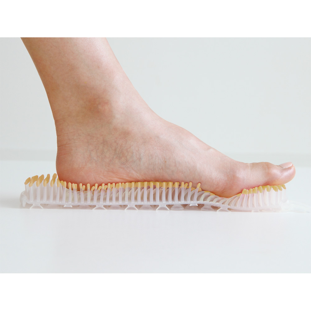 毎日1分間の足裏刺激で、健康的なすべすべの足へ気になる足裏のガサガサ。お風呂タイムに約1分の簡単ケア!お風呂の床に置いて、石鹸やボディソープで泡立てたら、足を乗せてゴシゴシと。たったそれだけで足裏が磨かれ角質除去!足裏・踵・側面・指先等どの部分にもフィットする、しなやかブラシと先端に塗布した研磨剤の効果により、毎日続けることによって、古い角質や角質に潜む菌を少しずつ除去します。※写真は、同シリーズマニキューレを20日間使用した結果。個人差があります。ココがポイント。ディノス企画『フットグルーマー ゲルマAg+』弾力のあるエラストマー樹脂を使用したフットブラシ。先端にはアルミナ(研磨剤)・ゲルマニウム・銀系抗菌剤を塗布し、洗いながら研磨できるすぐれもの。ゲルマニウムと銀イオン配合の研磨剤はディノス企画で、製品の抗菌目的で配合しています。またお風呂においても高級感のあるシャンパンゴールドをイメージした企画カラーです。こだわりの日本製・研磨剤は一つ一つ職人の手作業で塗布。研磨剤をブラシの先端に継ぎ目のなく塗るのは機械では難しい作業。それを職人の手作業で丁寧に作られているからこそ、フットグルーマーの使用感はとても心地よく、多くのお客様がリピート購入される理由の一つになっています。洗いにくい足の間もスッキリ!しなやかな樹脂製のブラシは、足裏・かかと・側面・指先等どの部分にもフィットし、足指の間に入りやすく、足を前後に動かすだけで、お風呂の椅子に座ったまま一度に足先からかかとまで洗えるのも嬉しいところ。洗いながら疲れをオフ!先端ブラシ突起で血行促進。ブラシ先端で足裏を刺激すると、突起の刺激で足裏の血行促進効果(※)も。頑張った日の夜はお風呂ケアでスッキリ心地よく。※指圧代用器としての効果裏側には175個の吸盤付き。裏面の吸盤により床にしっかりと貼りつくため、ゴシゴシ足を動かしてもブラシがズレにくい。毎日使うものだから、ちょっとしたストレスも感じたくないという方にも嬉しい構造。後片付けも簡単。さっと洗って、壁に貼るだけ。吸盤は使用後、側室の壁に貼り付けて保管するのにも便利。自然に水切りができて衛生的です。シャワーで流して吸盤で浴室の壁にペタッとしておけるので、スボラさんにも使い続けやすいお風呂ケアアイテムです。スッキリ・ツルツル自慢の素足へ固くなったかかとの皮膚や、ストッキングの伝線でお悩みの方にも使っていただきたいロングセラー商品。一度使うとやみつきになる、手軽に続けられると好評の『フットグルーマーAg+』をぜひお試しあれ。