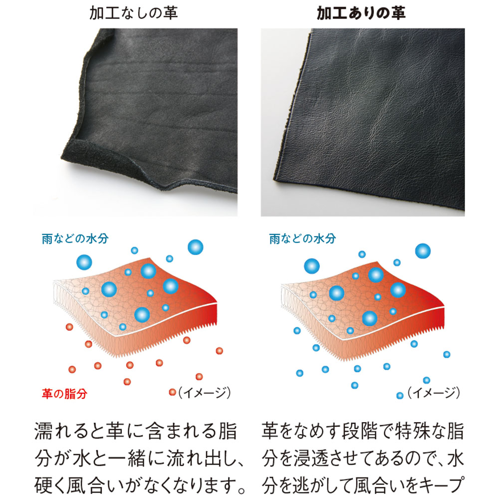 アクアレザーが水に強く劣化しにくいのは、革をなめす段階で特殊な油を浸透させてあるから。濡れてもその水分を外に逃すことができるのです。