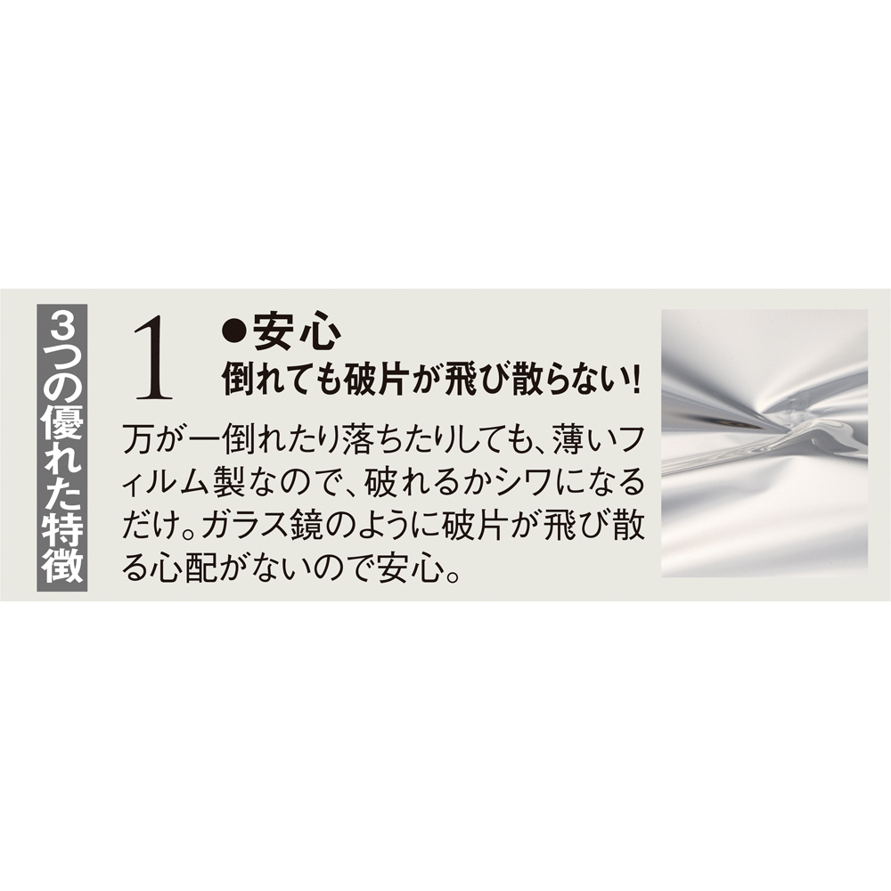 【特徴1:安心】倒れても破片が飛び散らない!万が一倒れたり落ちたりしても、薄いフィルム製なので、破れるかシワになるだけ。ガラス鏡のように破片が飛び散る心配がないので安心。