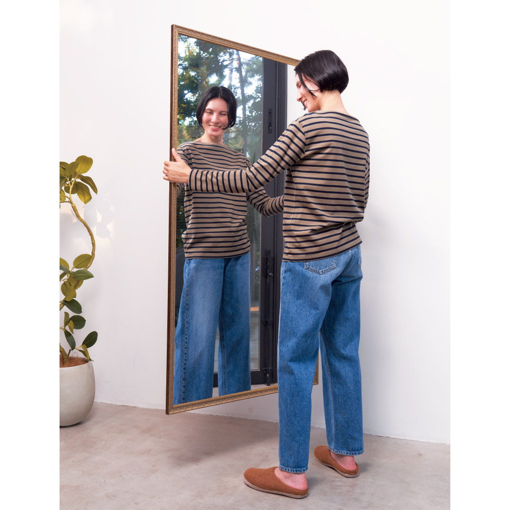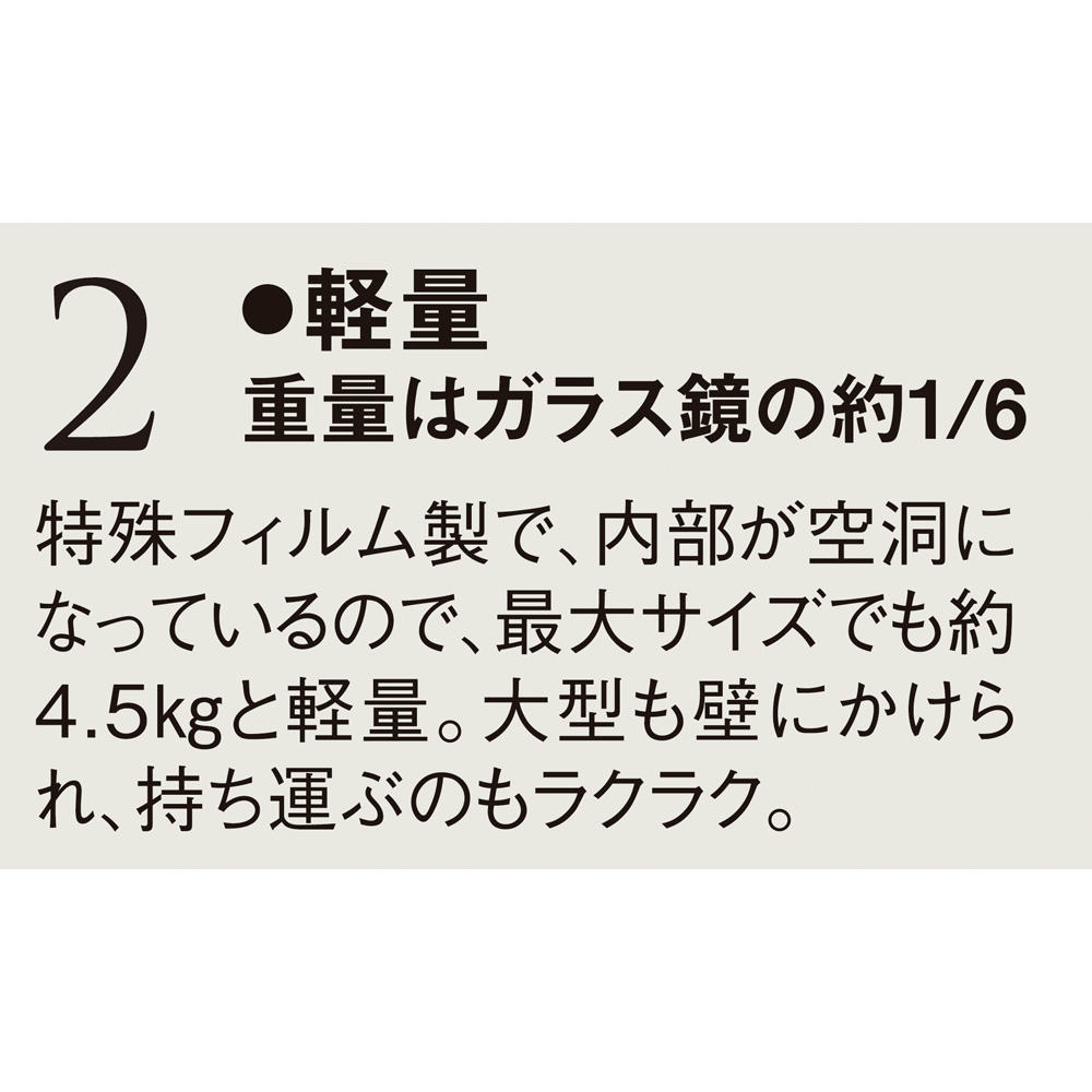 【特徴2:軽量】重量はガラス鏡の約1/6!特殊フィルム製で、内部が空洞になっているので、最大サイズでも約4.5kgと軽量。大型も壁にかけられ、持ち運ぶのもラクラク。