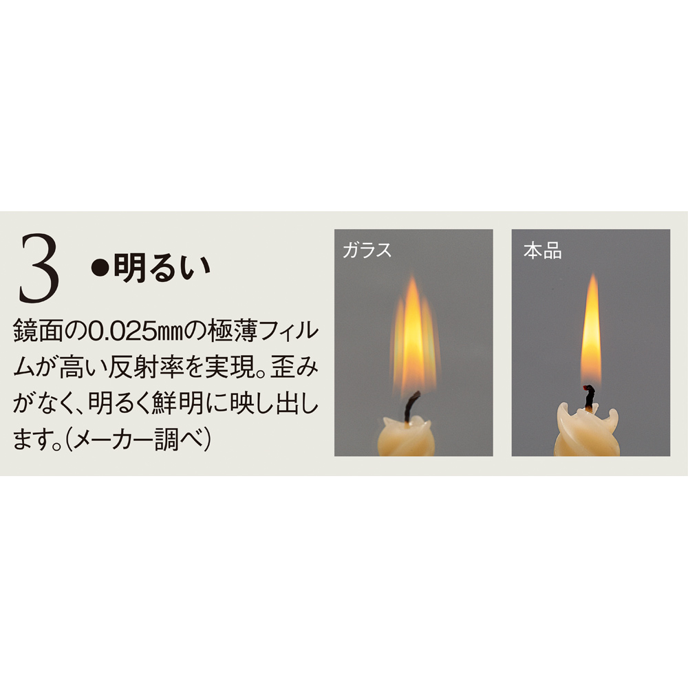 【特徴3:明るい】鏡面の0.025mmの極薄フィルムが高い反射率を実現。歪みがなく、明るく鮮明に映し出します。(メーカー調べ)