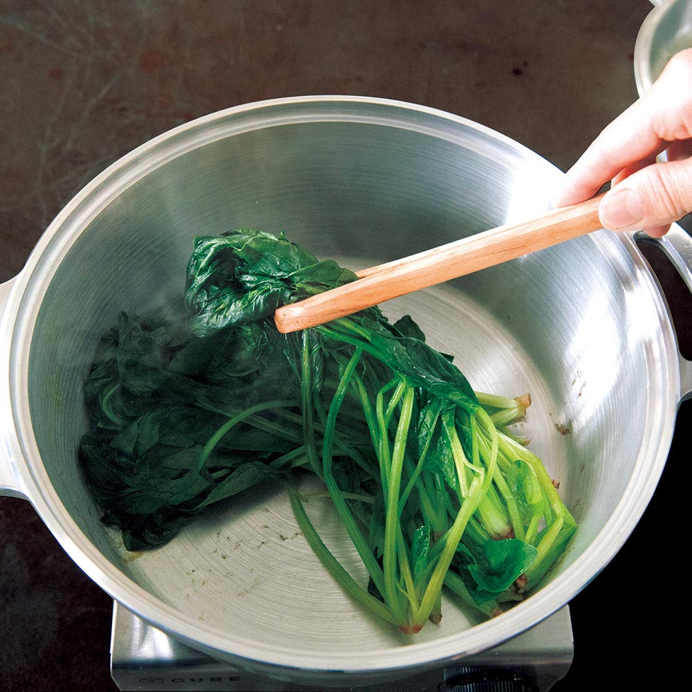 葉物野菜は洗ったときの水分だけで蒸しあがります。野菜は茹でる代わりに洗ったときの水分だけで蒸しあげることで栄養を逃がさず、味も濃く残ります。