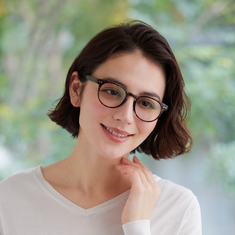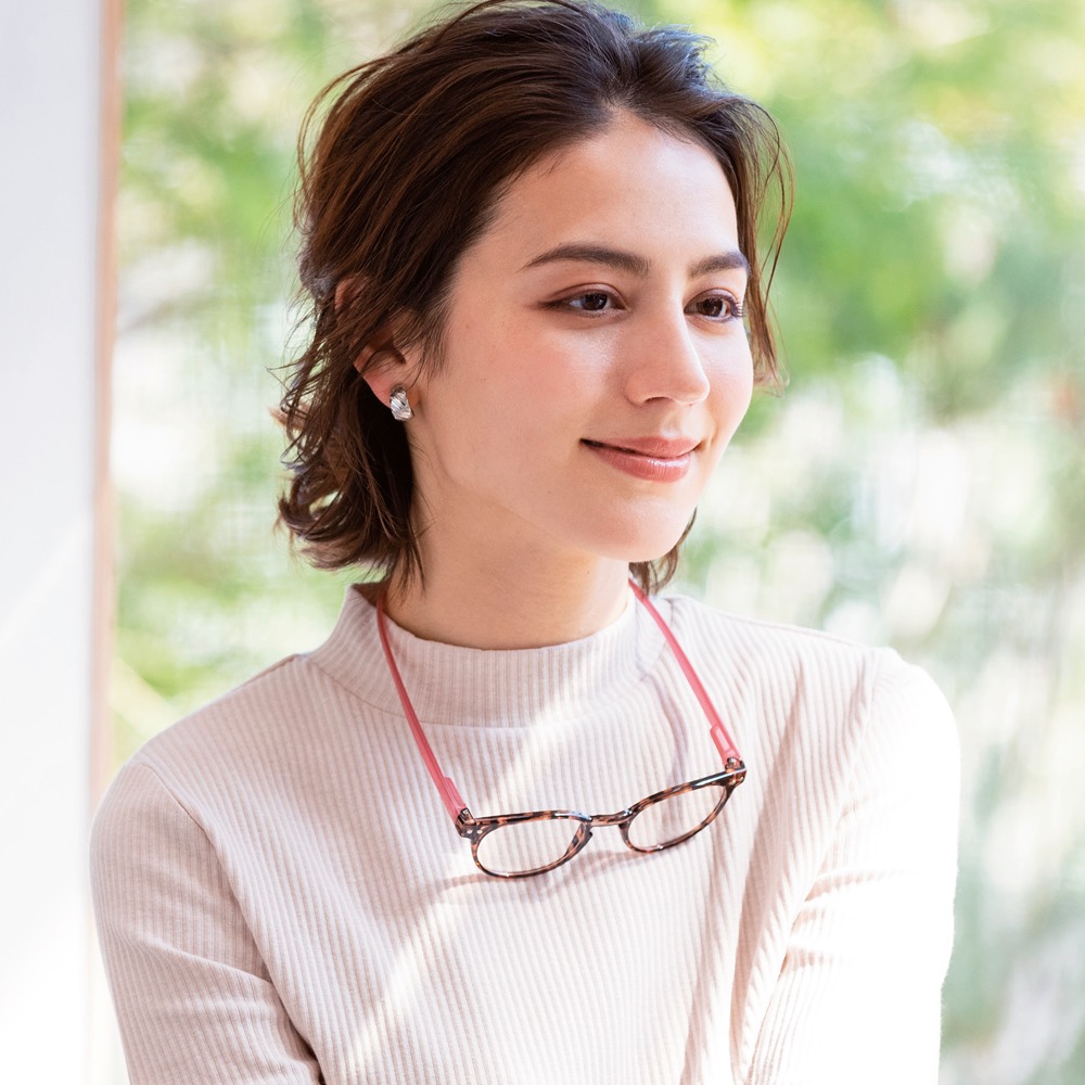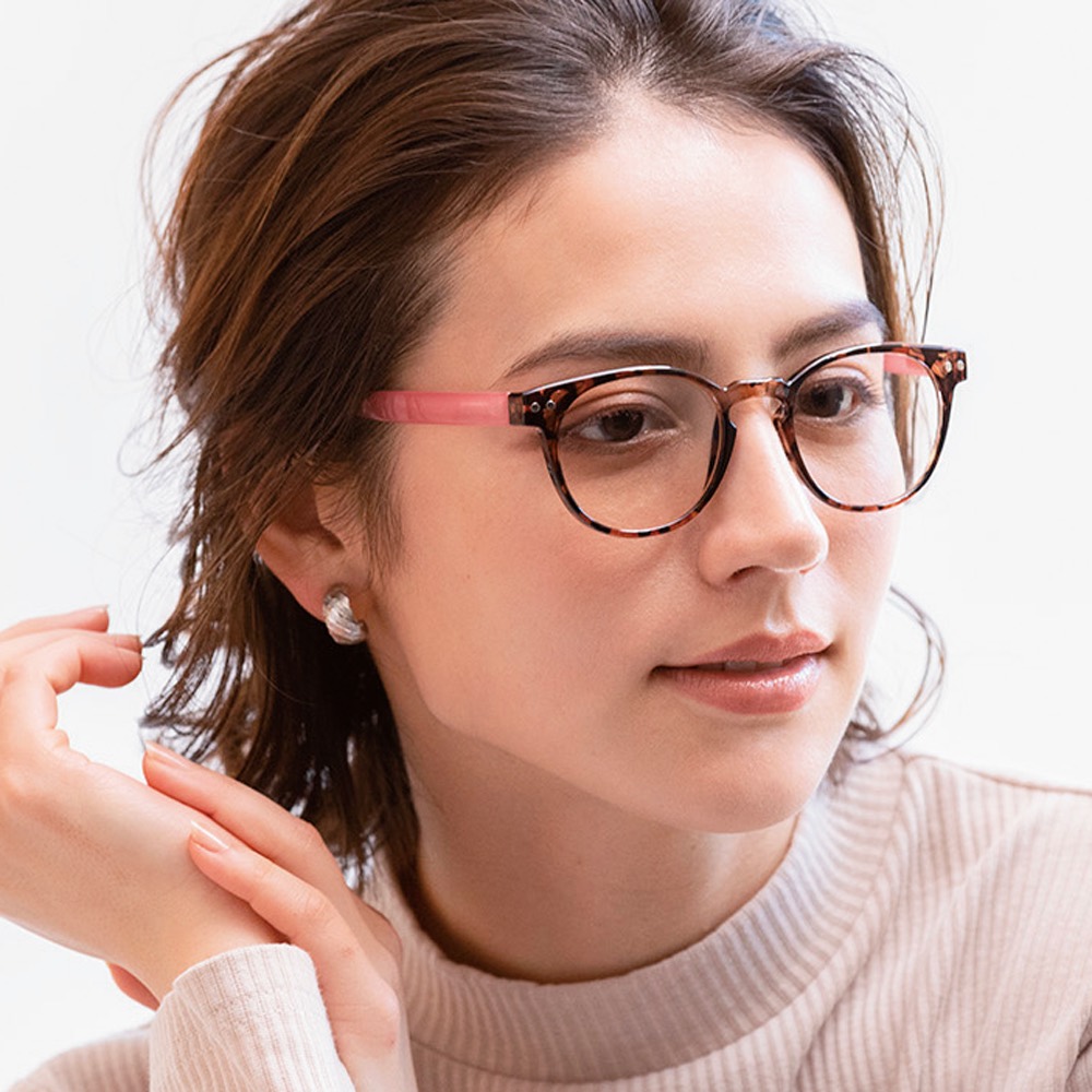 (イ)ピンク×ベッコウ [コーディネート例]見え方の自然なスーパーライトグレーのレンズ。