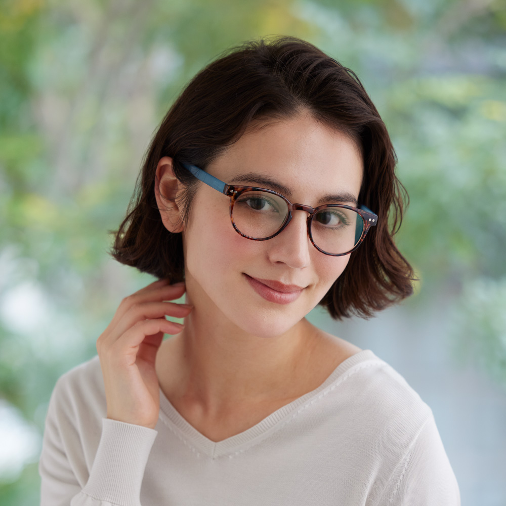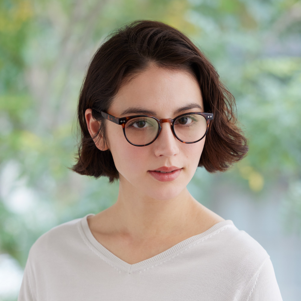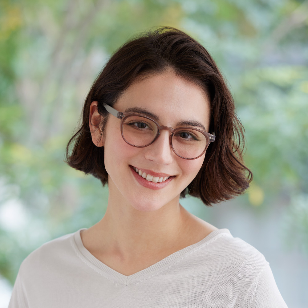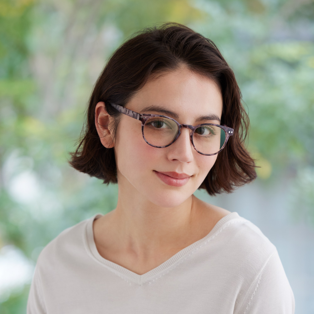 (イ)ピンク×ベッコウ [コーディネート例]見え方の自然なスーパーライトグレーのレンズ。