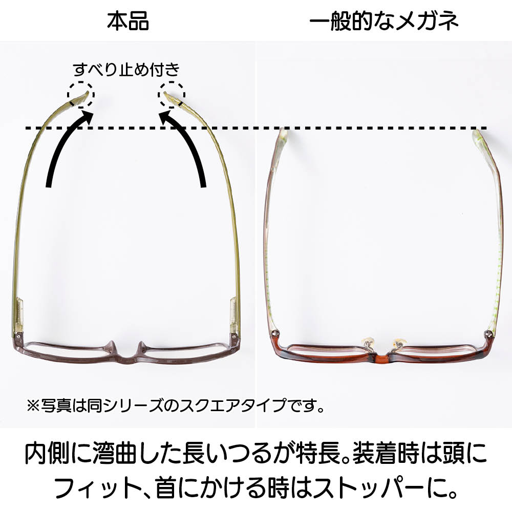 外したらそのまま首へ。リーディンググラスの進化形!掛ける、外すがスムーズにでき、メガネチェーン不要で、わずらわしさからも解放されます。PCメガネとしてご使用しても◎リピーターの方にもおすすめ、トレンドデザインの ボストンフレーム!つるは一般的なメガネより長く、内側に向かって湾曲した形状です。装着すると、頭を包むようにフィット。メガネを外して首にかける時は、このつるがちょうど首に引っ掛かって安定するので、落とすこともなくスマートにキープできます。つるの付け根部分の構造はバネ式になっています。一般的なメガネのつるは外向きには広がりませんが、本品はこのバネの仕組みでつるを左右に広げやすく、つるの先を無理なく首の後ろに持っていくことが可能。使わない時は、首元に。首に掛けられるリーディンググラスリーディンググラスはずっと掛けているものではないので、よく「メガネどこいった?」と失くしがち。ネックリーダーズなら使わない時は首に掛けられるので失くす確率が減り、必要な時にサッとラクに着用できて便利です。