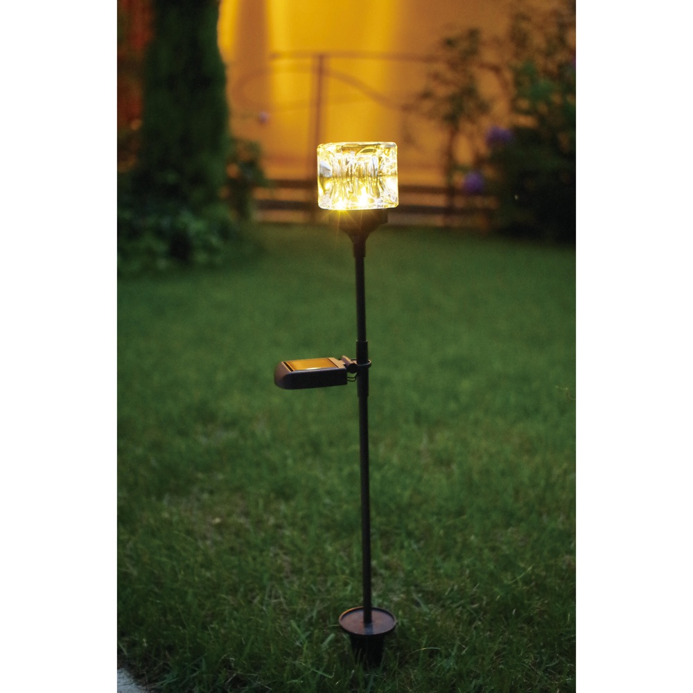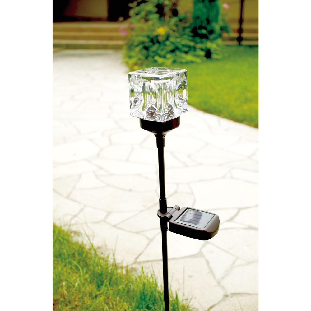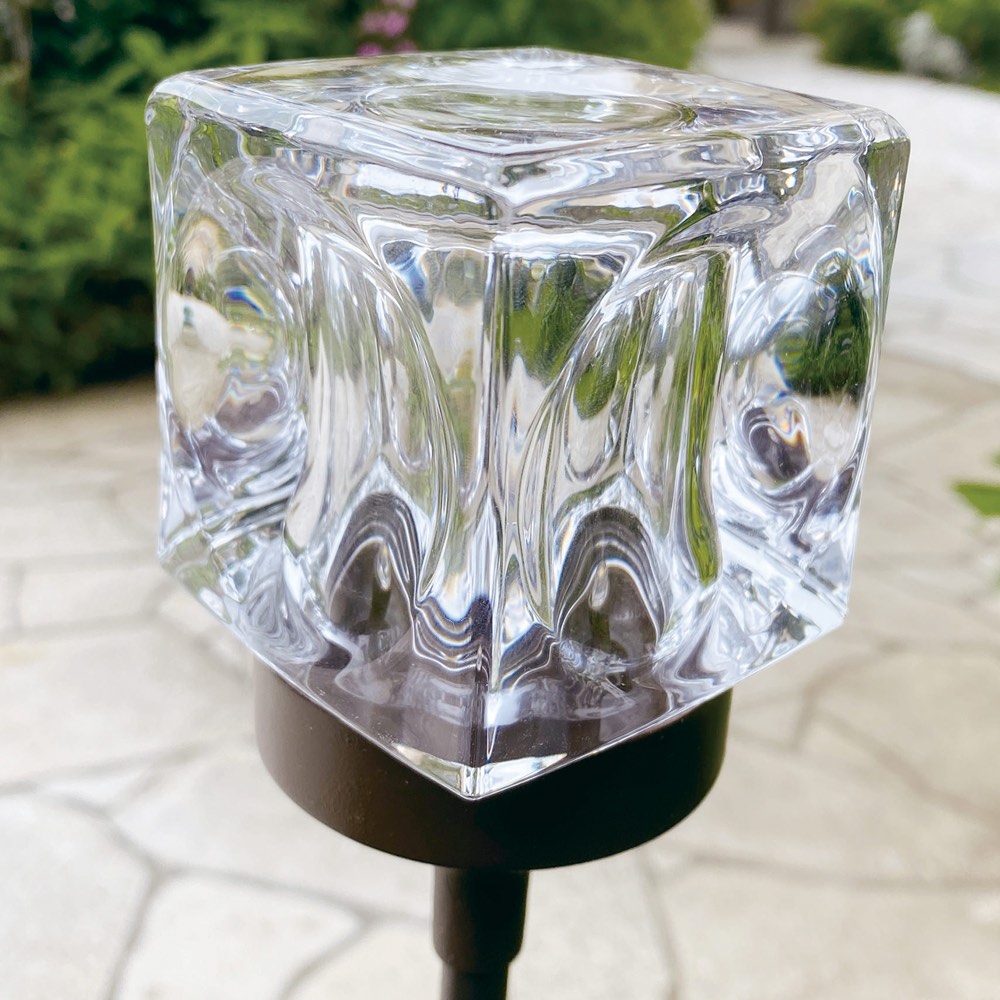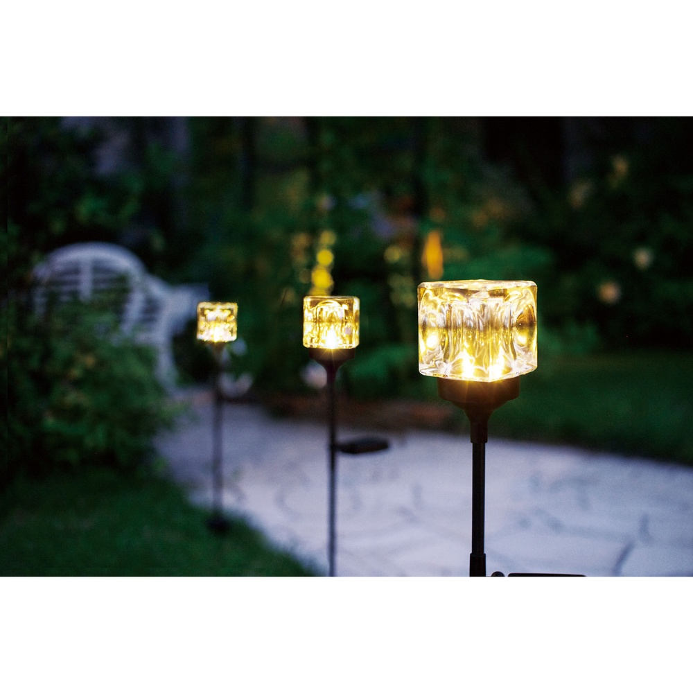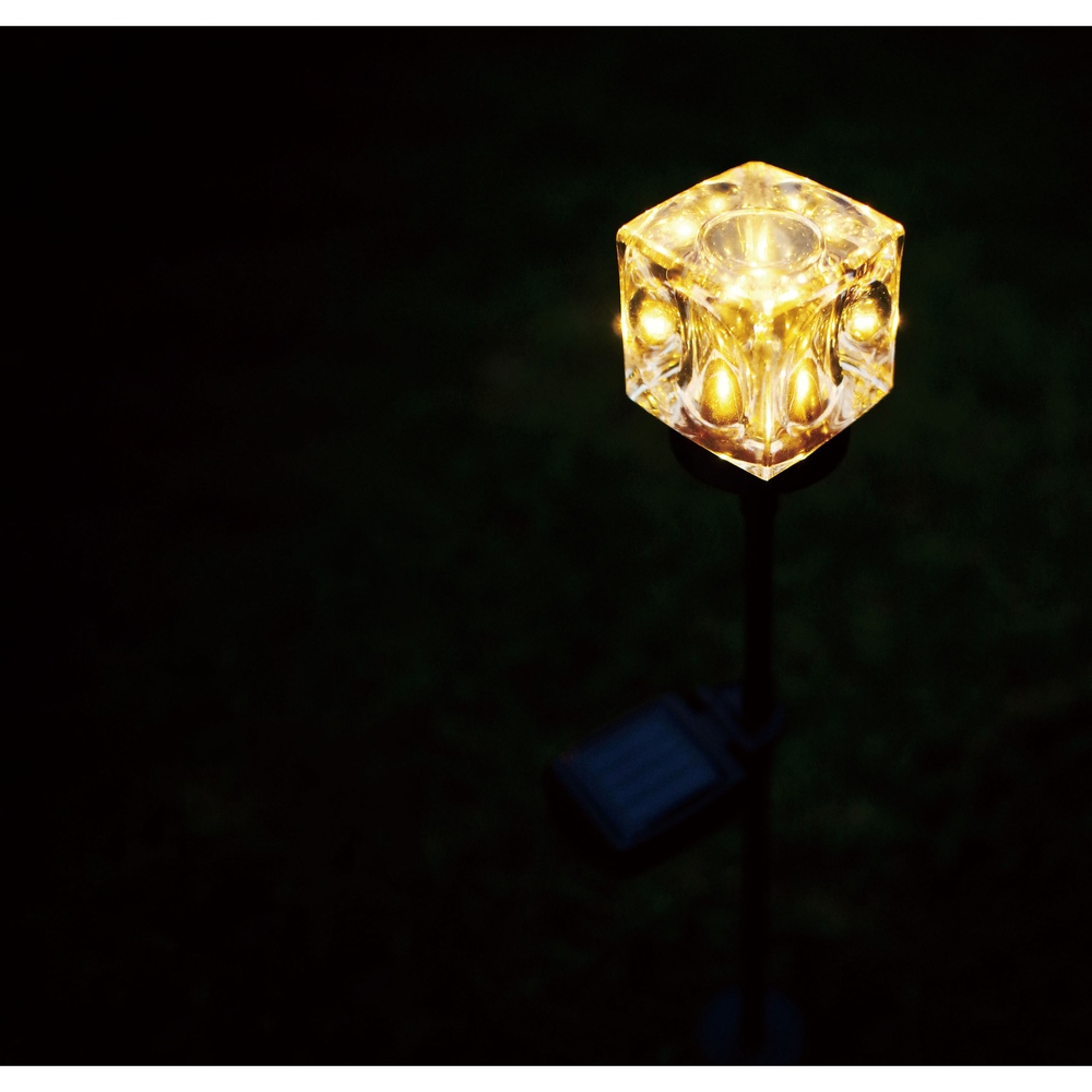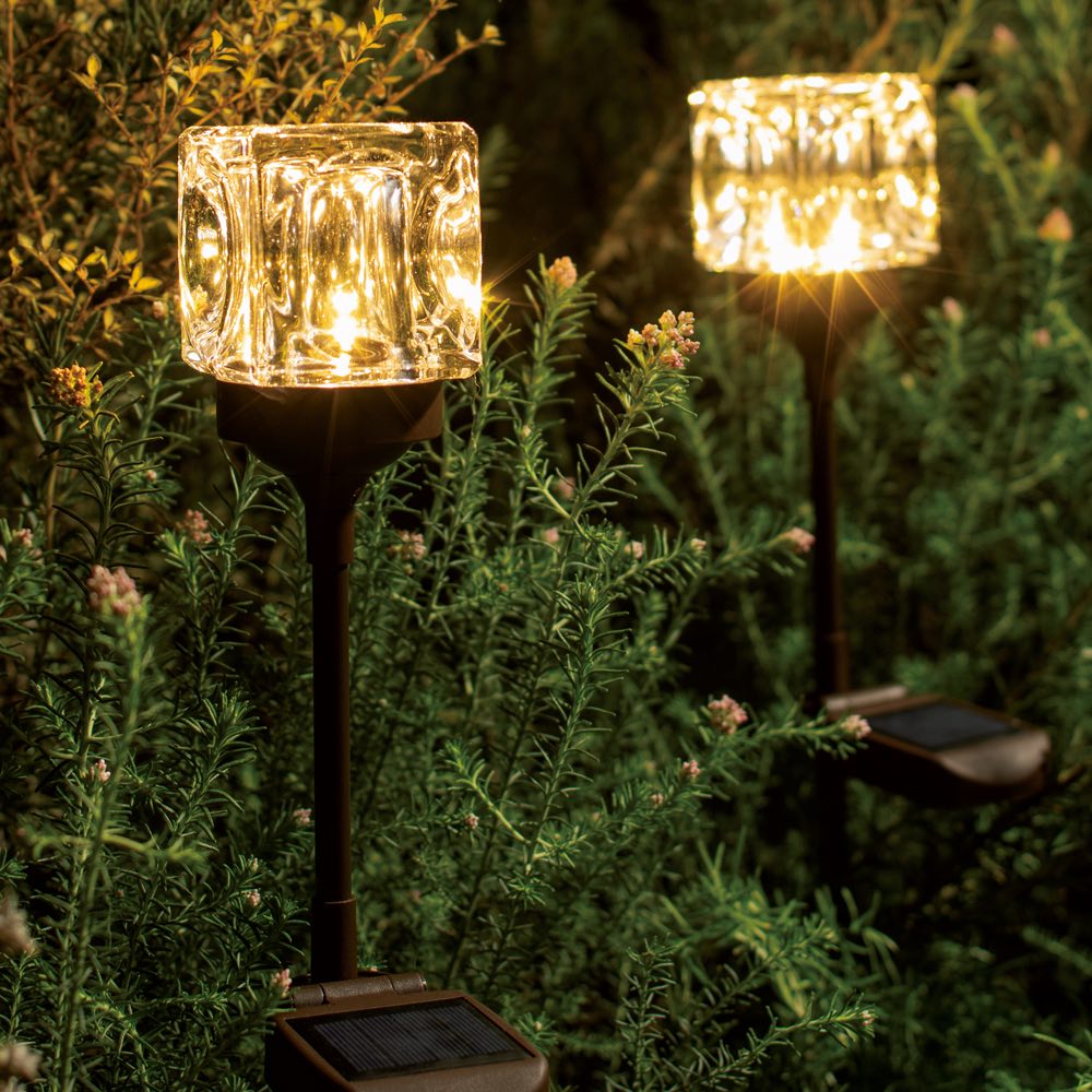 一点一点手作りのガラスシェードが生む、ゴージャスな光の陰影。周囲の植物に合わせて3段階に高さ調節できます。◆キューブ型のガラスにうつる灯が幻想的なソーラーライト。◆太陽光充電式で電源不要、電気代0円。◆お庭やプランターで土に挿して素敵なひかりが揺らぎます。◆周囲の植物に合わせて3段階に高さ調節できます。◆暗くなると自動で点灯し、明るくなると消灯します。◆省電力に優れたLEDライトで優しいひかり。◆2本組でお届けします。◆ベランダのアクセントに。お庭のイルミネーションに。
