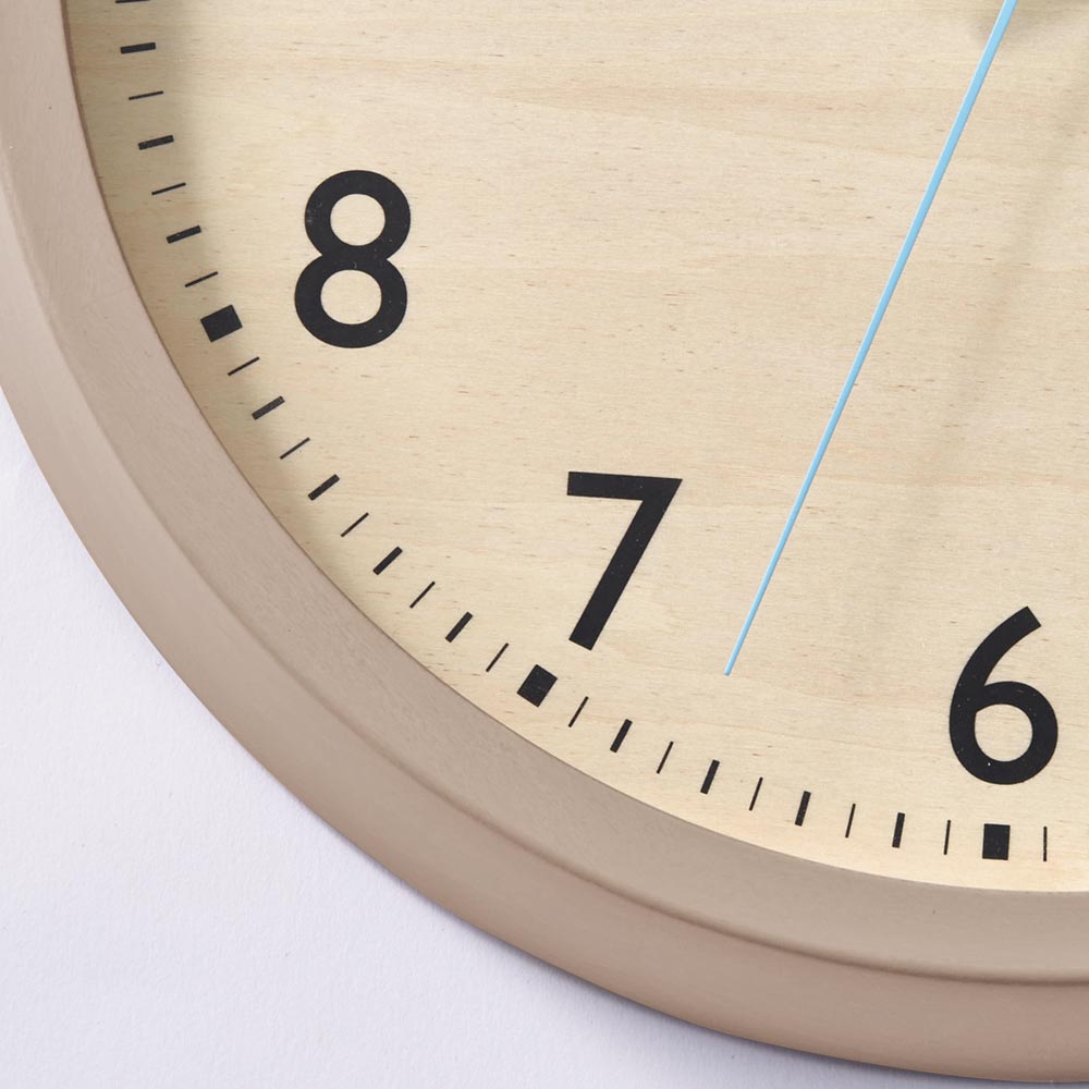 無垢の木材を使用した本体。水色の秒針は北欧の朝露をイメージしたデザインです。