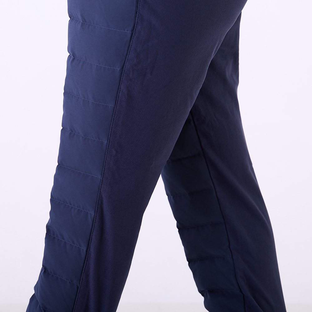 【ウエストゴム】ダウンパンツなのに美シルエットで細見え!これ1枚履きでしっかり防寒!着ぶくれしないダウンパンツ徹底的に冷えたくない日は、前身頃にはダウン、後ろ身頃には裏起毛生地を使用したこちらのパンツで防寒対策を。一枚でしっかりと暖かいから、タイツなどの重ね履き不要でらくちん。前面だけをダウンにしたのは、着膨れせずに美脚ラインを演出するためのこだわりです。■ウエストゴムで着心地ラクちん!■テカリの少ない表面感だからカジュアル過ぎない上品な印象に。