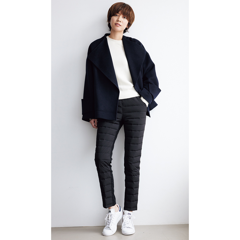 (ア)ブラック 前身はダウン生地、後身は裏起毛素材。サイドの切り替えラインはスッキリ美脚見え!