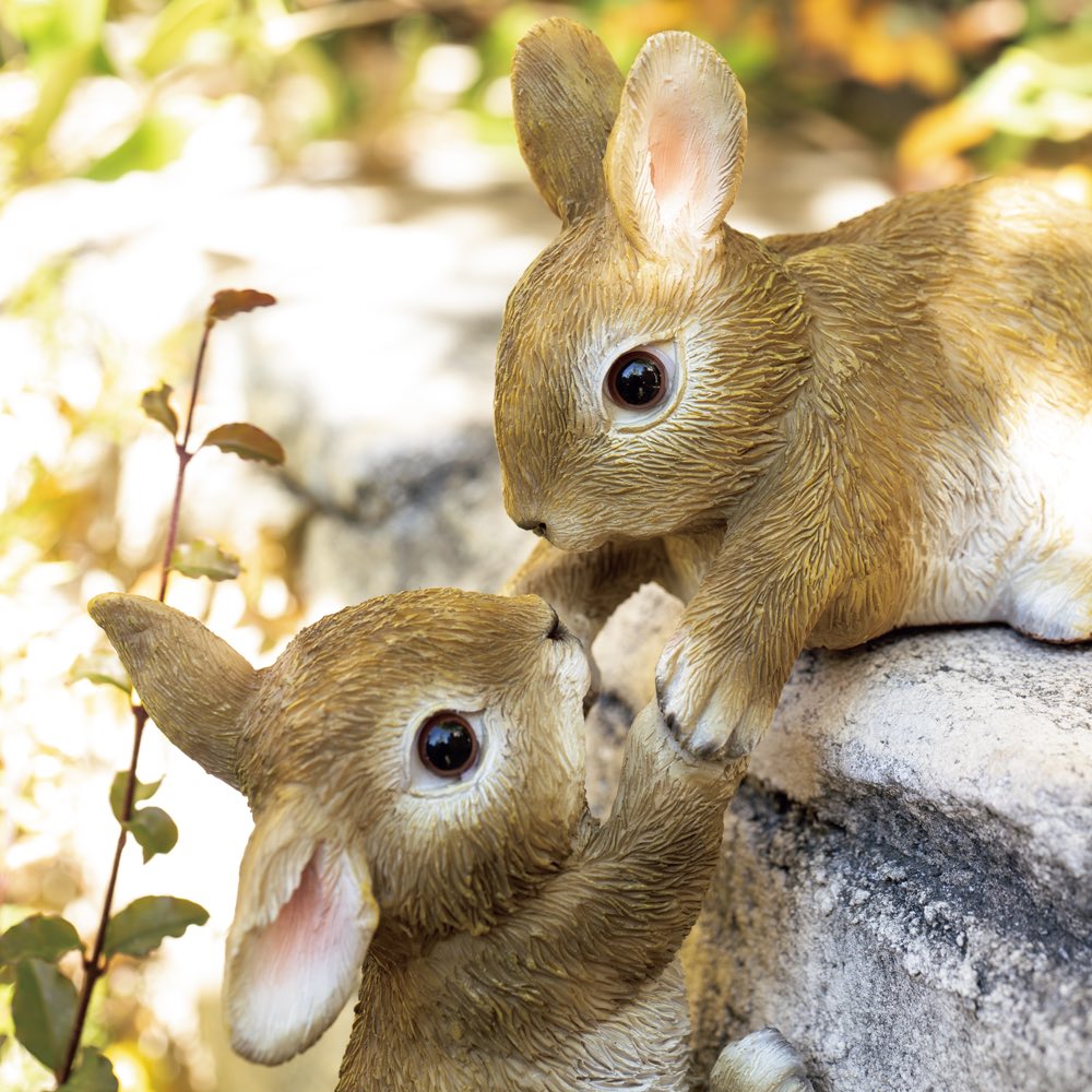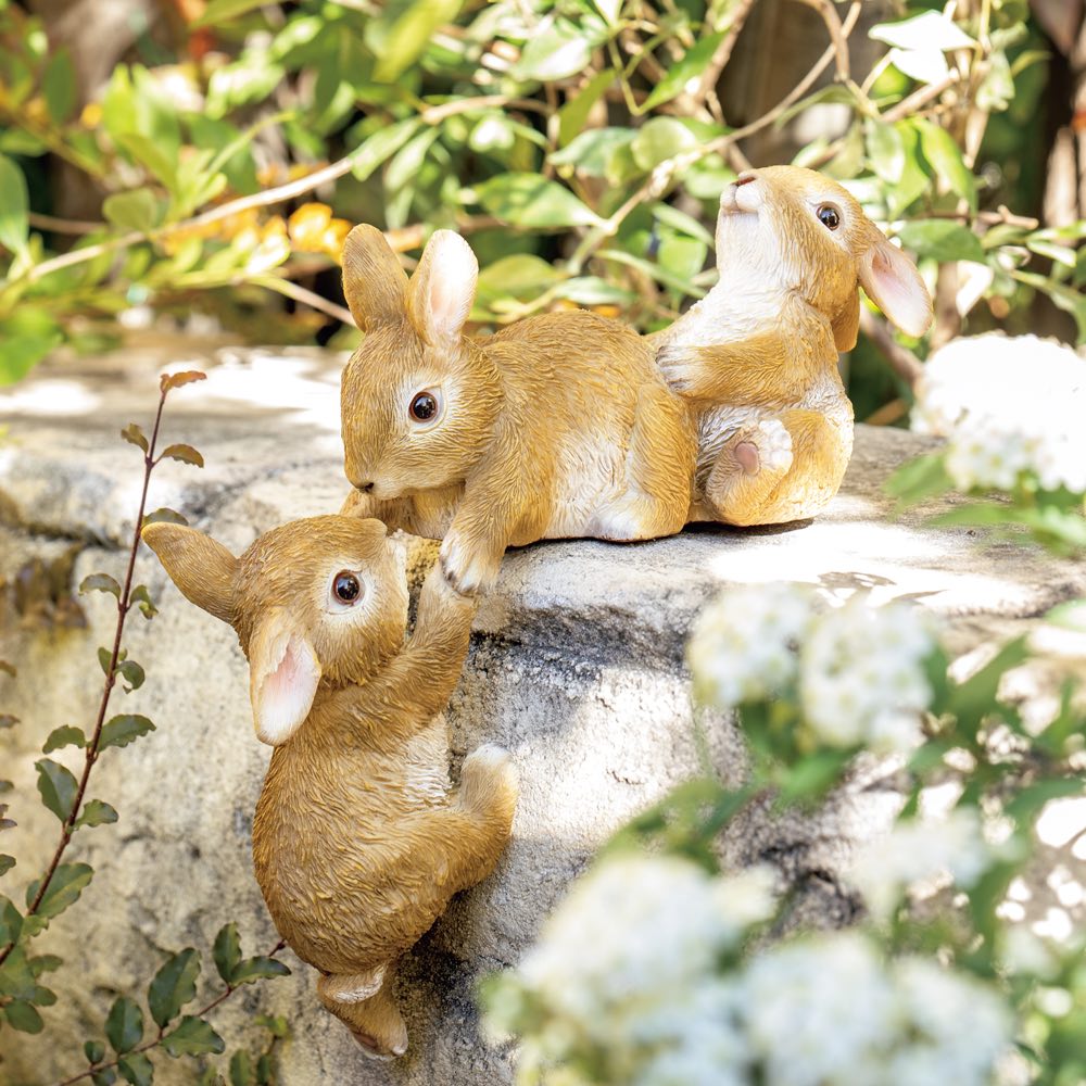 登るのががちょっと苦手なうさぎさんを、一生懸命手助けしている2匹の姿が微笑ましい!段差や塀など、直角の部分に置いてあげて。協力してひっぱりあげようとしている姿は、なんとも愛らしく、ずっと見ていられそう。玄関周りの段差やガーデンのベンチにさりげなく飾れば、ユーモアのセンスが光ります。