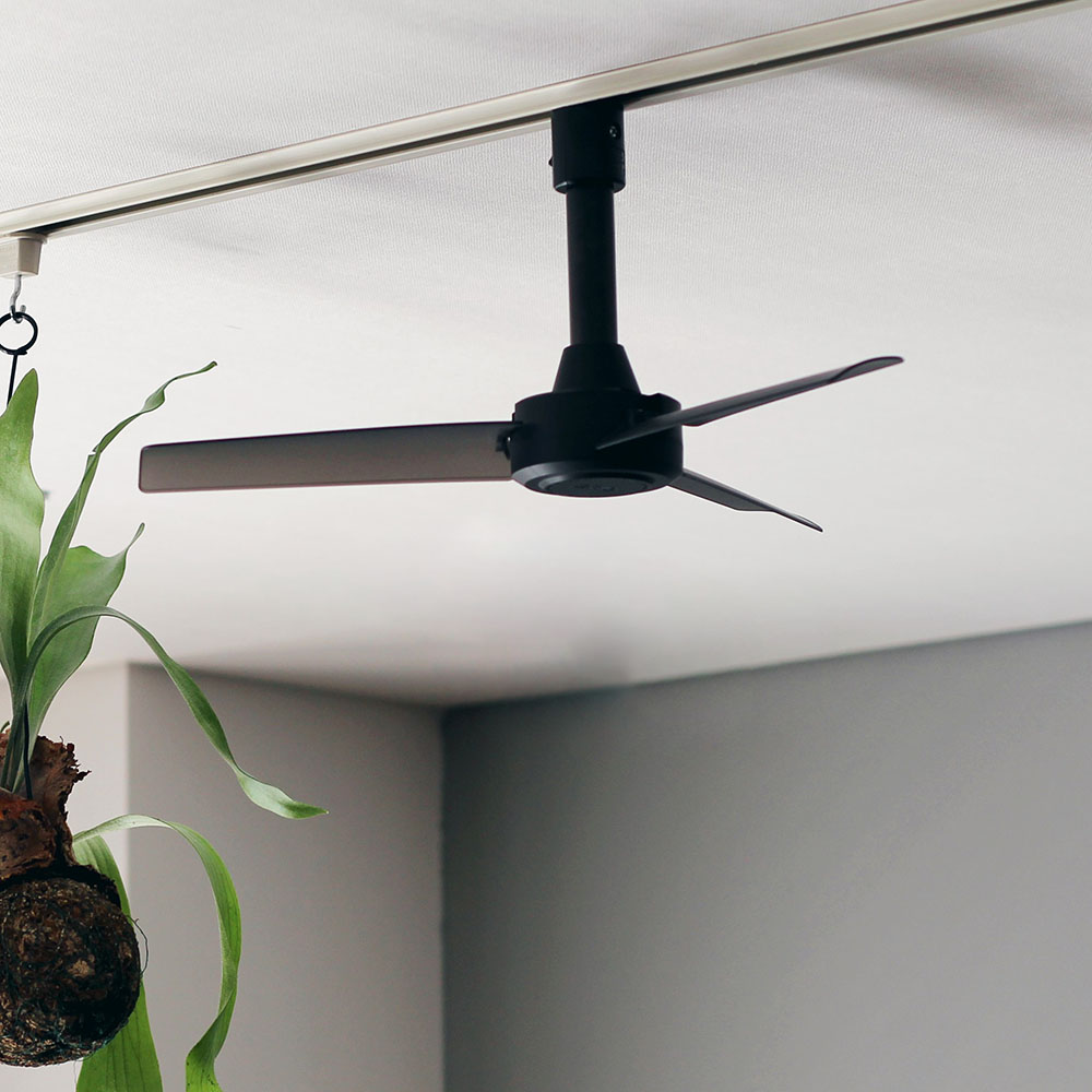 自宅や店舗・事務所の天井にある照明用ダクトレールに取り付けて空気循環を促すダクトレール専用ファンです。DCモーターを搭載し静音性をアップ。リモコン付き。自宅や店舗・事務所の天井にある照明用ダクトレールに取り付けて空気循環を促すダクトレール専用ファン。簡単に取り付けられるので気軽に取り入れて。■DCモーターを搭載し静音性をアップファンにDCモーターを搭載した新モデル。静音性がアップされて、動作時に嬉しい機能です。■ワンタッチで取付、取り外し、リモコンで操作〇取り付け、取り外しはワンタッチ。ダクトレールがあるところにすぐに取り付けが可能です。付属のリモコンで操作が可能なため、使いたいリビングやキッチンからの操作ができます。■径40cmサイズのコンパクト軽量タイプ一般的なシーリングファン(約4kg〜)では取り付けが不安な場所や、トイレなどの個室といった比較的小さめの部屋でも使いやすいアイテムです。