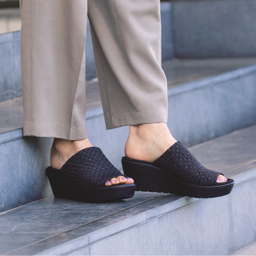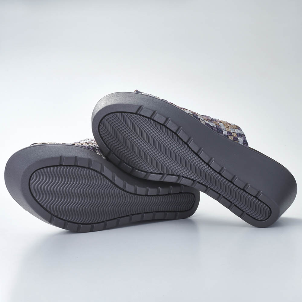 平ゴムとポリエステルテープを組み合わせたメッシュ編みで、履く人の足に沿って伸びます。