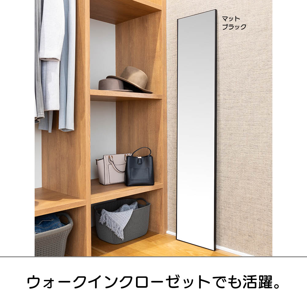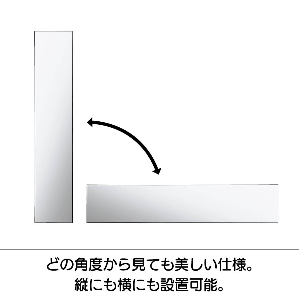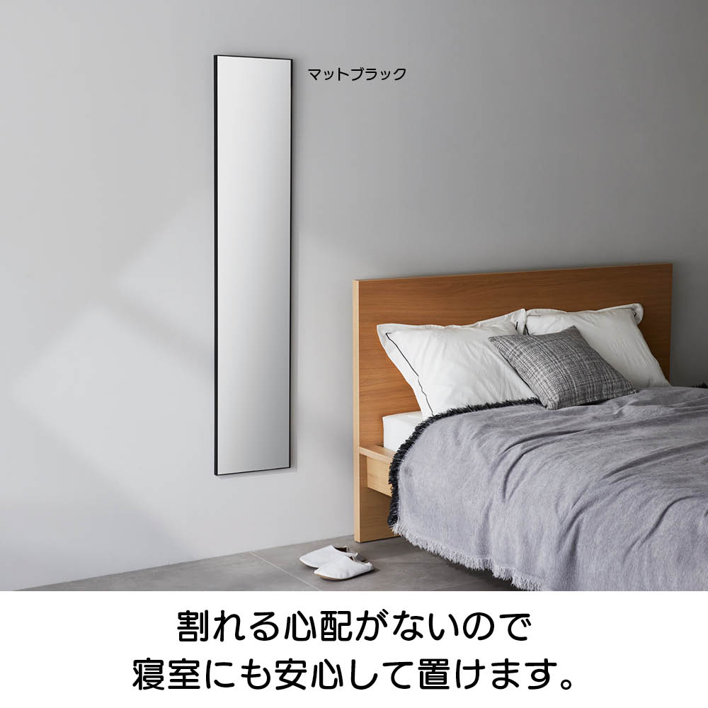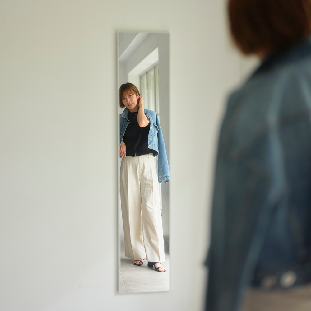 特殊フィルム製で軽く、倒れても割れない、そして鏡よりも映りがクリア。大好評ロングセラーの姿見ミラーが、人気スタイリスト・小山田早織さんとコラボ! さらにおしゃれに、使いやすくなりました。全身がしっかり映り、しかもスリムで場所をとらない30×150cm。人気スタイリスト・小山田早織さんのこだわりが詰まったコラボモデル誕生!仕事柄、長年鏡と向き合い続けてきた小山田さん。大きな鏡は重いし、割れるのも心配……。そんな鏡の弱点を軽々クリアする割れないミラーに感動し、スタイリスト目線で「もっと素敵に!」アレンジしたくなったといいます。特殊フィルムを使い、内部を空洞に仕上げているため、60×150cmの大型サイズで約2.2kgという軽さ!壁掛けの際も壁面に負担がかかりにくく、女性1人でも軽々と移動できます。決して割れないフィルム製なので、ボールなどがぶつかっても大丈夫。子ども部屋にも安心して置けます。万一災害時に倒れても破片が飛び散らず、避難の妨げになることもありません。防災対策としてもおすすめ!40年以上「フィルムミラー」を手掛けている国内メーカーが製造。フィルムは柔らかい素材なので、指で押すと凹みますが、指を離せば元どおりの状態に。一般的な鏡の場合、ガラスの反射で像がブレて映ってしまうことも。割れないミラーは鏡よりもきれいに映ります。高性能フィルム製だからブレや歪みが少なく、対象をくっきり鮮明に映し出します。細部のこだわりでスタイリッシュに。ディノス初の四方枠モデルが誕生!全辺をアルミフレームで覆った四方枠は、ディノスでは初の試み。「スタイリッシュな雰囲気を出すには、4辺をフレームで囲むことが不可欠だと考えました。上下・左右で違うフレームの太さもポイントです」と小山田さん。四方枠になったことで、縦にも横にも設置可能に。アルミフレームの太さは上下と左右で、1mm・5mmとわずかですが、あえて変えています。細やかなデザインの工夫で、より洗練された印象に。ディノスの従来モデル(アルミフレーム)には、上下のフレームがありません。小山田さんとのコラボモデルは4辺すべてをフレームで囲っているので、縦にも横にも設置可能です。すべり止めは透明シールに。どの角度から見ても美しいミラー。従来モデルではゴム脚だったすべり止めを、付属の透明シールに替えたのもこだわり。「ゴム脚を外した時に見えてしまうフレームの穴が気になって……。360度どこから見ても美しくあってほしかったんです」。従来モデルのすべり止めはネジ式のゴム脚のところ、本品は付属の透明シールで対応。フレームにネジ穴がないので、横向きに吊り下げた時もきれいです。