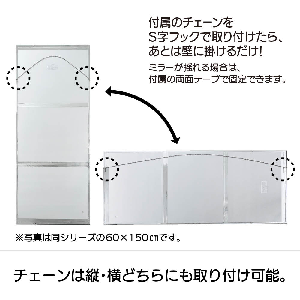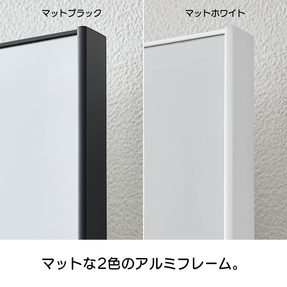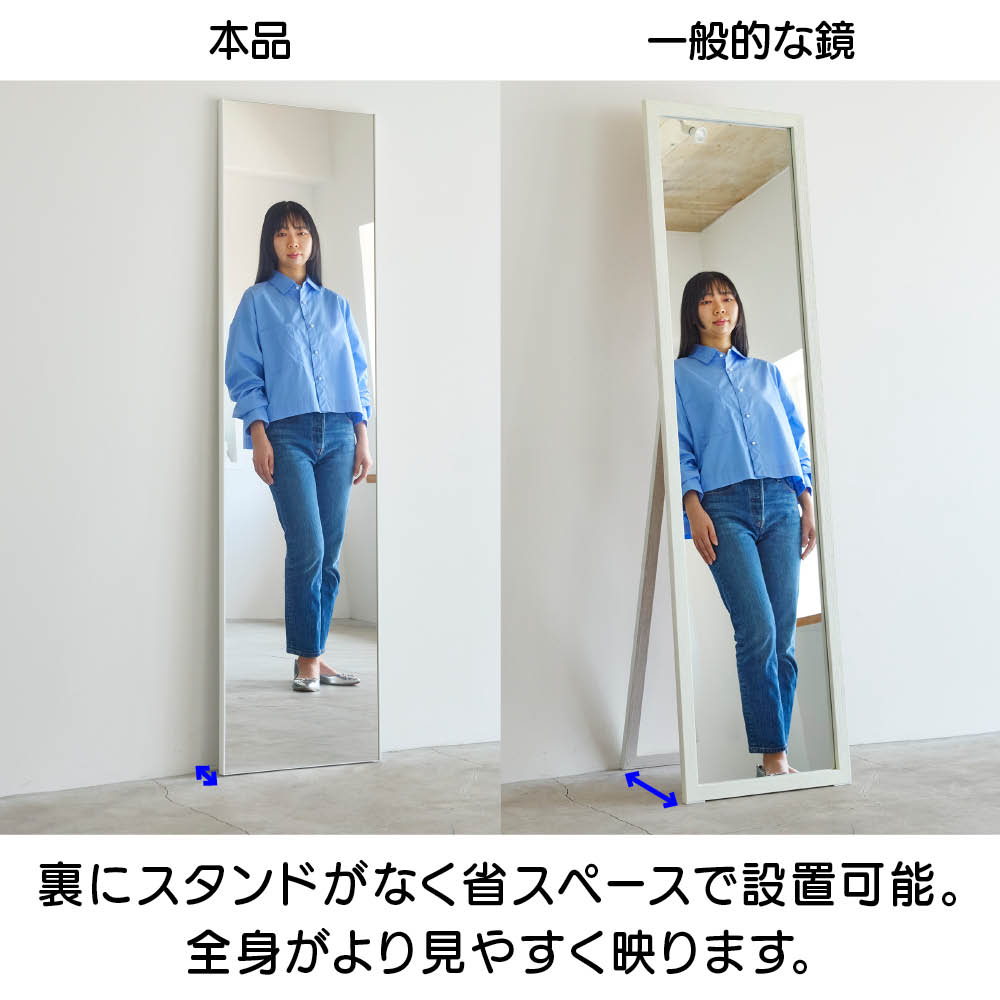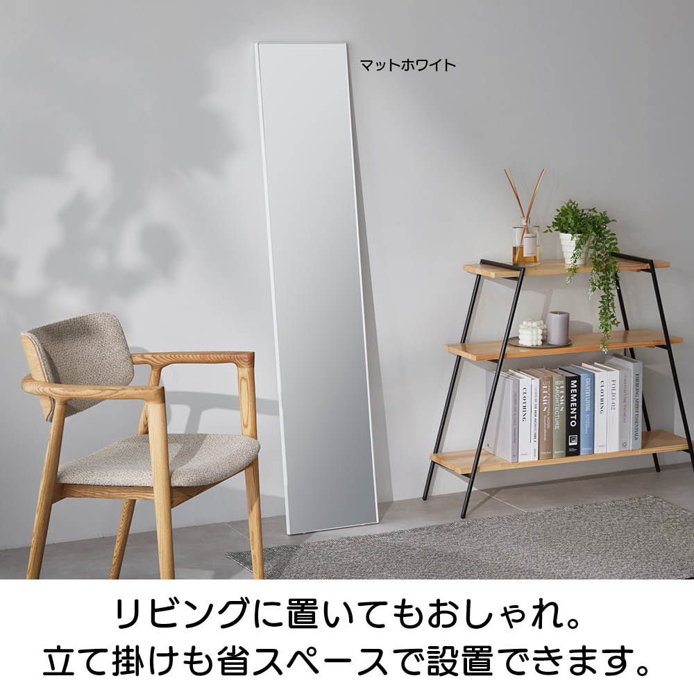 特殊フィルム製で軽く、倒れても割れない、そして鏡よりも映りがクリア。大好評ロングセラーの姿見ミラーが、人気スタイリスト・小山田早織さんとコラボ! さらにおしゃれに、使いやすくなりました。全身がしっかり映り、しかもスリムで場所をとらない30×150cm。人気スタイリスト・小山田早織さんのこだわりが詰まったコラボモデル誕生!仕事柄、長年鏡と向き合い続けてきた小山田さん。大きな鏡は重いし、割れるのも心配……。そんな鏡の弱点を軽々クリアする割れないミラーに感動し、スタイリスト目線で「もっと素敵に!」アレンジしたくなったといいます。特殊フィルムを使い、内部を空洞に仕上げているため、60×150cmの大型サイズで約2.2kgという軽さ!壁掛けの際も壁面に負担がかかりにくく、女性1人でも軽々と移動できます。決して割れないフィルム製なので、ボールなどがぶつかっても大丈夫。子ども部屋にも安心して置けます。万一災害時に倒れても破片が飛び散らず、避難の妨げになることもありません。防災対策としてもおすすめ!40年以上「フィルムミラー」を手掛けている国内メーカーが製造。フィルムは柔らかい素材なので、指で押すと凹みますが、指を離せば元どおりの状態に。一般的な鏡の場合、ガラスの反射で像がブレて映ってしまうことも。割れないミラーは鏡よりもきれいに映ります。高性能フィルム製だからブレや歪みが少なく、対象をくっきり鮮明に映し出します。細部のこだわりでスタイリッシュに。ディノス初の四方枠モデルが誕生!全辺をアルミフレームで覆った四方枠は、ディノスでは初の試み。「スタイリッシュな雰囲気を出すには、4辺をフレームで囲むことが不可欠だと考えました。上下・左右で違うフレームの太さもポイントです」と小山田さん。四方枠になったことで、縦にも横にも設置可能に。アルミフレームの太さは上下と左右で、1mm・5mmとわずかですが、あえて変えています。細やかなデザインの工夫で、より洗練された印象に。ディノスの従来モデル(アルミフレーム)には、上下のフレームがありません。小山田さんとのコラボモデルは4辺すべてをフレームで囲っているので、縦にも横にも設置可能です。すべり止めは透明シールに。どの角度から見ても美しいミラー。従来モデルではゴム脚だったすべり止めを、付属の透明シールに替えたのもこだわり。「ゴム脚を外した時に見えてしまうフレームの穴が気になって……。360度どこから見ても美しくあってほしかったんです」。従来モデルのすべり止めはネジ式のゴム脚のところ、本品は付属の透明シールで対応。フレームにネジ穴がないので、横向きに吊り下げた時もきれいです。