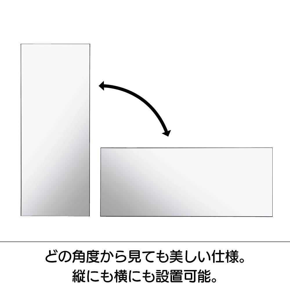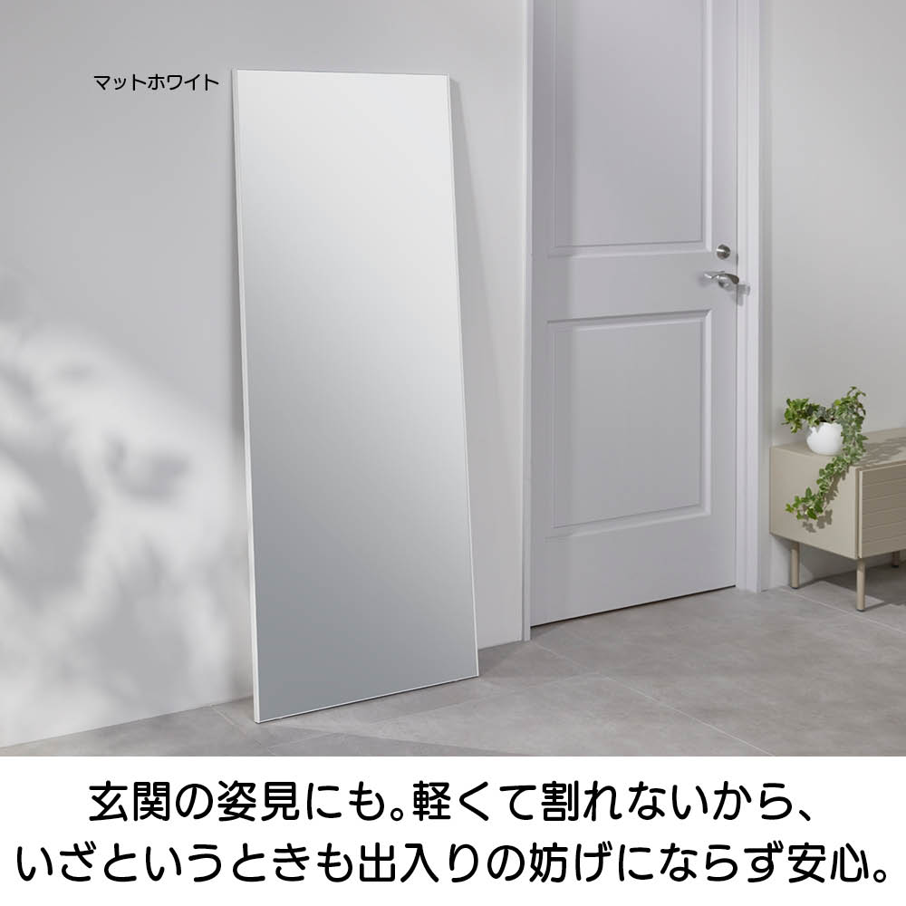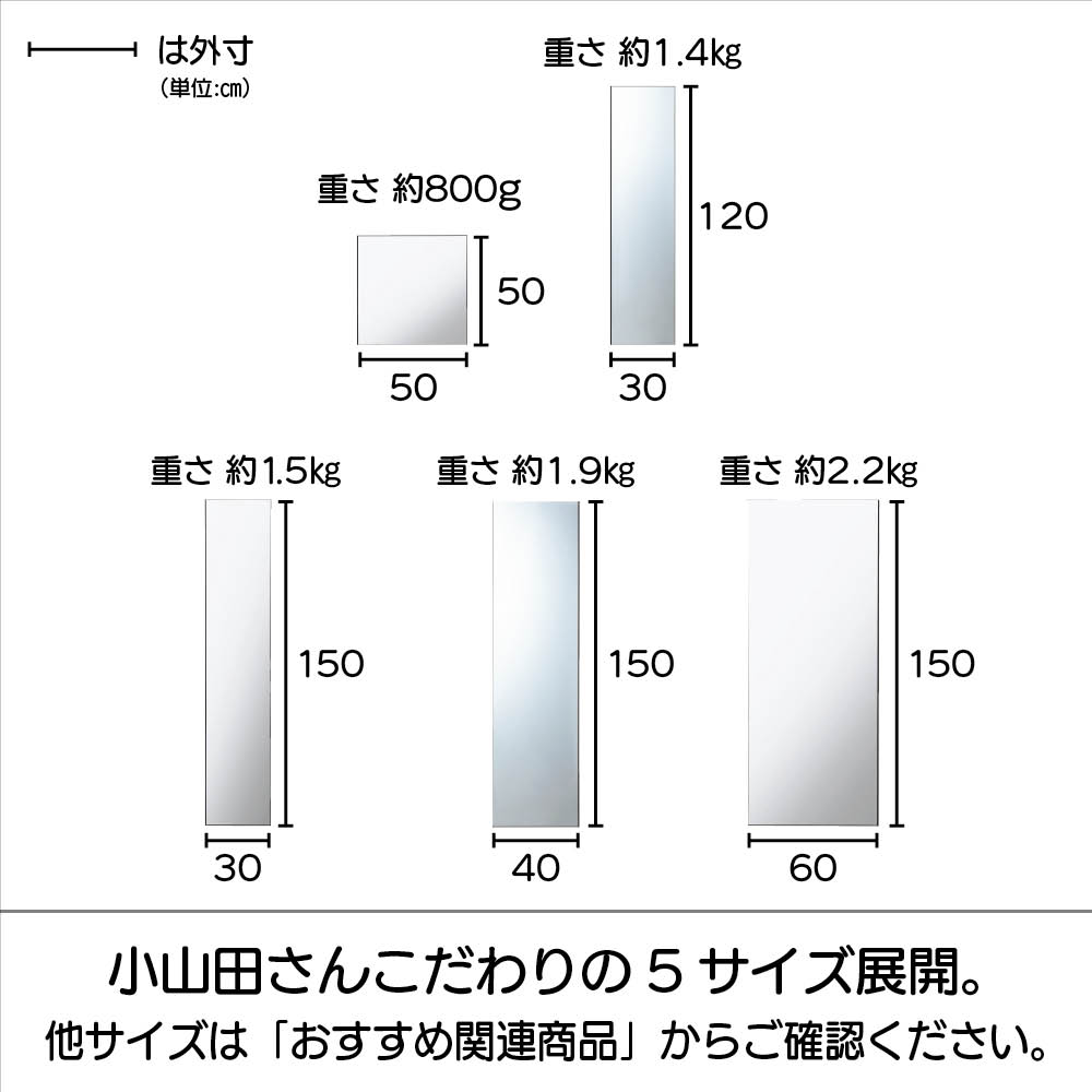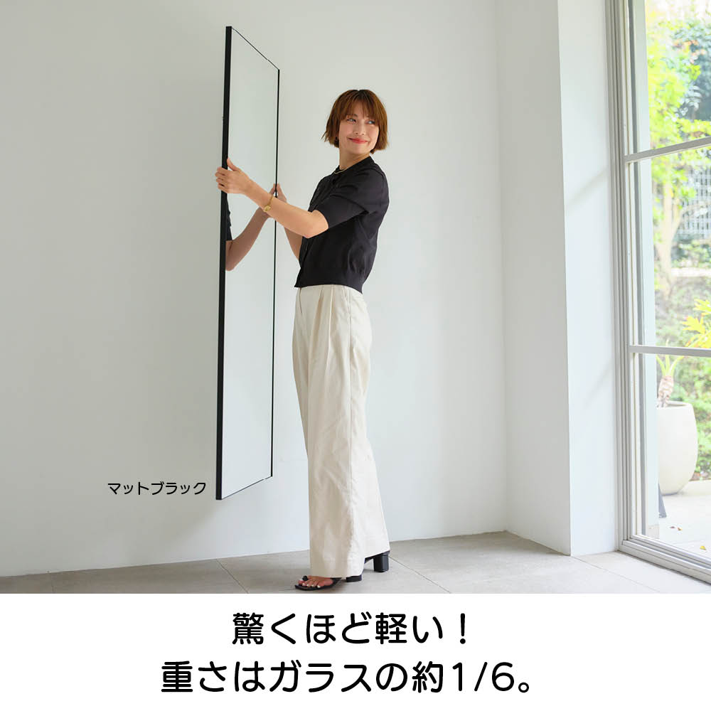 特殊フィルム製で軽く、倒れても割れない、そして鏡よりも映りがクリア。大好評ロングセラーの姿見ミラーが、人気スタイリスト・小山田早織さんとコラボ! さらにおしゃれに、使いやすくなりました。全身がしっかり映り、空間を広々と見せる60×150cm。人気スタイリスト・小山田早織さんのこだわりが詰まったコラボモデル誕生!仕事柄、長年鏡と向き合い続けてきた小山田さん。大きな鏡は重いし、割れるのも心配……。そんな鏡の弱点を軽々クリアする割れないミラーに感動し、スタイリスト目線で「もっと素敵に!」アレンジしたくなったといいます。特殊フィルムを使い、内部を空洞に仕上げているため、60×150cmの大型サイズで約2.2kgという軽さ!壁掛けの際も壁面に負担がかかりにくく、女性1人でも軽々と移動できます。決して割れないフィルム製なので、ボールなどがぶつかっても大丈夫。子ども部屋にも安心して置けます。万一災害時に倒れても破片が飛び散らず、避難の妨げになることもありません。防災対策としてもおすすめ!40年以上「フィルムミラー」を手掛けている国内メーカーが製造。フィルムは柔らかい素材なので、指で押すと凹みますが、指を離せば元どおりの状態に。一般的な鏡の場合、ガラスの反射で像がブレて映ってしまうことも。割れないミラーは鏡よりもきれいに映ります。高性能フィルム製だからブレや歪みが少なく、対象をくっきり鮮明に映し出します。細部のこだわりでスタイリッシュに。ディノス初の四方枠モデルが誕生!全辺をアルミフレームで覆った四方枠は、ディノスでは初の試み。「スタイリッシュな雰囲気を出すには、4辺をフレームで囲むことが不可欠だと考えました。上下・左右で違うフレームの太さもポイントです」と小山田さん。四方枠になったことで、縦にも横にも設置可能に。アルミフレームの太さは上下と左右で、1mm・5mmとわずかですが、あえて変えています。細やかなデザインの工夫で、より洗練された印象に。ディノスの従来モデル(アルミフレーム)には、上下のフレームがありません。小山田さんとのコラボモデルは4辺すべてをフレームで囲っているので、縦にも横にも設置可能です。すべり止めは透明シールに。どの角度から見ても美しいミラー。従来モデルではゴム脚だったすべり止めを、付属の透明シールに替えたのもこだわり。「ゴム脚を外した時に見えてしまうフレームの穴が気になって……。360度どこから見ても美しくあってほしかったんです」。従来モデルのすべり止めはネジ式のゴム脚のところ、本品は付属の透明シールで対応。フレームにネジ穴がないので、横向きに吊り下げた時もきれいです。