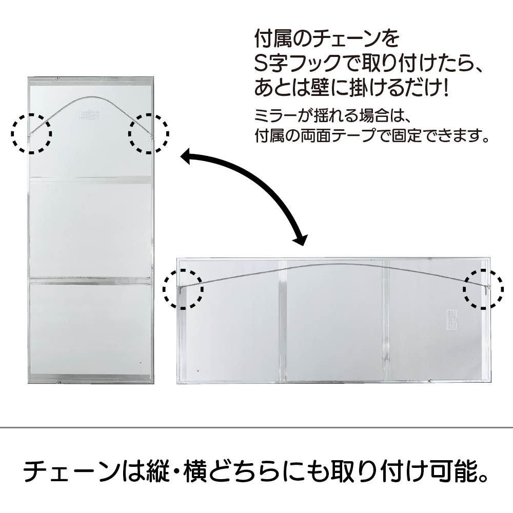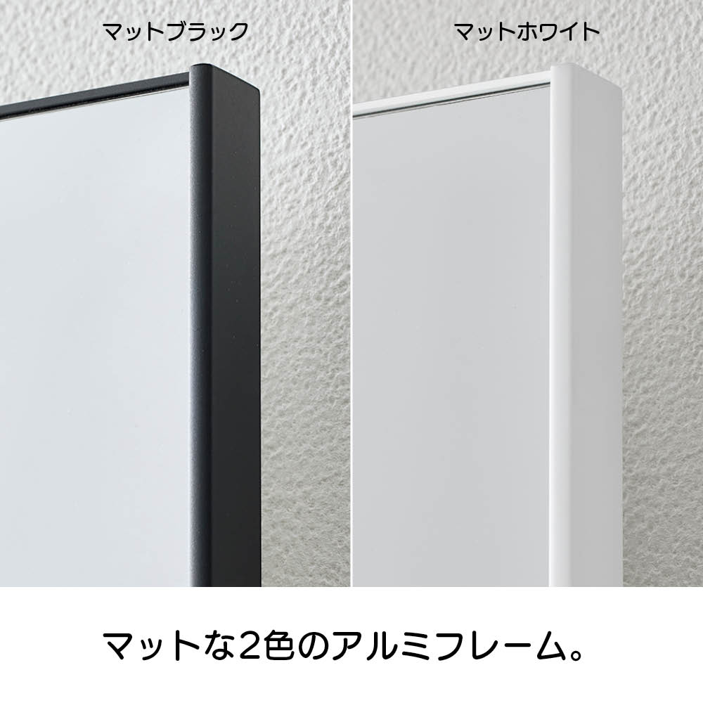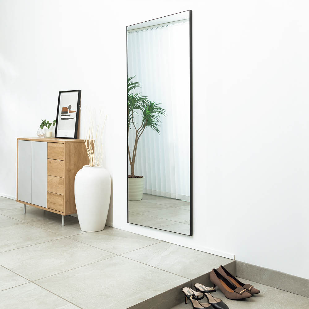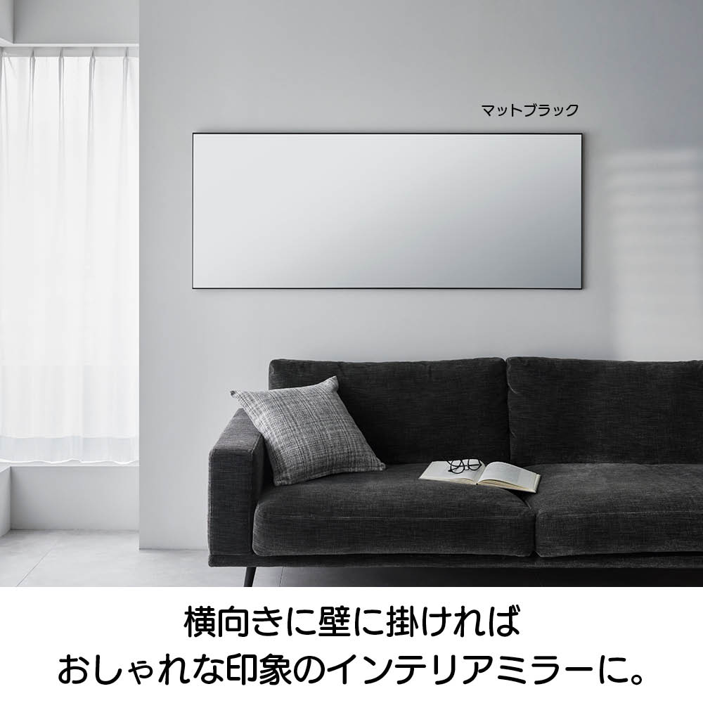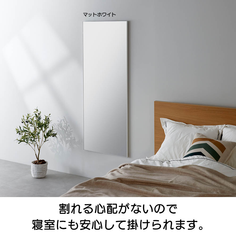 特殊フィルム製で軽く、倒れても割れない、そして鏡よりも映りがクリア。大好評ロングセラーの姿見ミラーが、人気スタイリスト・小山田早織さんとコラボ! さらにおしゃれに、使いやすくなりました。全身がしっかり映り、空間を広々と見せる60×150cm。人気スタイリスト・小山田早織さんのこだわりが詰まったコラボモデル誕生!仕事柄、長年鏡と向き合い続けてきた小山田さん。大きな鏡は重いし、割れるのも心配……。そんな鏡の弱点を軽々クリアする割れないミラーに感動し、スタイリスト目線で「もっと素敵に!」アレンジしたくなったといいます。特殊フィルムを使い、内部を空洞に仕上げているため、60×150cmの大型サイズで約2.2kgという軽さ!壁掛けの際も壁面に負担がかかりにくく、女性1人でも軽々と移動できます。決して割れないフィルム製なので、ボールなどがぶつかっても大丈夫。子ども部屋にも安心して置けます。万一災害時に倒れても破片が飛び散らず、避難の妨げになることもありません。防災対策としてもおすすめ!40年以上「フィルムミラー」を手掛けている国内メーカーが製造。フィルムは柔らかい素材なので、指で押すと凹みますが、指を離せば元どおりの状態に。一般的な鏡の場合、ガラスの反射で像がブレて映ってしまうことも。割れないミラーは鏡よりもきれいに映ります。高性能フィルム製だからブレや歪みが少なく、対象をくっきり鮮明に映し出します。細部のこだわりでスタイリッシュに。ディノス初の四方枠モデルが誕生!全辺をアルミフレームで覆った四方枠は、ディノスでは初の試み。「スタイリッシュな雰囲気を出すには、4辺をフレームで囲むことが不可欠だと考えました。上下・左右で違うフレームの太さもポイントです」と小山田さん。四方枠になったことで、縦にも横にも設置可能に。アルミフレームの太さは上下と左右で、1mm・5mmとわずかですが、あえて変えています。細やかなデザインの工夫で、より洗練された印象に。ディノスの従来モデル(アルミフレーム)には、上下のフレームがありません。小山田さんとのコラボモデルは4辺すべてをフレームで囲っているので、縦にも横にも設置可能です。すべり止めは透明シールに。どの角度から見ても美しいミラー。従来モデルではゴム脚だったすべり止めを、付属の透明シールに替えたのもこだわり。「ゴム脚を外した時に見えてしまうフレームの穴が気になって……。360度どこから見ても美しくあってほしかったんです」。従来モデルのすべり止めはネジ式のゴム脚のところ、本品は付属の透明シールで対応。フレームにネジ穴がないので、横向きに吊り下げた時もきれいです。