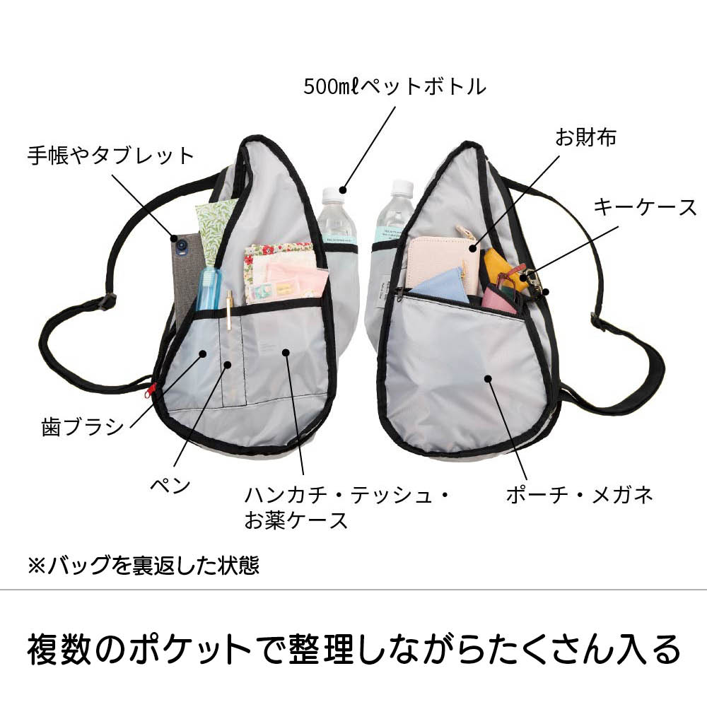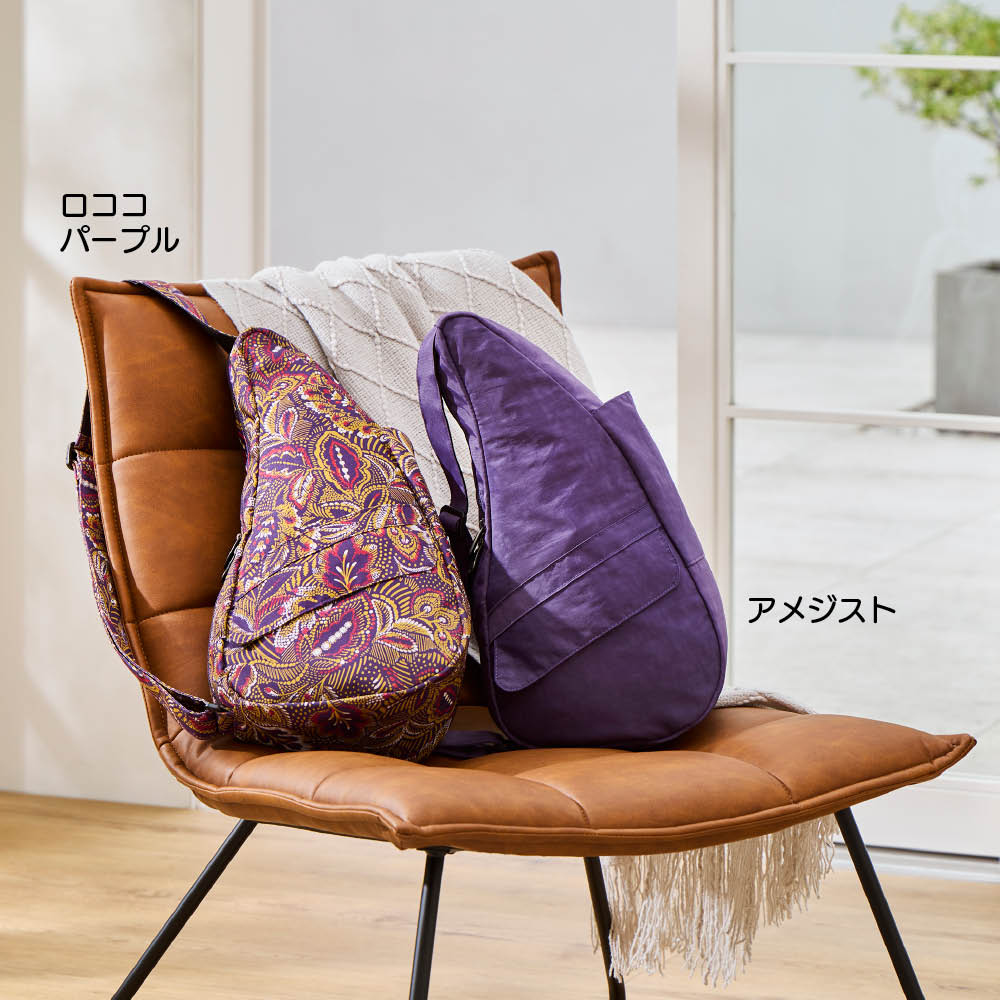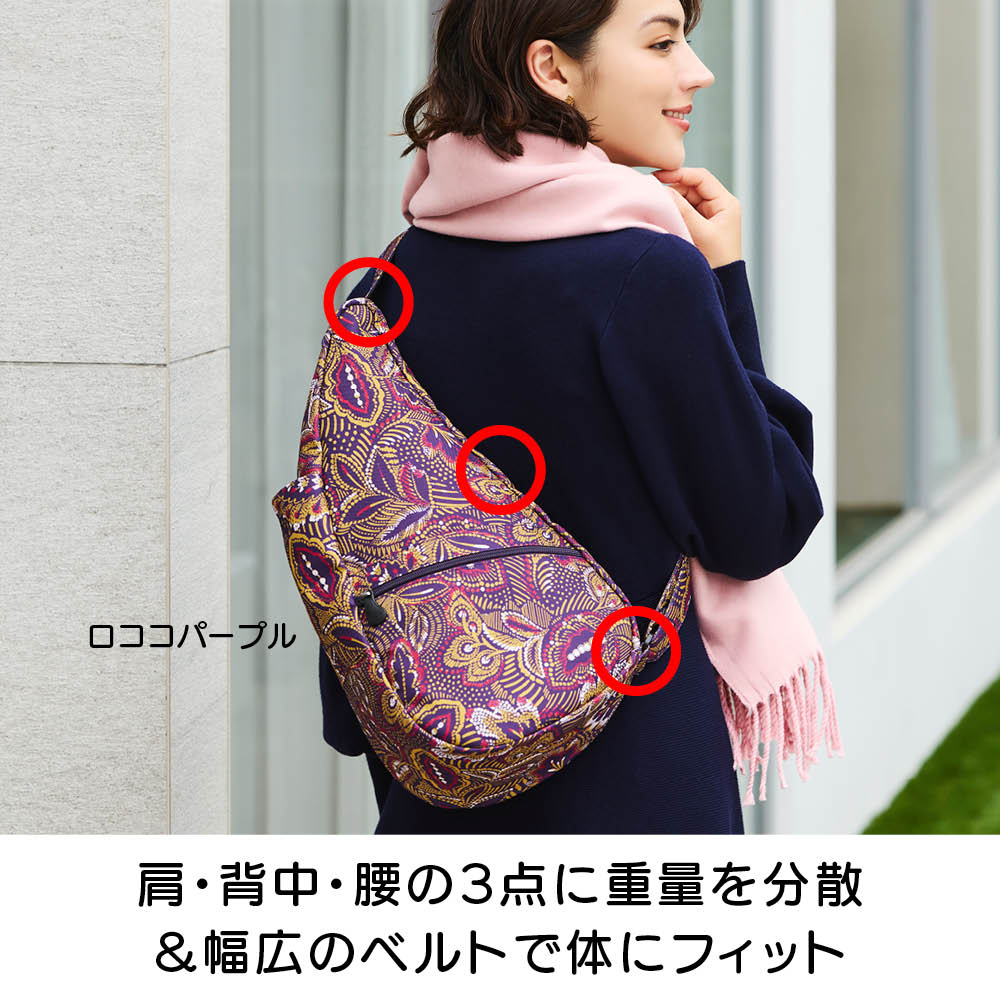新柄続々登場! 長時間でも体に負担をかけないロングセラーのバッグ柄で魅せる、2025年秋冬の新柄「ロココブルー」と「ロココパープル」登場!人気のヘルシーバックバッグに、大人かわいいロココ調プリントが仲間入り。デニムのように爽やかな「ロココブルー」は、カジュアルな装いにぴったり。シックで上品な「ロココパープル」は、ワンピースにも映える絶妙カラーが魅力です。ヘルシーバックバッグのいちばんの特長は、しずく型の独特なフォルム人間工学に基づいた独特のフォルムが体のラインにフィット。肩に集中しがちな重さを、肩、背中、腰の3点に分散するから、疲れにくいです。肩のストラップの内側には滑り止め付きで、どちらの肩で背負ってもしっかりフィットします。ストラップを長くして斜めにかければよりフィット感がアップ。「実際の重さよりも軽く感じる」というお声もいただいています。複数のポケットで整理しながらたくさん入るバッグ内部にはオープンポケット4カ所をはじめ、ペットボトルホルダーやペンスロット、キーリングなど、複数のポケット&機能を配置。ものの定位置を分けて収納できるので、取り出したいものをパッと取り出せる使い勝手の良さも魅力です。ガバッと開くクッションポケットには、タブレットなど壊れやすいものなどを入れるのにもぴったり。斜め掛けのままパッと取り出せる!便利な5ポケット付き表面には、マグネット仕様のポケットを初め、5つのポケットがあるので、出し入れの多いものはここに。ものを出し入れしたい時は背負ったままクルッと前にバッグをぐるっと前に回せば、肩に掛けたままでも簡単にものを取り出せるのも、使い勝手の良いポイント。また、どのような背負い方をしても、中央のファスナーが身体側にくることで、防犯面でもうれしい設計です。教科書の持ち帰りで腰を痛めたアメリカの元教師が、整形外科医と開発アメリカのとある女性教師が背中を痛めたことをきっかけに「自分でも持てるバッグを作ろう」と開発されました。身体への負担を減らしながら、同時にたくさんの持ち物をよりコンパクトに運べる機能性を持ち合わせた、コンフォータブルなバッグです。通勤、旅行、子育てなど幅広いシーンで活躍し、使いやすさを追求したヘルシーバックバッグは幅広い世代に人気を誇り、現在世界27か国で展開、愛用されています。