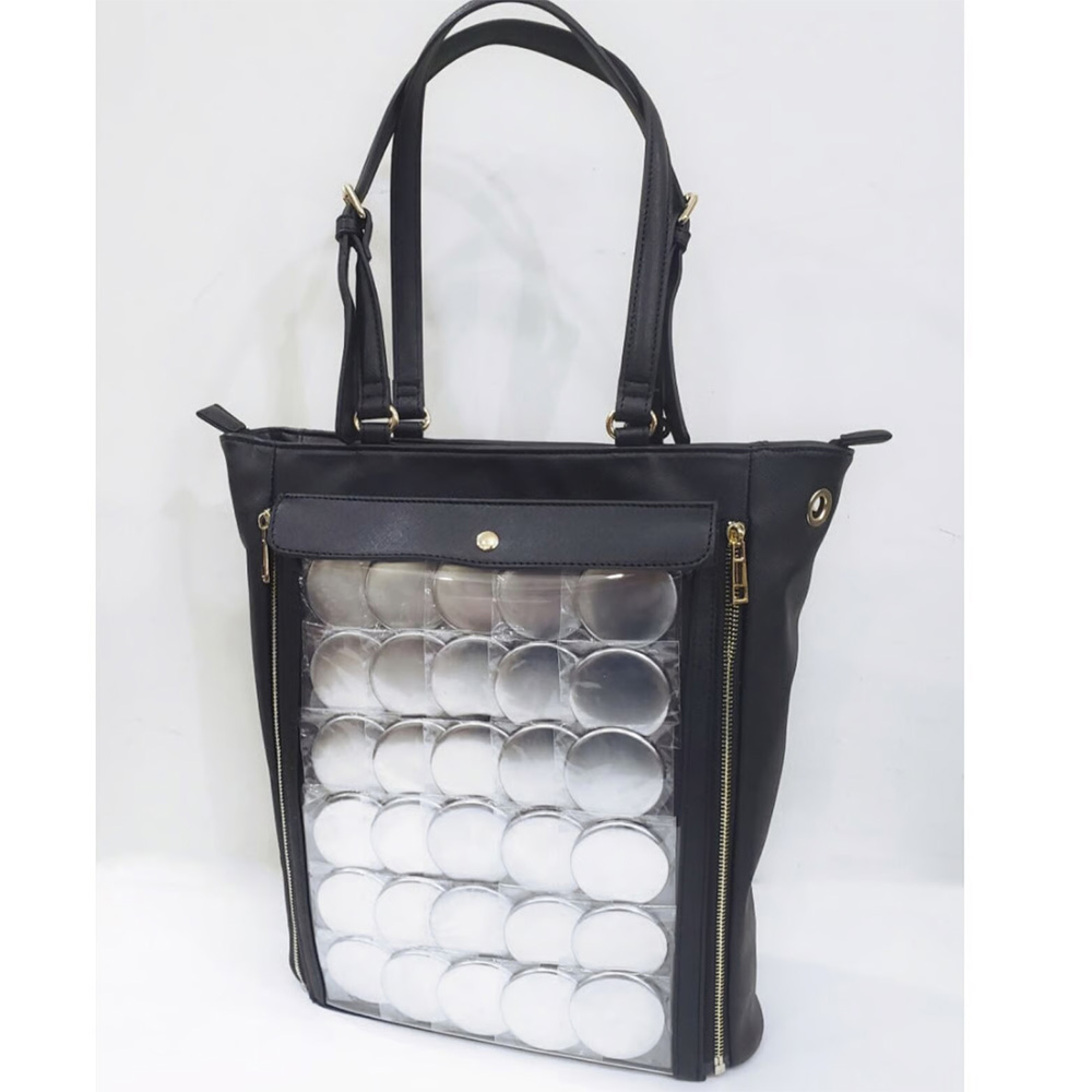 「いつでも推しと一緒にいたいけど、痛バッグは普段使いできない…」と思っている方に朗報!『クルア』回転式シリーズのバッグなら、缶バッジを入れるパーツが取り外せて裏返しにもセットできるので、普通のバッグとして持ち歩けます。クルア 回転式縦型A4面痛バトートバッグ 痛バッグ 普段使いもできる 『時間、場所、場合、いつでも推しと一緒!収納面回転シリーズ』 ビニール面にA4クリアファイルが入るから推しのファイルを入れたら 即推しバッグに変身 !! 前面のビニール面(缶バッジ等を収納する部分)をサイドファスナーで脱着回転して普段にも使用できる機能を付属した痛土台バッグです。 高級感のあるしっかりとしたPU(ポリウレタン)素材を使用しておりますので、 床に直置きしたときに自立し、底鋲が付いておりますので汚れが付きにくい仕様になっております。 缶バッジ面を裏返せば普通のバッグと変わらない見た目なので、休日や現場に行くとき以外にも使えて便利。移動中は裏側にしておき、現場に着いたら表にすることができるので、会社帰りの推し活にもおすすめです。ご当地巡り等の撮影時にもピッタリ。現場に行く予定のない日でも、このバッグを持ってお出かけすれば、誰にもバレずにいつでも推しと一緒にいられます♪※57mm缶バッジが30個くらい収納可能 ※うちわも入ります(ハンドルが少しはみ出ます) ※収納ビニール面はA4サイズになります。