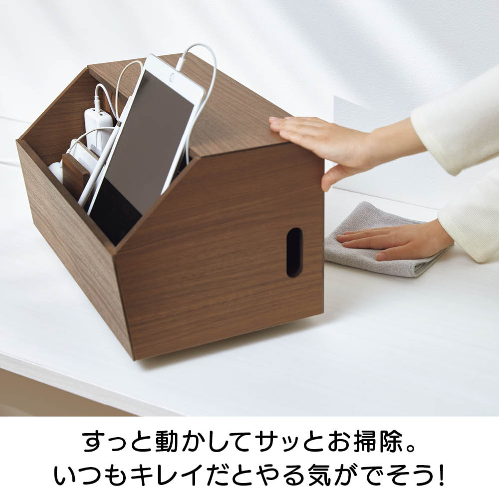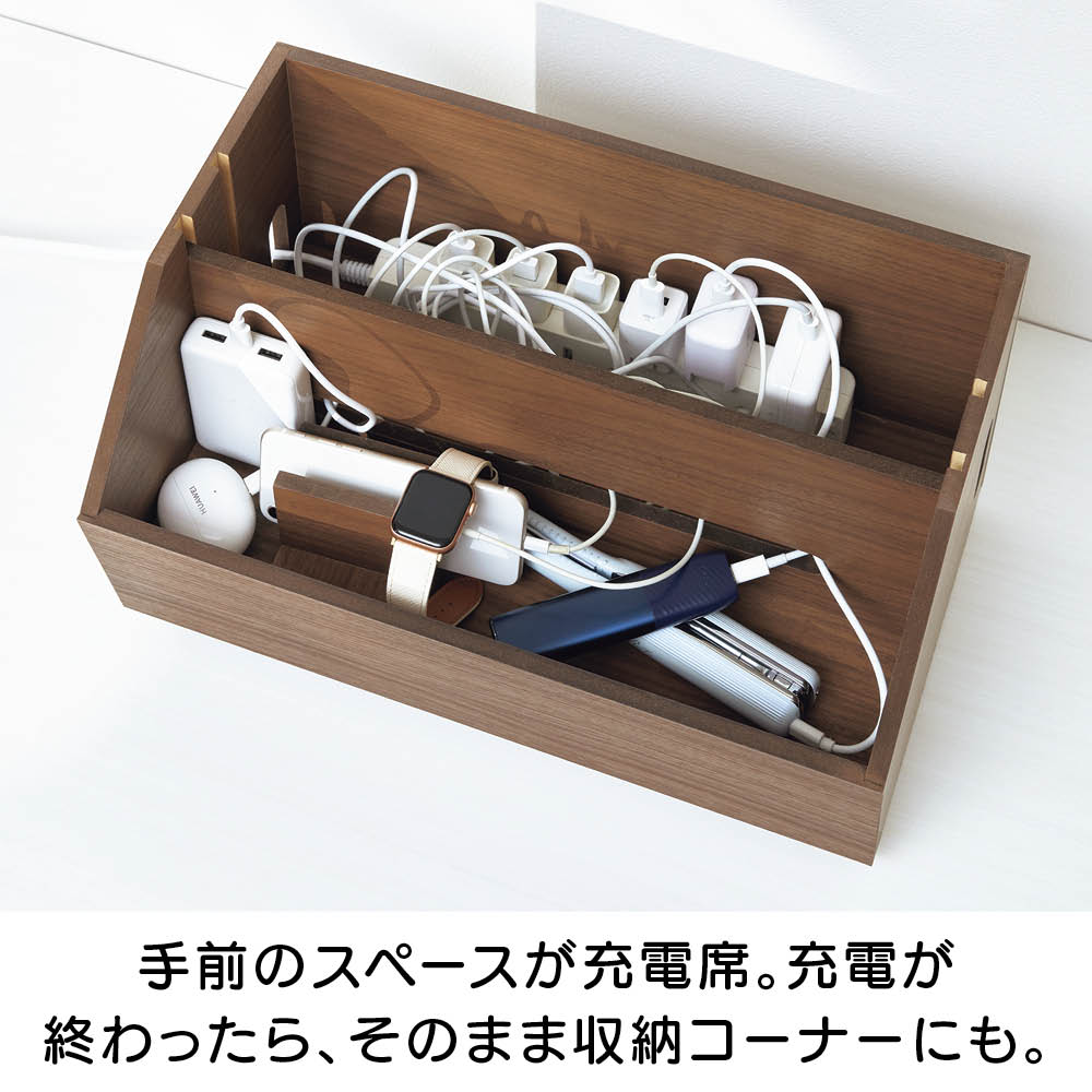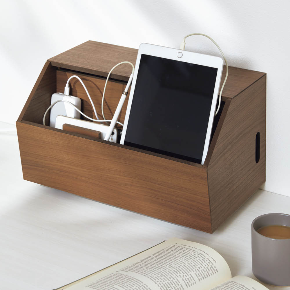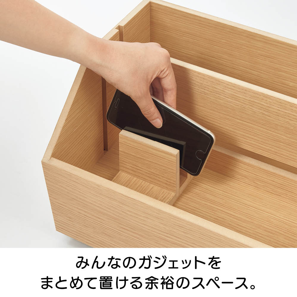 便利だけど、どんどん増える充電式の小型家電。同じ数だけケーブルも増え、コンセントタップは大渋滞。それらを一気に整理・収納しながら充電もできるワゴンができました。キャスター付きで移動もできるのでホコリがたまる前に掃除でき、デスクやコンセント回りをスッキリとキレイにキープできます。タップ回りのゴチャゴチャを解消。充電できる指定席があれば、すぐ美デスクに。便利だけど、どんどん増える充電式の小型家電。同じ数だけケーブルも増え、コンセントタップは大渋滞。それらを一気に整理・収納しながら充電もできるワゴンができました。キャスター付きで移動もできるのでホコリがたまる前に掃除でき、デスクやコンセント回りをスッキリとキレイにキープできます。出しっぱなしで充電待ちのシェーバー、踏みそうになる充電中のタブレット、足に絡みそうなケーブル類。ホコリや汚れがたまりやすいし、見映えも悪く、なによりコンセント発火の原因になりそうで心配。天板を外すと中にコンセントタップ用のスペースがあります。最大で6口のタップが収納可能。PC用などの大きなアダプタを接続しても収まるサイズにしました。接続部分が隠れると、見た目も片付いた印象に!スマホやスマートウォッチ、ワイヤレスイヤホンなど、大きなものから紛失しそうな小さな家電まで収納しながら充電できます。1ヵ所でまとめられるので「あっちは終わったかな」と家の中をあちこち確認に行く手間も省けます。スマホなら4〜5台、タブレットなら並べて2台置けます(※メーカー・サイズによっても異なります)。充電難民による家族ゲンカもこれなら未然に防げそう。すっきりと立てて置けるよう、本体と同色の専用スタンドも付属しています。本体の仕切り部分には2ヵ所の溝があり、仕切り板をはめかえることが可能。コンセントタップやアダプタのサイズに合わせてスペースが選択できるので、充電機器が増えても大丈夫です。外からは見えにくい隠しキャスター付き。ワゴンタイプなので軽い力でラクに移動できます。「充電中に着信が!」という時もワゴンごと手元に引き寄せられて便利。このワゴンをデスクのガジェット用ドックとして使えば、散らばりがちな机上に余白ができます。ホコリがたまる前にちょこっと移動させて掃除もテキパキ、仕事環境も整います!フロアスタイルにもなじむシンプルなデザイン。モップや掃除機を掛ける時は、片手ですっと移動して。汚れと一緒にたまりがちな掃除モヤモヤも速やかに解消です。背面も化粧板仕上げにしているのでシンプル、見せてもきれい。来客時などにクルッと回して置けば、生活感もさりげなく薄められます。