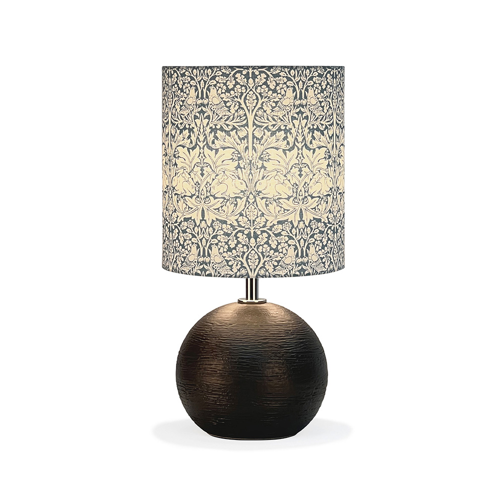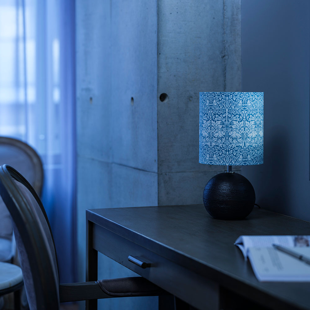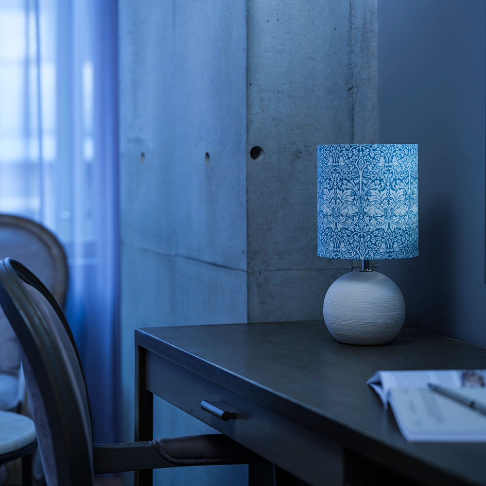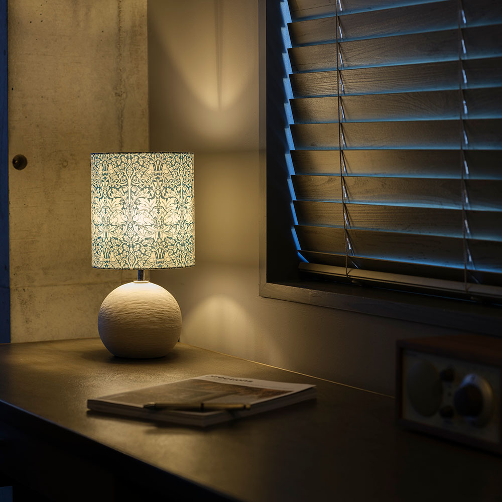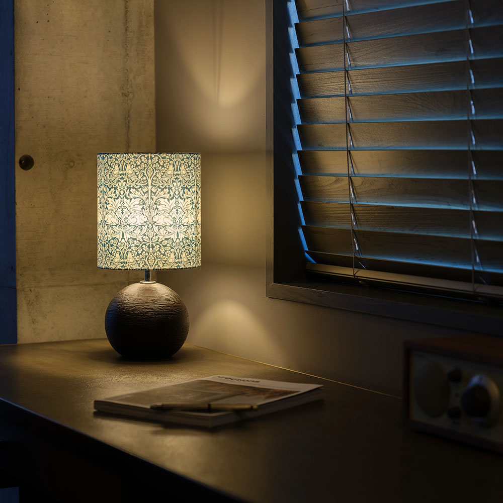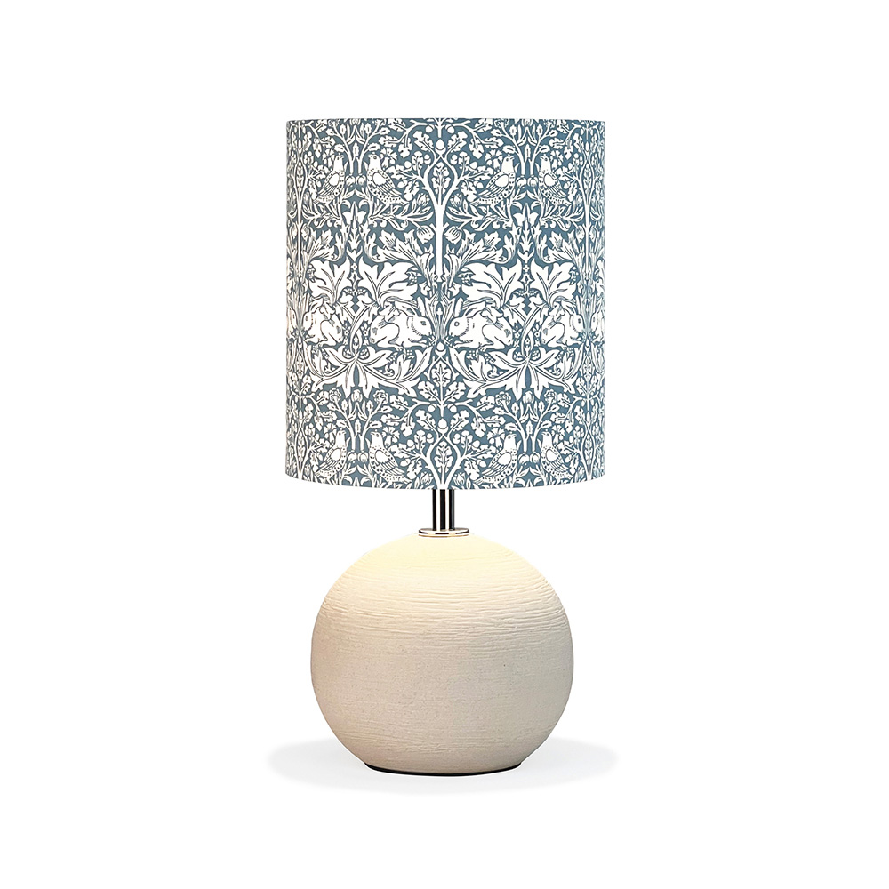 19世紀後半、イギリスで最も傑出した芸術家・思想家のひとり、ウィリアム・モリスの人気柄ブラザーラビットのテキスタイルを使用したシェードに、日本六古窯のひとつ、信楽焼の陶器を本体に使用した可愛らしいテーブルランプ信楽焼のベースが生み出す美しい陰影に心癒される一品。インテリア性が高く、消灯時も空間のアクセントに。
