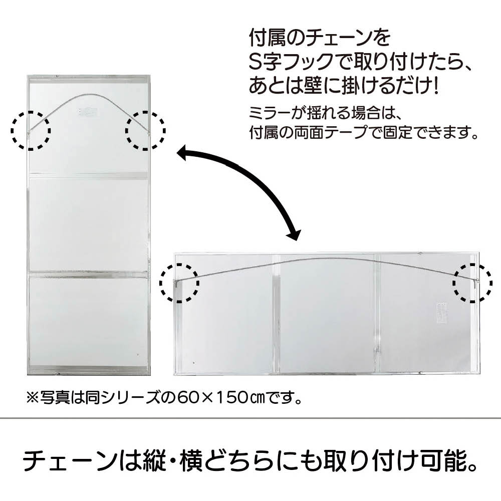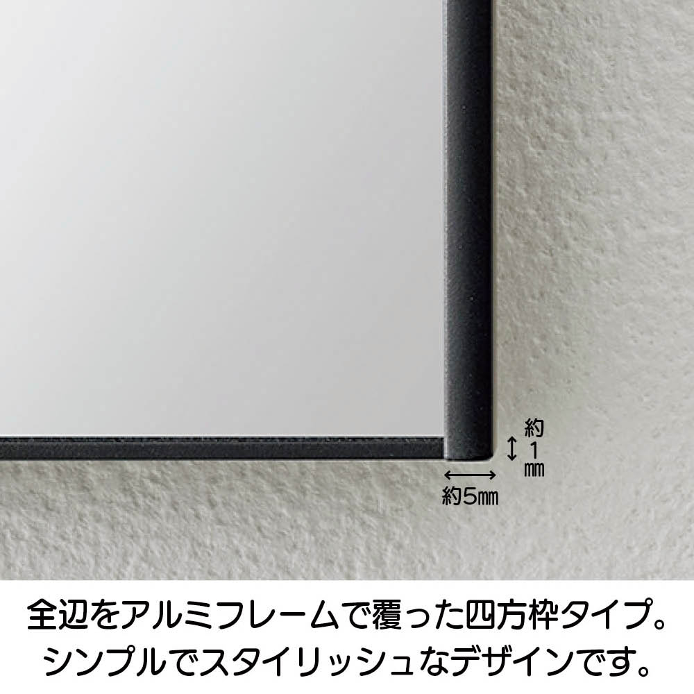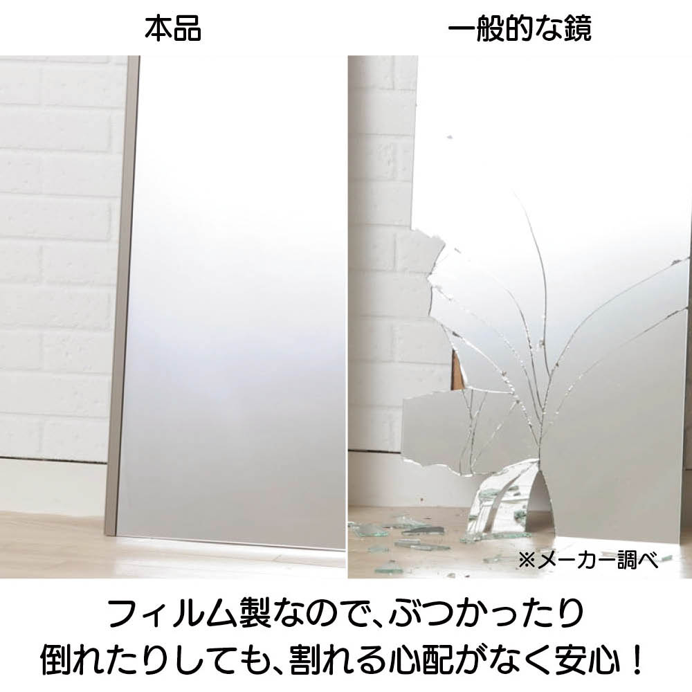 人気スタイリスト・小山田早織さんとコラボした、おしゃれで使いやすい姿見ミラー。特殊フィルム製で軽く、倒れても割れません。しかもガラス製の鏡よりも映りがクリア。全身がしっかり映り、服装や全体のコーディネートのディテールが確認しやすい40×150cmサイズです。人気スタイリスト・小山田早織さんのこだわりが詰まったコラボモデル誕生!仕事柄、長年鏡と向き合い続けてきた小山田さん。大きな鏡は重いし、割れるのも心配……。そんな鏡の弱点を軽々クリアする割れないミラーに感動し、スタイリスト目線で「もっと素敵に!」アレンジしたくなったといいます。特殊フィルムを使い、内部を空洞に仕上げているため、60×150cmの大型サイズで約2.2kgという軽さ!壁掛けの際も壁面に負担がかかりにくく、女性1人でも軽々と移動できます。決して割れないフィルム製なので、ボールなどがぶつかっても大丈夫。子ども部屋にも安心して置けます。万一災害時に倒れても破片が飛び散らず、避難の妨げになることもありません。防災対策としてもおすすめ!40年以上「フィルムミラー」を手掛けている国内メーカーが製造。フィルムは柔らかい素材なので、指で押すと凹みますが、指を離せば元どおりの状態に。一般的な鏡の場合、ガラスの反射で像がブレて映ってしまうことも。割れないミラーは鏡よりもきれいに映ります。高性能フィルム製だからブレや歪みが少なく、対象をくっきり鮮明に映し出します。細部のこだわりでスタイリッシュに。ディノス初の四方枠モデルが誕生!全辺をアルミフレームで覆った四方枠は、ディノスでは初の試み。「スタイリッシュな雰囲気を出すには、4辺をフレームで囲むことが不可欠だと考えました。上下・左右で違うフレームの太さもポイントです」と小山田さん。四方枠になったことで、縦にも横にも設置可能に。アルミフレームの太さは上下と左右で、1mm・5mmとわずかですが、あえて変えています。細やかなデザインの工夫で、より洗練された印象に。フレームの太さが上下・左右で異なるため、正方形でも向きを変えると印象が変わります。スタイリッシュな2つの雰囲気をお楽しみください。飾り方次第で変化が出せる、アートピースのようなスクエアタイプ。太い方のフレームを左右にすると、安定感のある正方形に。上下を太いフレームにすると縦長に見え、よりスタイリッシュな雰囲気に見えます。すべり止めは透明シールに。どの角度から見ても美しいミラー。従来モデルではゴム脚だったすべり止めを、付属の透明シールに替えたのもこだわり。「ゴム脚を外した時に見えてしまうフレームの穴が気になって……。360度どこから見ても美しくあってほしかったんです」。