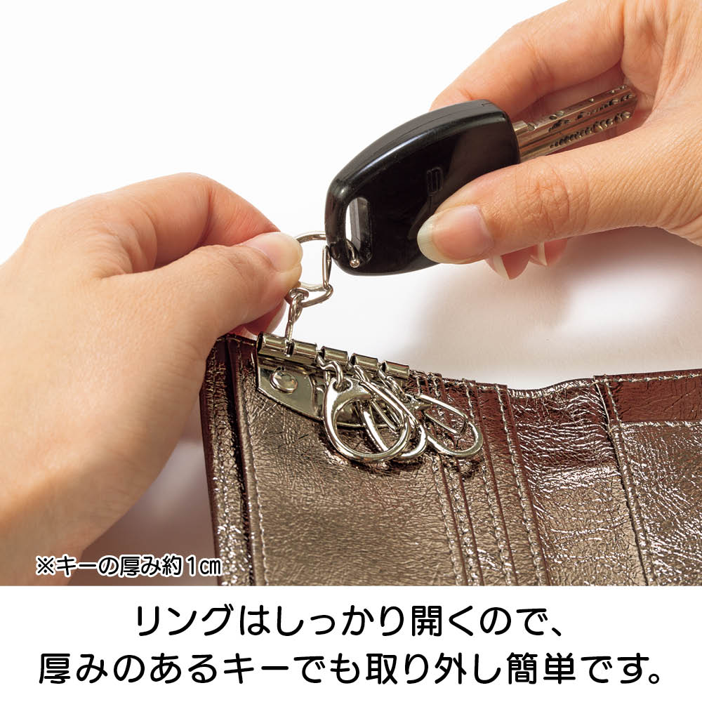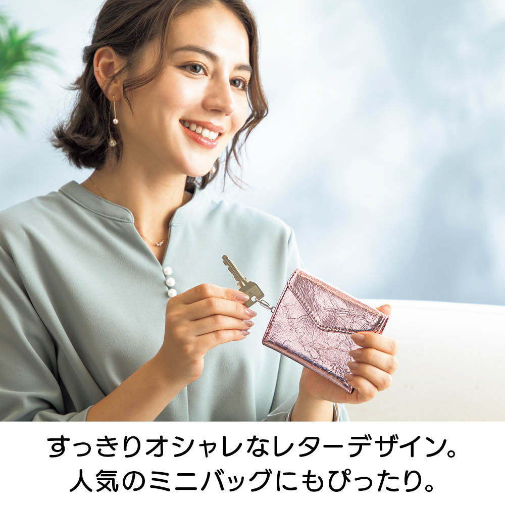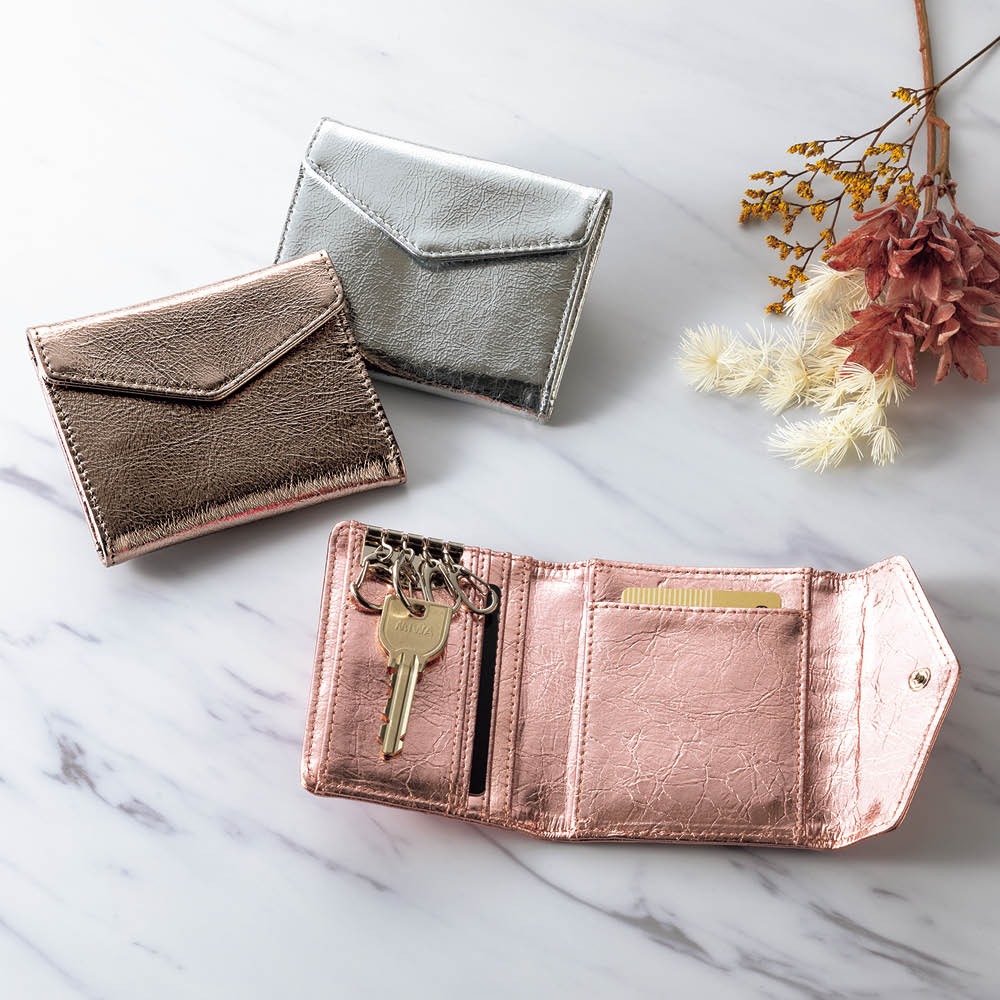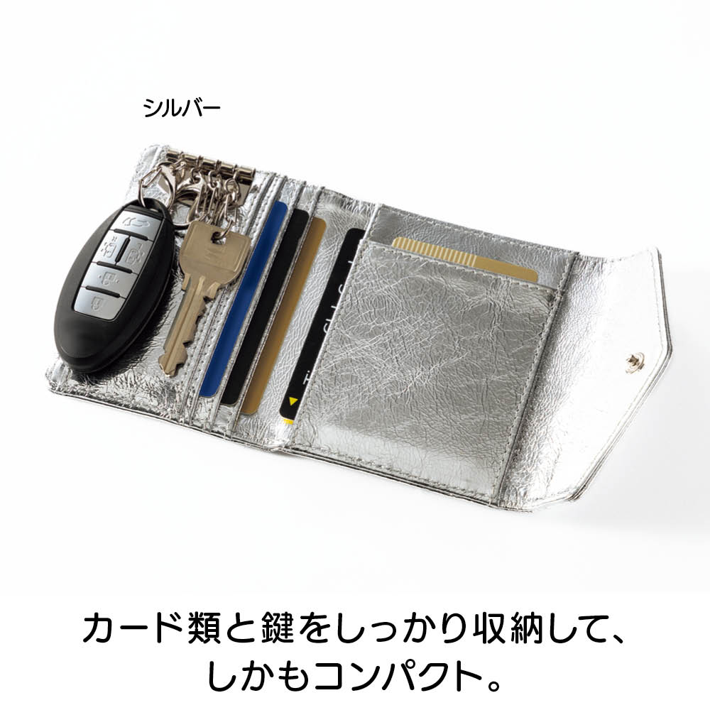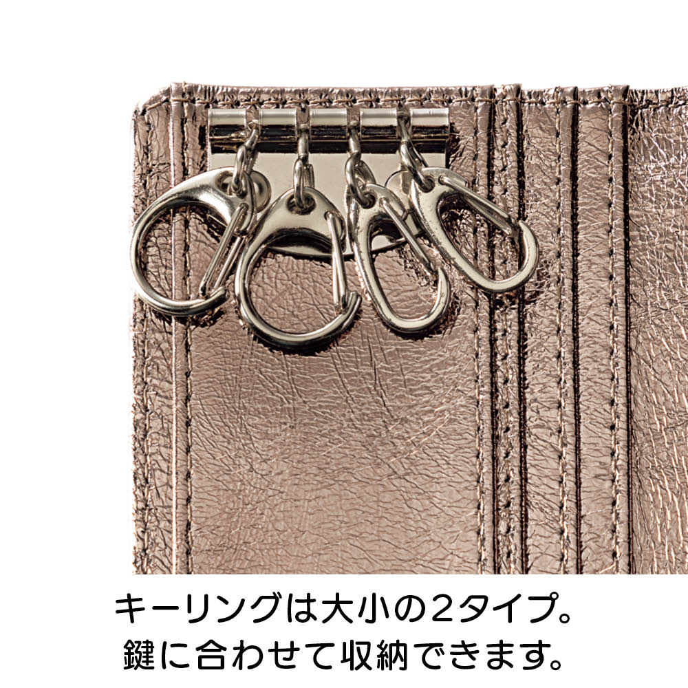 鍵にカードにお財布と、ゴチャゴチャしがちなお出かけの必須アイテムを、ひとまとめに収納できるコンパクトなケースが誕生!2サイズのキーリング、ガバっと開く小銭入れ部分、カードも5枚収納と至れり尽くせり。人気のメタリックカラーとオシャレな見た目もポイント。しかも本革の高級仕様です。オシャレなメタリック調で個性豊かな3カラーをご用意。本革なので高級感も◎きらめきが美しい人気のメタリック調です。スタイリッシュな<シルバー>、チャーミングな<ピンクゴールド>、シックな<ブラック>の3色展開。本革を使用しているので使い込むほどに愛着が湧いてきます。持ち物がバッグ内のあちこちに…そんな悩みを解消しました。鍵がバッグの中で行方不明になったり、使いたいカードがすぐに見つからなかったり。お出かけアイテムを全部ひとつに収納したいけれど、コンパクトさや実用性も外したくない。そんな願いをすべて実現した理想のケースが、このキーアンドパスケースです。カード類と鍵をしっかり収納して、しかもコンパクト。サイズ違いの鍵も付けられるキーリングが4つ。カードポケットは5枚分あるので、交通ICカード、健康保険証、運転免許証、クレカなどをしっかり収納。ちょっとした外出のマストアイテムをひとまとめにして持ち運べます。リングはしっかり開くので、厚みのあるキーでも取り外し簡単です。リング部分はしっかり開くので、車のキーやマンションのエントランスキーなど、厚みのあるタイプでも手軽に取り外しができます。(画像で使用しているキーは厚みおよそ約1cmです。)キーリングは大小の2タイプ。鍵に合わせて収納できます。大きなタイプが2つと小さなタイプが2つの4つのキーリングをセッティングしました。一般的な鍵や厚みのある鍵など、多様な鍵を収納できます。背面のポケットは小銭入れとして使っても◎。キーケース、カードケース、小銭入れがひとつに!背面のファスナー付きポケットにスリットを採用。ガバっと開くので中が見やすく、お札や小銭の出し入れがラクラク。鍵もカードもお金も、これひとつに収納すればバッグの中はすっきり。ごちゃごちゃにサヨナラですね。中身を入れても薄くてコンパクト!使いやすい三つ折りデザインです。鍵を付けて、カードを5枚収納しても、こんなに薄いまま。これならミニバッグに入れてもじゃまになりません。持ち歩くのがうれしくなる軽やかさです。すっきりオシャレなレターデザイン。 人気のミニバッグにもぴったり。閉じた時にレターデザインになるので、見た目がスマートでとってもおしゃれ。コンパクトなので小さめのバッグでもすんなり入ります。収納のストレスも減って、お出かけがより一層楽しくなります。