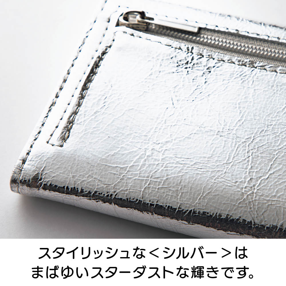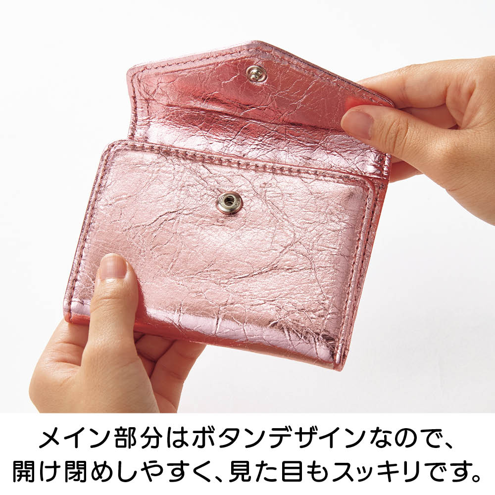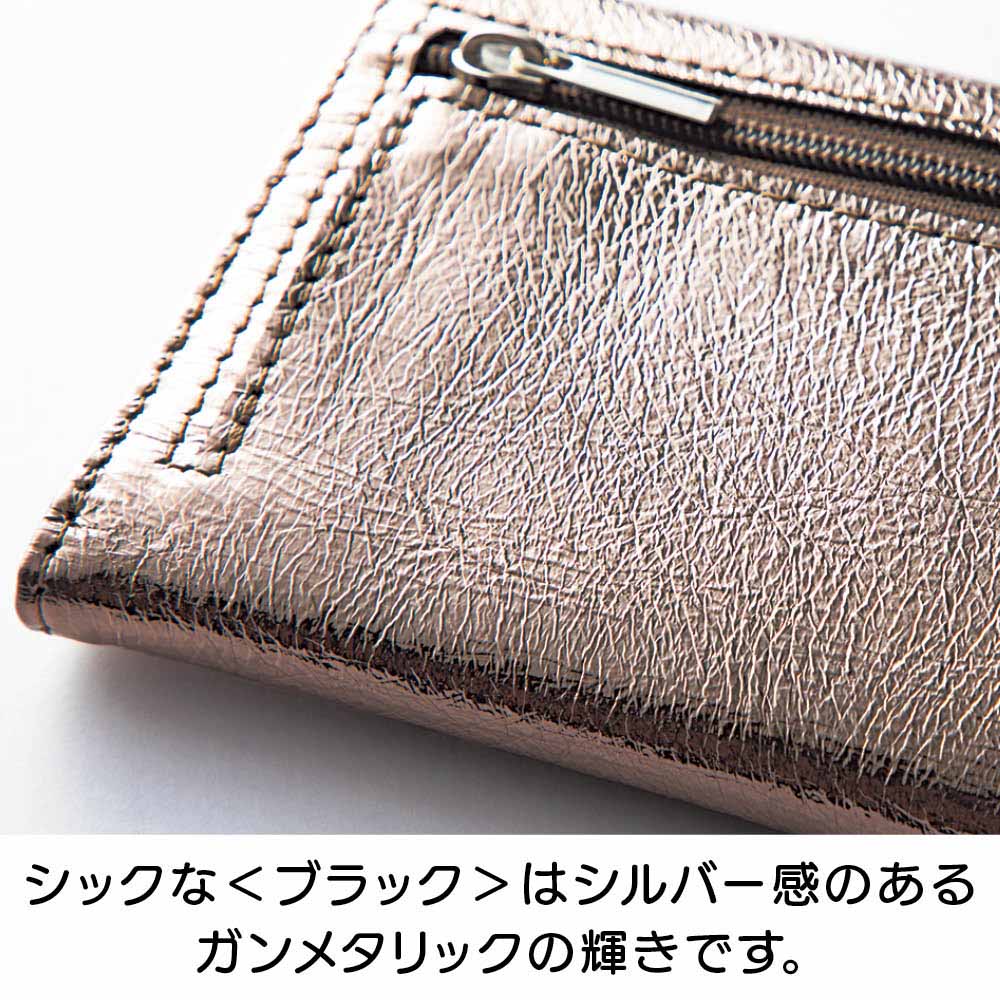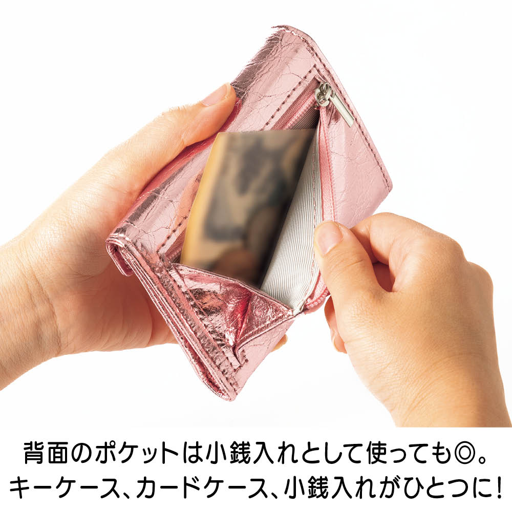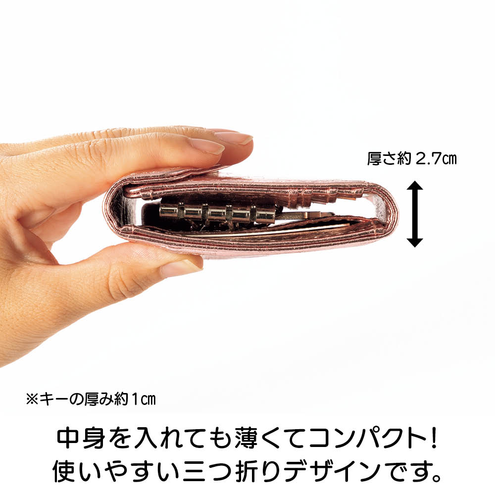 鍵にカードにお財布と、ゴチャゴチャしがちなお出かけの必須アイテムを、ひとまとめに収納できるコンパクトなケースが誕生!2サイズのキーリング、ガバっと開く小銭入れ部分、カードも5枚収納と至れり尽くせり。人気のメタリックカラーとオシャレな見た目もポイント。しかも本革の高級仕様です。オシャレなメタリック調で個性豊かな3カラーをご用意。本革なので高級感も◎きらめきが美しい人気のメタリック調です。スタイリッシュな<シルバー>、チャーミングな<ピンクゴールド>、シックな<ブラック>の3色展開。本革を使用しているので使い込むほどに愛着が湧いてきます。持ち物がバッグ内のあちこちに…そんな悩みを解消しました。鍵がバッグの中で行方不明になったり、使いたいカードがすぐに見つからなかったり。お出かけアイテムを全部ひとつに収納したいけれど、コンパクトさや実用性も外したくない。そんな願いをすべて実現した理想のケースが、このキーアンドパスケースです。カード類と鍵をしっかり収納して、しかもコンパクト。サイズ違いの鍵も付けられるキーリングが4つ。カードポケットは5枚分あるので、交通ICカード、健康保険証、運転免許証、クレカなどをしっかり収納。ちょっとした外出のマストアイテムをひとまとめにして持ち運べます。リングはしっかり開くので、厚みのあるキーでも取り外し簡単です。リング部分はしっかり開くので、車のキーやマンションのエントランスキーなど、厚みのあるタイプでも手軽に取り外しができます。(画像で使用しているキーは厚みおよそ約1cmです。)キーリングは大小の2タイプ。鍵に合わせて収納できます。大きなタイプが2つと小さなタイプが2つの4つのキーリングをセッティングしました。一般的な鍵や厚みのある鍵など、多様な鍵を収納できます。背面のポケットは小銭入れとして使っても◎。キーケース、カードケース、小銭入れがひとつに!背面のファスナー付きポケットにスリットを採用。ガバっと開くので中が見やすく、お札や小銭の出し入れがラクラク。鍵もカードもお金も、これひとつに収納すればバッグの中はすっきり。ごちゃごちゃにサヨナラですね。中身を入れても薄くてコンパクト!使いやすい三つ折りデザインです。鍵を付けて、カードを5枚収納しても、こんなに薄いまま。これならミニバッグに入れてもじゃまになりません。持ち歩くのがうれしくなる軽やかさです。すっきりオシャレなレターデザイン。 人気のミニバッグにもぴったり。閉じた時にレターデザインになるので、見た目がスマートでとってもおしゃれ。コンパクトなので小さめのバッグでもすんなり入ります。収納のストレスも減って、お出かけがより一層楽しくなります。