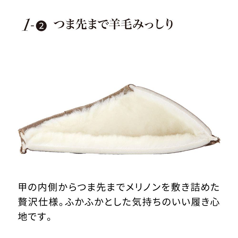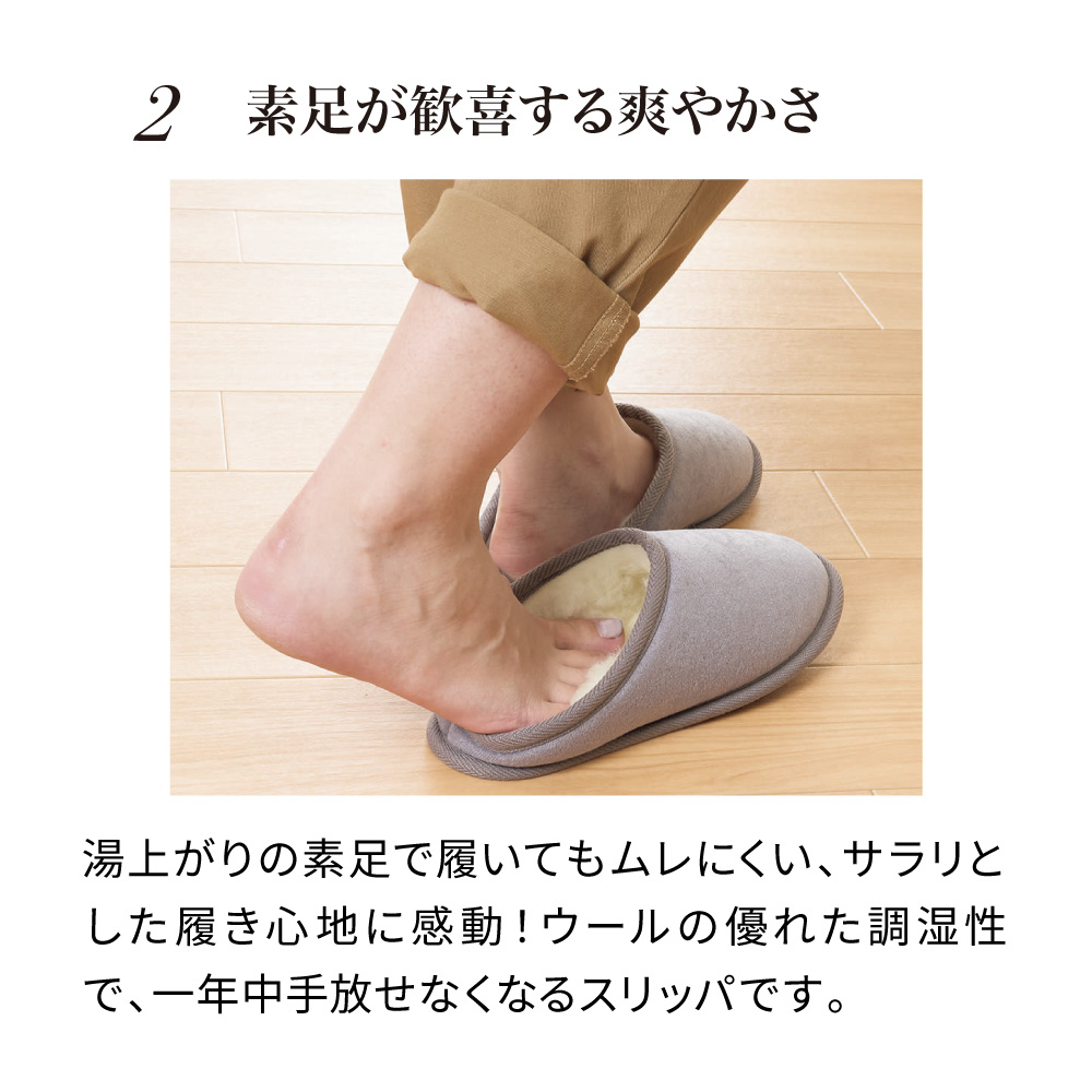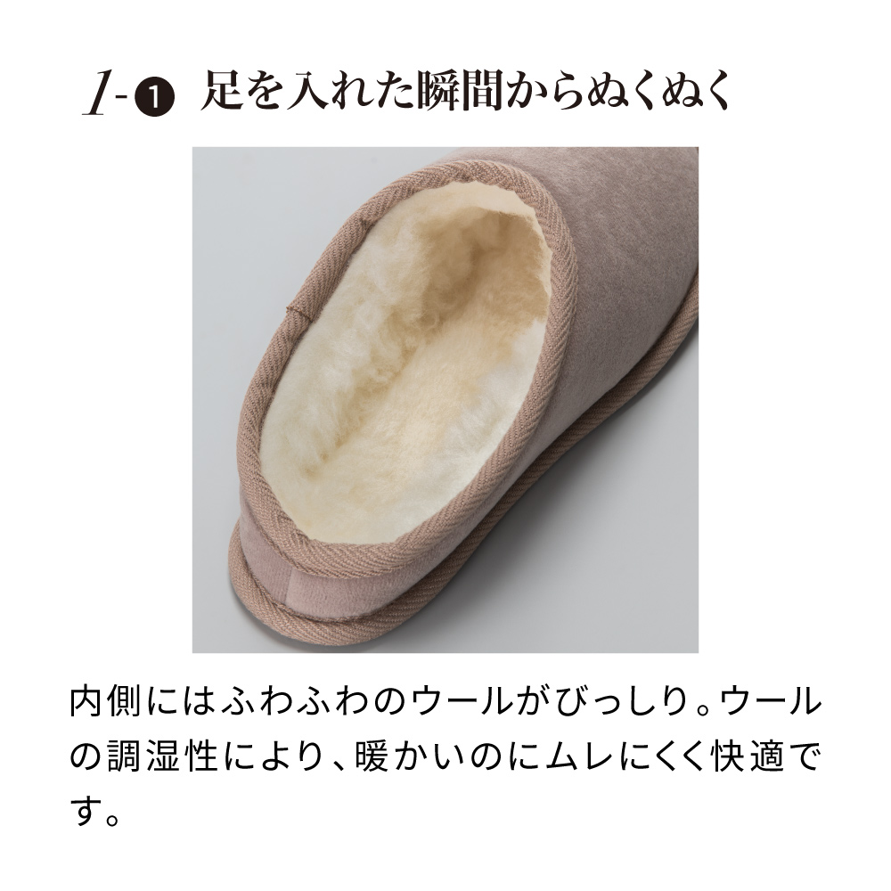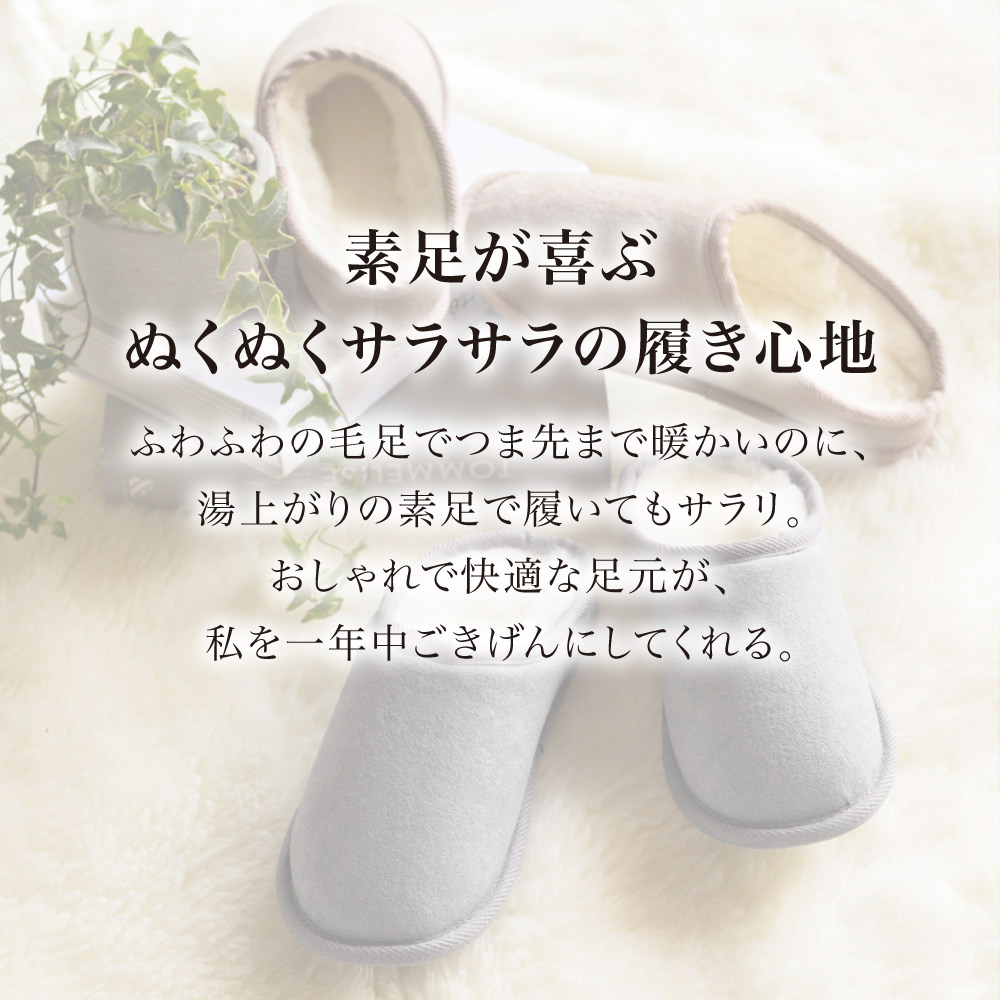 毛足のやわらかな羊毛が、つま先まで暖かく包み込んでくれるスリッパです。吸放湿性に優れた天然繊維のウールが余分な湿気を放出するから、素足で履いてもサラリとしてムレにくく一年中快適。踏みしめた時のふんわり感がクセになる心地よさです。底面は布張りなので歩きやすく足音も静か。洗濯機で丸洗いできるので清潔です。素足が喜ぶぬくぬくサラサラの履き心地冬の寒さから足全体をふんわりと包み込む、心地よい温もり。冷え易い足先までしっかり守られる安心感は、寒い季節を快適に変えてくれます。さらに、羊毛の優れた吸放湿性で一年中サラリとした履き心地で快適に。肌に触れる優しい感触は、長時間履いていても気持ちよさが続きます。つま先まで羊毛みっしりで、足を入れた瞬間からぬくぬく足裏だけでなく甲の内側からつま先まで、メリノンをびっしり敷き詰めた贅沢仕様。ウールの持つ天然の調湿性により、足を入れた瞬間から暖かいのにムレにくく快適。ふかふかとした気持ちのいい履き心地です。湯上がりさえも足元サラサラで、季節を問わず気持ちいい湯上がりの素足で履いてもムレにくい、サラリとした履き心地に感動!冷えやすい冬も、ベタつきがちな夏も、ウールの弾力と優れた調湿性で足元はふんわりサラサラ。一年中手放せなくなるスリッパです。ネットに入れて洗濯機OK!良質な羊毛で仕立てた、まるでムートンのような生地オーストラリア産の良質な羊毛を使用し、特殊なニッティング加工で編み上げたムートンのような素材。この生地を肌面の隅々にまで敷き込み、履き心地の良いスリッパへと職人が丁寧に仕上げています。底地はやわらかく丈夫なポリエステルスエード素材。歩行時のパタパタという音もほとんどなく、フローリングや絨毯を痛めにくいのもポイント。メリノンに使用されているのは、羊毛の中でも特に細くやわらかく密度の高い、上質なメリノウール。暖かいのにムレにくく、洗濯機で気軽に洗える扱いやすさも特徴です。