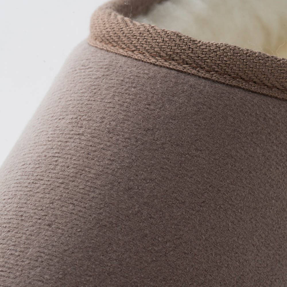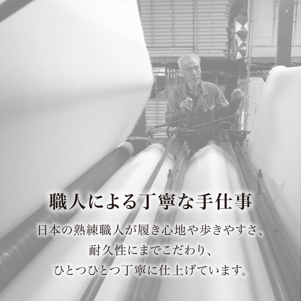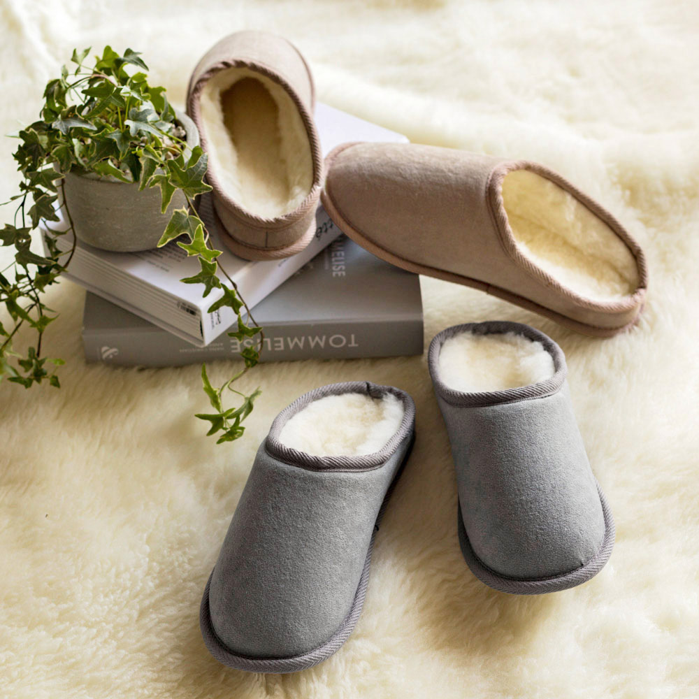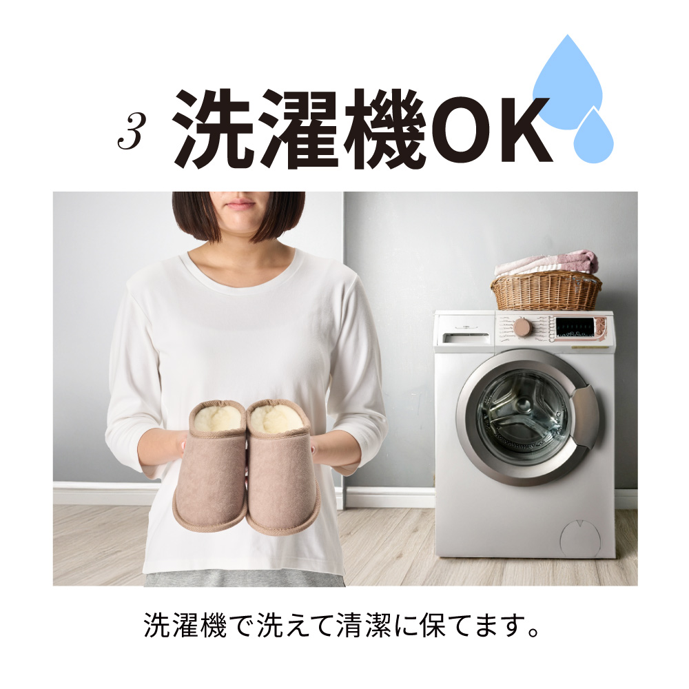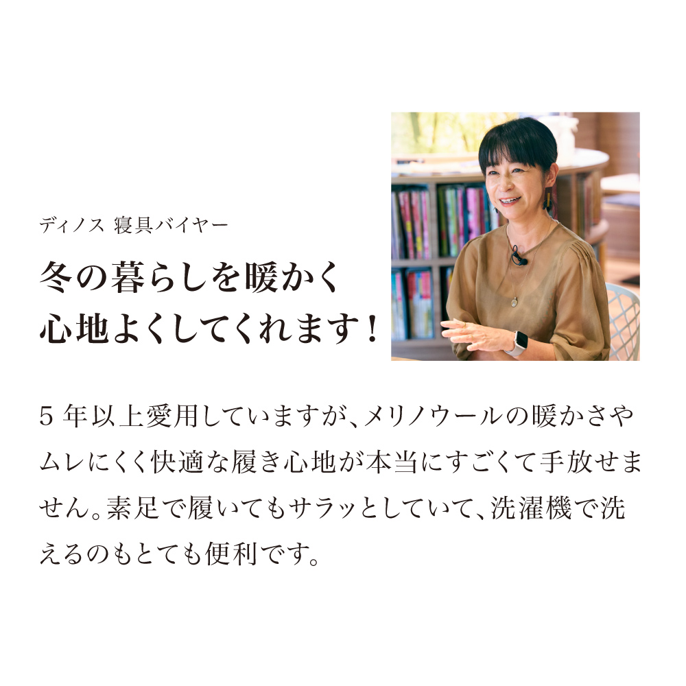 毛足のやわらかな羊毛が、つま先まで暖かく包み込んでくれるスリッパです。吸放湿性に優れた天然繊維のウールが余分な湿気を放出するから、素足で履いてもサラリとしてムレにくく一年中快適。踏みしめた時のふんわり感がクセになる心地よさです。底面は布張りなので歩きやすく足音も静か。洗濯機で丸洗いできるので清潔です。素足が喜ぶぬくぬくサラサラの履き心地冬の寒さから足全体をふんわりと包み込む、心地よい温もり。冷え易い足先までしっかり守られる安心感は、寒い季節を快適に変えてくれます。さらに、羊毛の優れた吸放湿性で一年中サラリとした履き心地で快適に。肌に触れる優しい感触は、長時間履いていても気持ちよさが続きます。つま先まで羊毛みっしりで、足を入れた瞬間からぬくぬく足裏だけでなく甲の内側からつま先まで、メリノンをびっしり敷き詰めた贅沢仕様。ウールの持つ天然の調湿性により、足を入れた瞬間から暖かいのにムレにくく快適。ふかふかとした気持ちのいい履き心地です。湯上がりさえも足元サラサラで、季節を問わず気持ちいい湯上がりの素足で履いてもムレにくい、サラリとした履き心地に感動!冷えやすい冬も、ベタつきがちな夏も、ウールの弾力と優れた調湿性で足元はふんわりサラサラ。一年中手放せなくなるスリッパです。ネットに入れて洗濯機OK!良質な羊毛で仕立てた、まるでムートンのような生地オーストラリア産の良質な羊毛を使用し、特殊なニッティング加工で編み上げたムートンのような素材。この生地を肌面の隅々にまで敷き込み、履き心地の良いスリッパへと職人が丁寧に仕上げています。底地はやわらかく丈夫なポリエステルスエード素材。歩行時のパタパタという音もほとんどなく、フローリングや絨毯を痛めにくいのもポイント。メリノンに使用されているのは、羊毛の中でも特に細くやわらかく密度の高い、上質なメリノウール。暖かいのにムレにくく、洗濯機で気軽に洗える扱いやすさも特徴です。