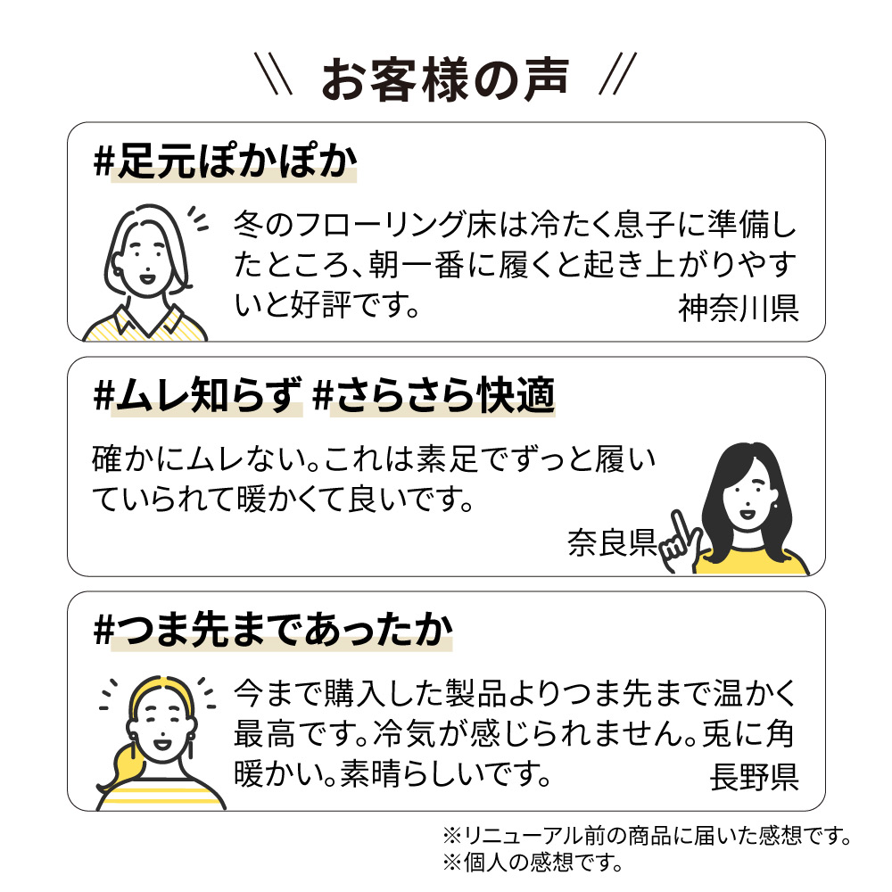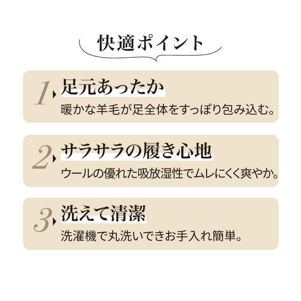 毛足が長く柔らかな羊毛が足を包み込んで足元を心地よく温めてくれます。 上から(イ)ベージュ、(ア)グレー