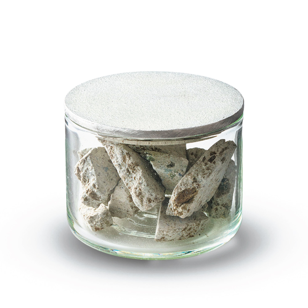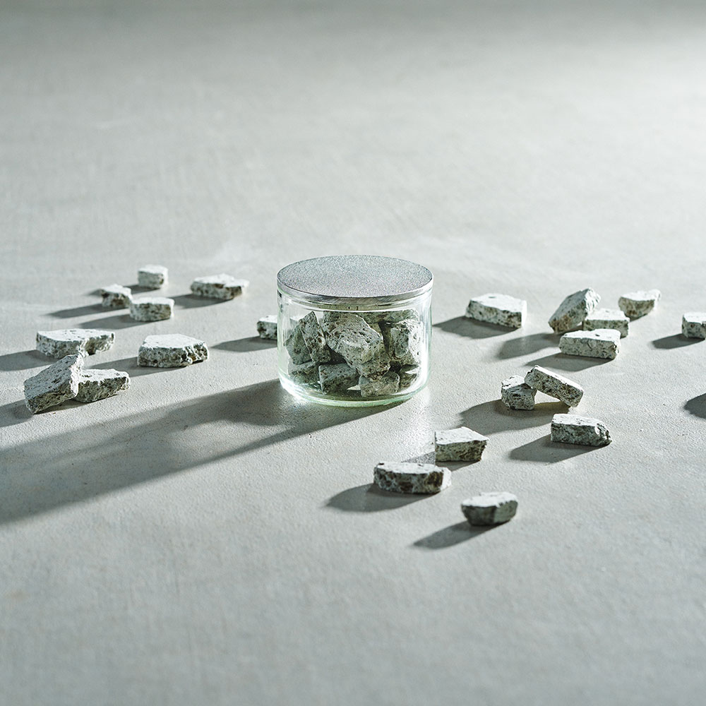 クリアなガラス瓶に入ったライトカラーのアロマストーンは、大谷石の端材を活用。そこにあるだけで澄んだ空気を醸し出します。