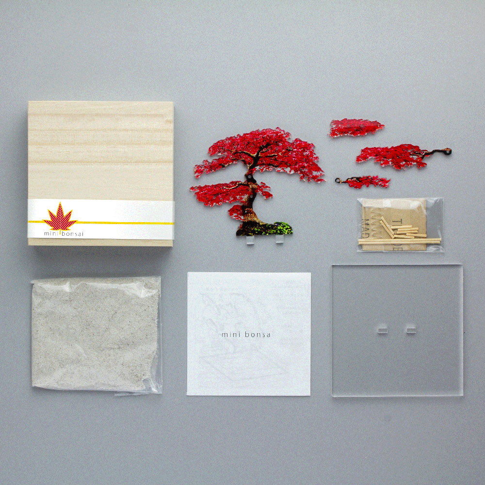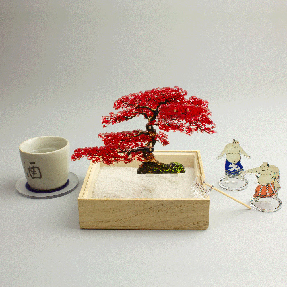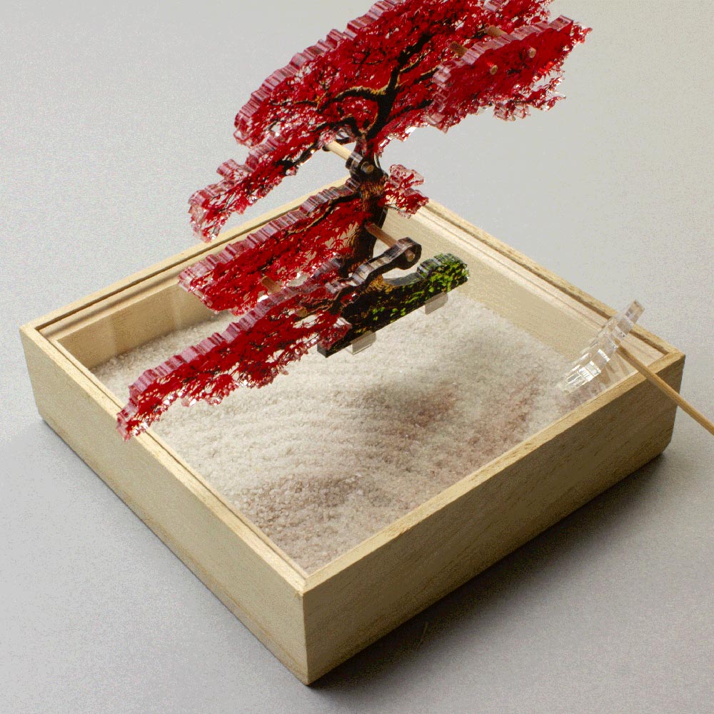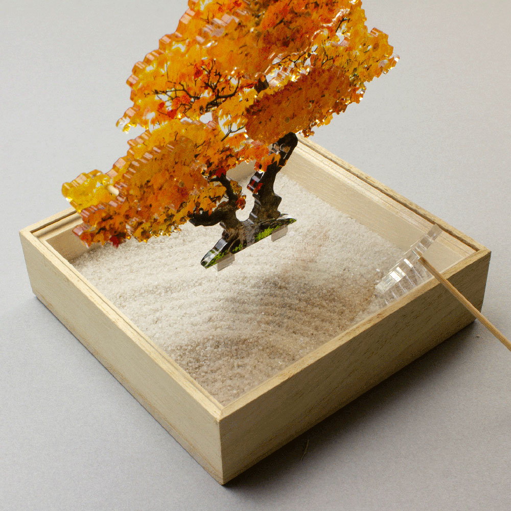 本格的な盆栽の魅力をアクリルでリアルに表現。葉や幹の色味の濃淡や、アクリルを後付けで重ねて演出する立体感など、こだわり満載。お部屋の中に小さな秋を!アクリルで盆栽のシルエットを表現。葉や幹のプリントは、細やかに仕上げました。葉枝は一部後付け式になっており立体感を演出、クリア素材が光に当たり、葉の色に濃淡を生みます。パッケージ兼土台となる木箱に、付属の白砂を敷き詰め、付属のレーキで水の流れを描き枯山水に。アクリルの土台で蓋、その上に組み立てた樹木を立てるつくりになっています。お気に入りの小石を足して小さな枯山水庭園にしても。和室でも洋室でも、木の棚や台の上に並べたり、木材との相性も◎和な要素が強いかと思いますが、シックでモダンな雰囲気もあるので、和室や洋室にもお家の雰囲気を選びません。※パーツを組み立てるに約40分程かかります。プラモデルみたく組み立てる時間も合わせて楽しんでいただけると嬉しいです。