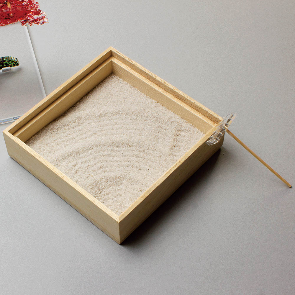 土台の木箱に白砂を敷き、付属のレーキで枯山水に。