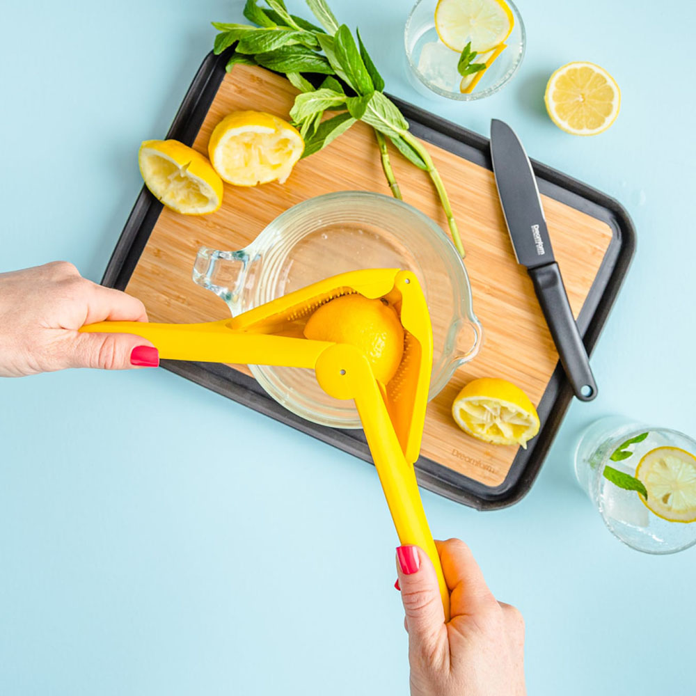 簡単に果物をプレスして、果汁を絞ることができるジューサー。レモン、柚子、ライムまで幅広い果実に使用できるサイズです。果汁を使うお料理や、サワーを作る際に最適!■簡単に絞れる独自の形状!手ではなく腕の力を使うため、従来の垂直に押しつぶすジューサーよりも小さな力で、手で絞るような感覚で絞ることができます。■コップに直接注いで、そのまま飲める!果汁がこぼれないように、グラスへ直接果汁を注ぐことができます。更に内蔵されたキャッチャーによりジュースがこされる為、抽出された果汁はそのまま飲むことができます。■折りたたむとフラットに!コンパクトに収まるスリムなデザインで、折り畳むと完全にフラットになります。かさばる凹凸もないので、引き出しに省スペースで収納できます。ドリームファームとは?ドリームファームは2003年にオーストラリアで創業したキッチン用品ブランドです。 『すべての不便を解消する』というコンセプトのもと、これまでの常識にとらわれない斬新なアイデアで製品開発を行っています。