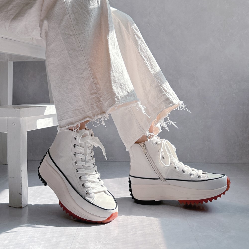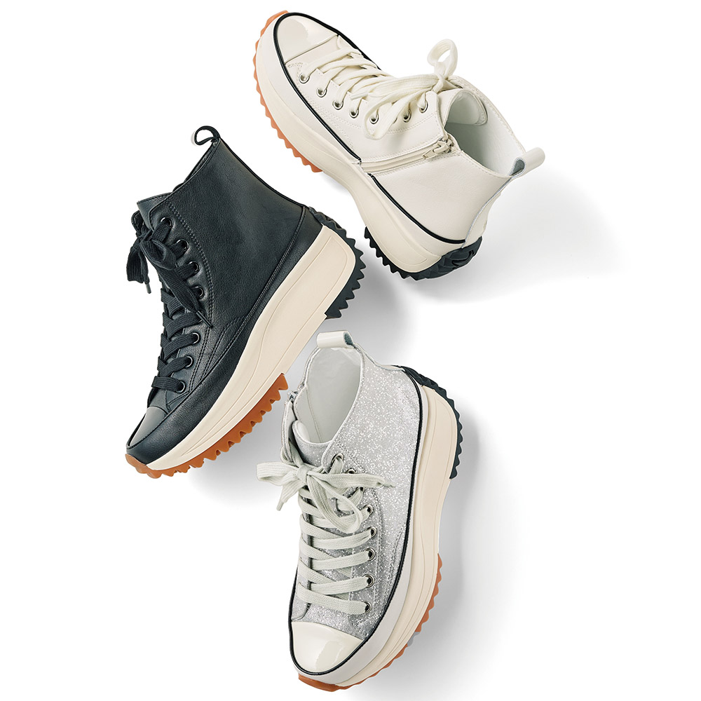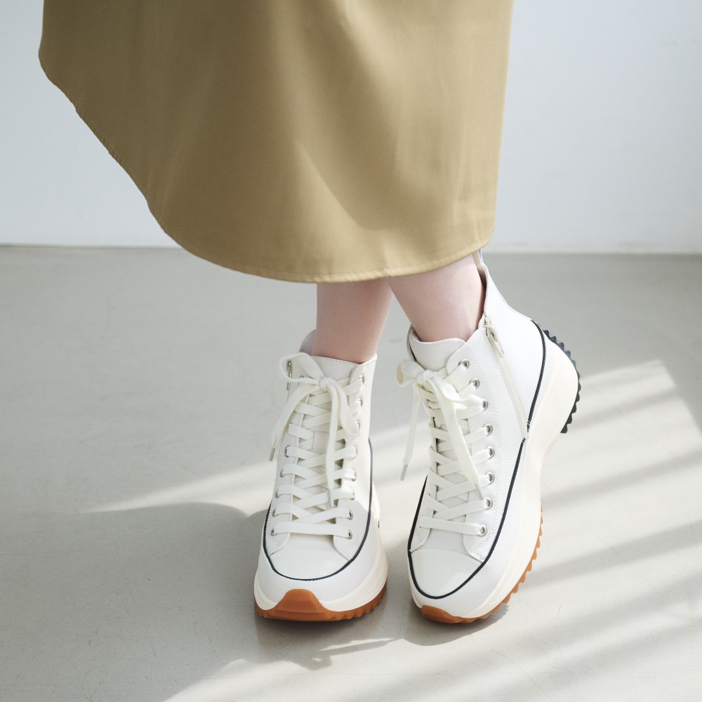 脚長効果が期待できる厚底デザイン。ハイカット仕様で足首をしっかりサポートし、高低差の少ないソールで、厚底でも安定した履き心地です。シンプルなフォルムで、カジュアルからキレイめまで幅広いコーディネートに合わせやすいのも魅力。歩くたびにふかふかとしたクッション性を感じるインソールが、長時間のお出かけにもぴったりです。