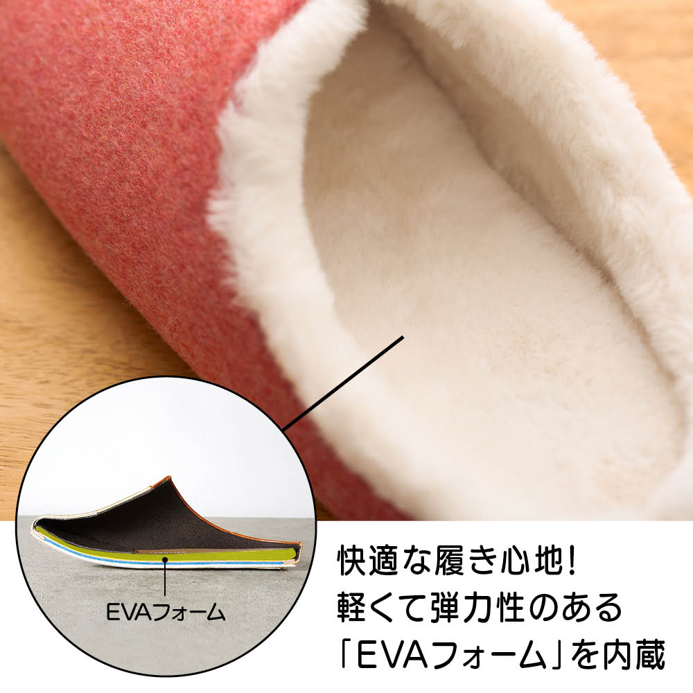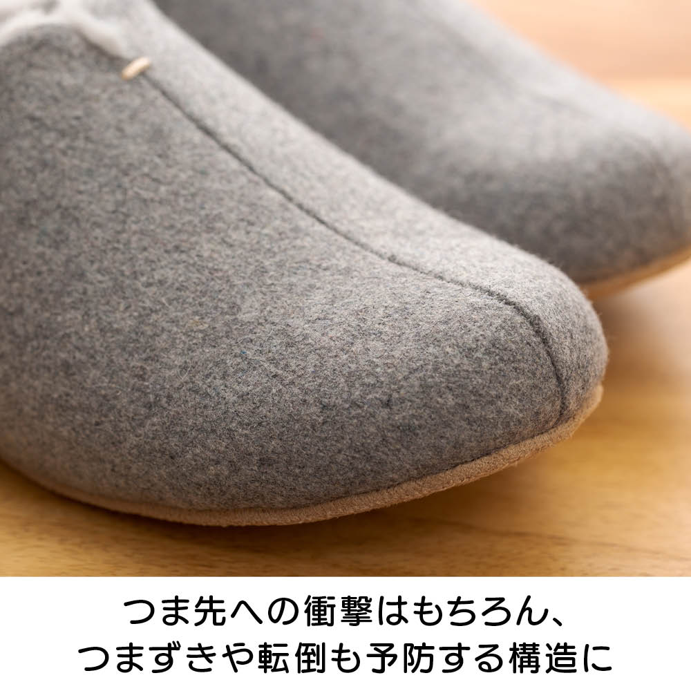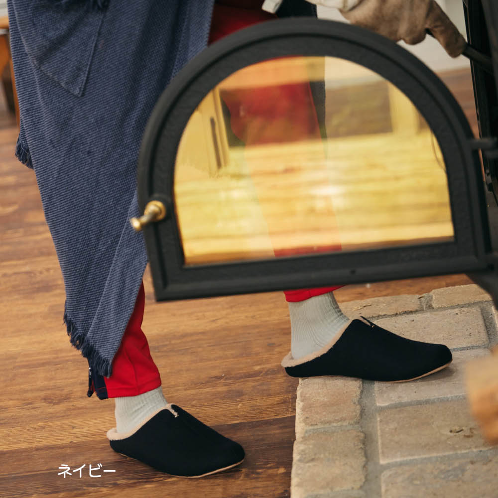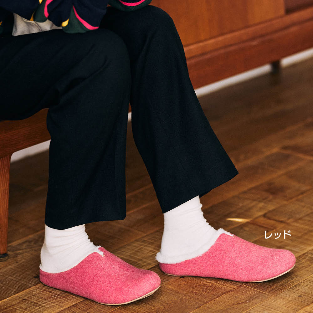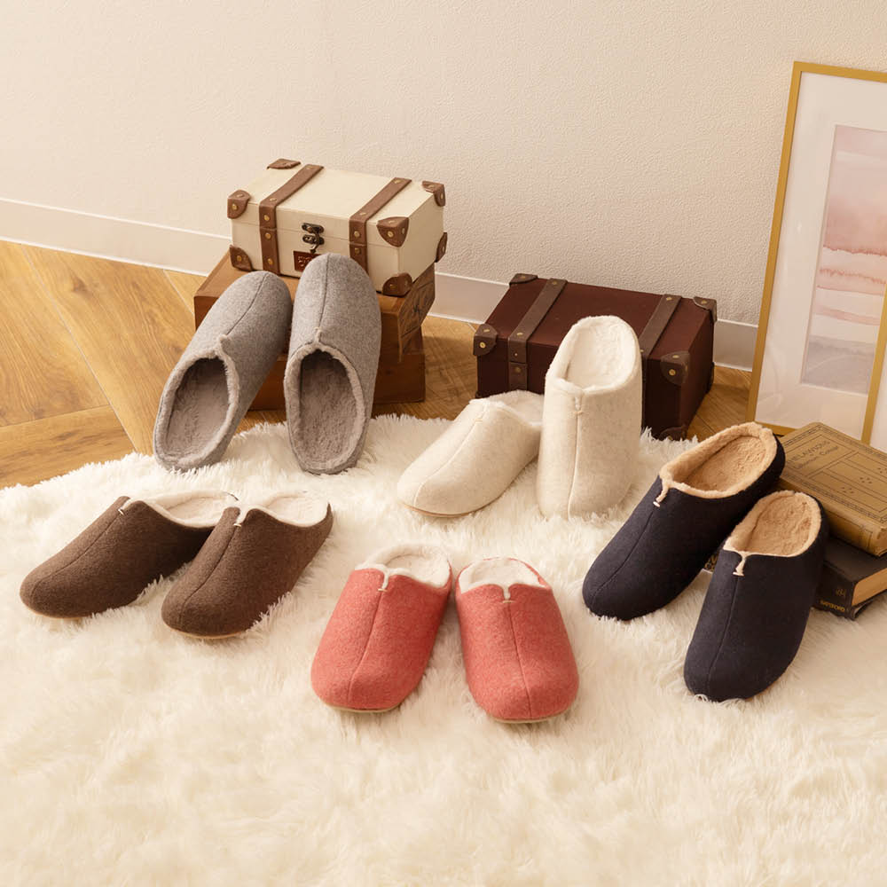 職人による手作業の製法で「歩きやすさ」を追求したスリッパroom’sに、待望の冬バージョンが登場。快適な履き心地はもちろん、インテリアに馴染むデザイン性、転倒予防、静音への配慮など、こだわりが満載です。高密度のボアを使用した、思わず素足で履きたくなる肌触りで、寒い冬に一足あれば重宝すること間違いありません。思わず素足で履きたくなる!「歩く」をとことん考えたスリッパ「脱げやすい、歩きにくい、デザインがイマイチ…」そんなスリッパのお悩みを解決したい。その想いで生まれた、ディノスでも人気の「歩く」を考えたスリッパroom’sに、寒い日に素足でも履ける冬バージョンが登場。冬のコーディネートやインテリアに合わせた、温かみのある5色展開です。職人による手作業の製法で、ぴったり馴染むフィット感を実現足を上げても脱げにくく、長時間履いても疲れにくい。履いた瞬間からぴったりと馴染む快適さの理由は、職人の手作業にこだわっているから。靴を作る時と同様に木型を使って一つひとつ丁寧に製造することで、足の甲にフィットする履き心地と美しいフォルムを実現しました。つま先への衝撃はもちろん、つまずきや転倒も予防する構造にうっかりつま先をぶつけても、物を落としてしまっても大丈夫。スリッパの先端に内蔵された「先芯」が、さまざまな衝撃から足先をガードします。さらにつまずきにくさを考えた「つま先あがり」の構造を採用。冬の寒さでかじかんだ足でも、スムーズに移動できます。「立ちっぱなしの家事で足が疲れる」そんなお悩みに応えるため、弾力性があり足の負担を減らすEVAフォームをインソールに内蔵しています。また外側には高級感があるフェルト生地を、内側には高密度でボリュームのあるボアを使用。優しいレッドにはミルクホワイト、落ち着いたネイビーにはハニーブラウンなど、生地に合わせてボアのカラーにもこだわっています。底面のスエード生地と滑り止めで、静音と安全にも抜かりなくスリッパ特有の意外と気になるパタパタ音も、心配ご無用。底面全体にスエード生地を使っているため、マンションなどの集合住宅にお住まいの方にもぴったりです。さらに滑り止めが縫い付けてあるので、フローリングの床を急いで歩いても滑りにくい仕様となっています。