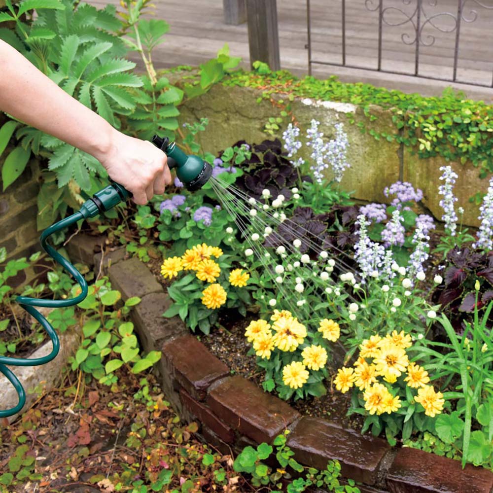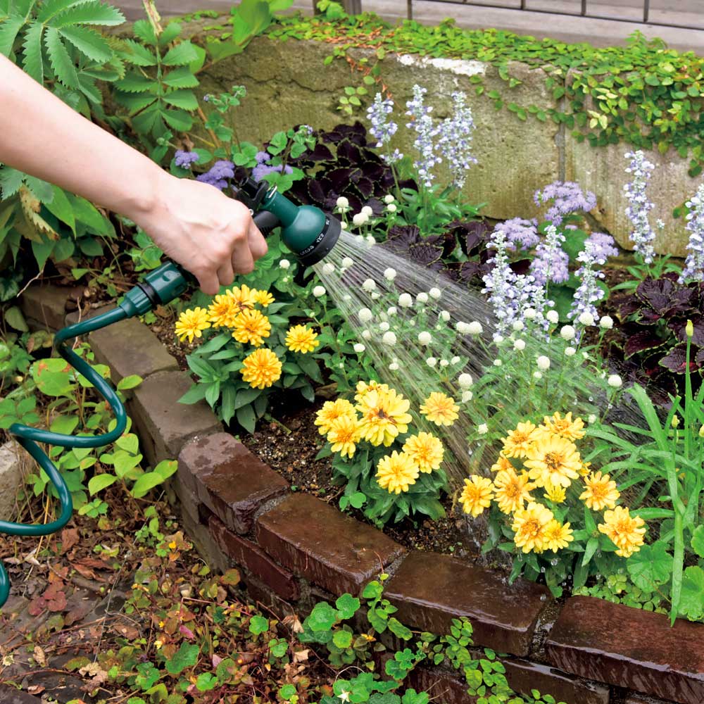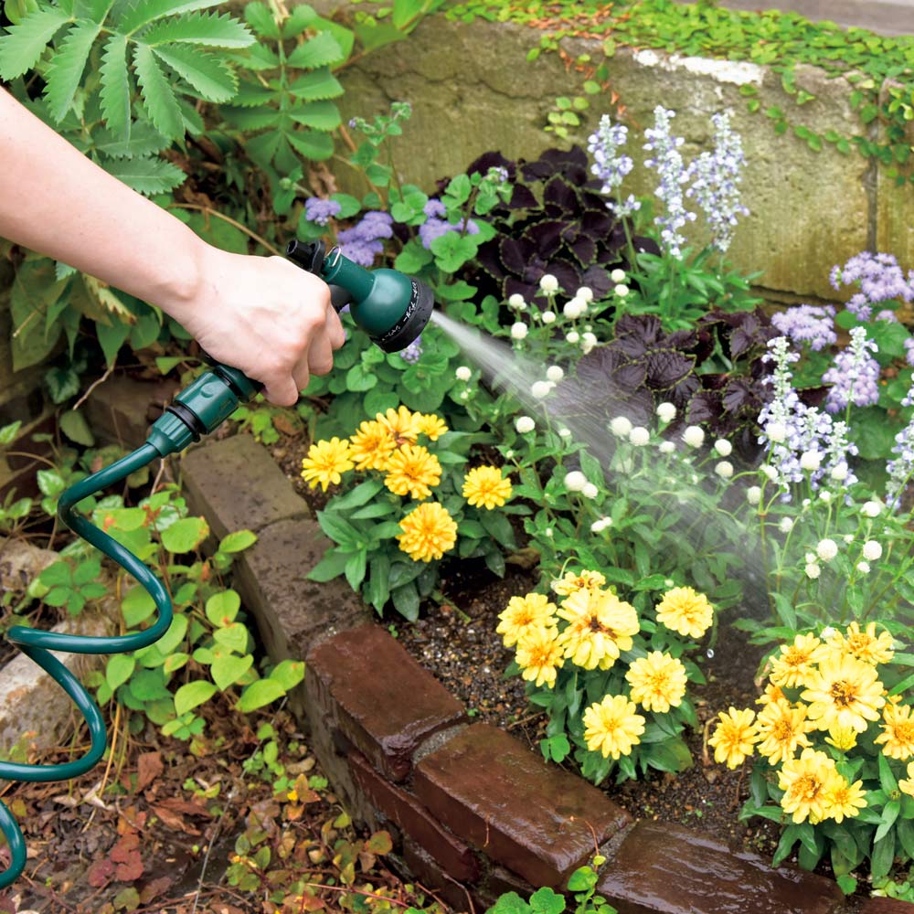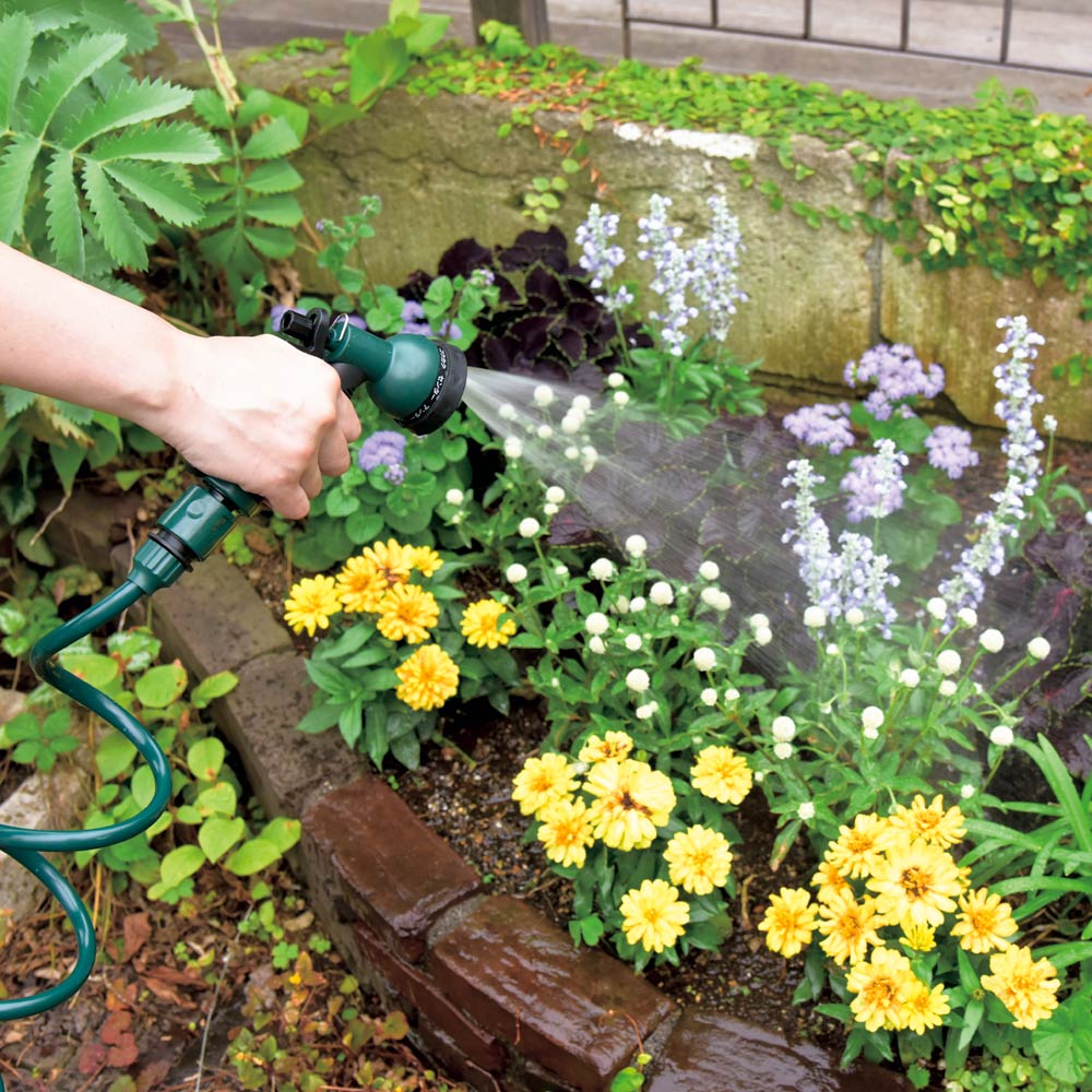 最長約12mまでグーンと伸びる水やりホース最長約12mまでグーンと伸びる水やりホースです。ノズルを回すだけで8種類の散水が可能。カール状なので折れにくく使用後の巻き取りも不要で便利です。