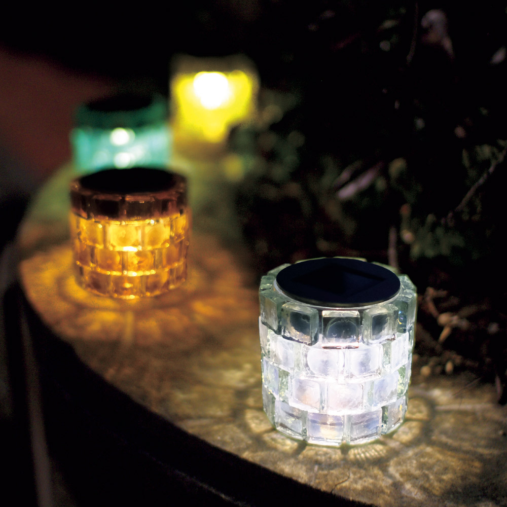 厚さ7mmのガラスタイルを積み上げた職人手作りのソーラーライト厚さ7mmのガラスタイルを積み上げた職人手作りのソーラーライトです。地面に光模様が映し出され、美しいシーンを演出します。