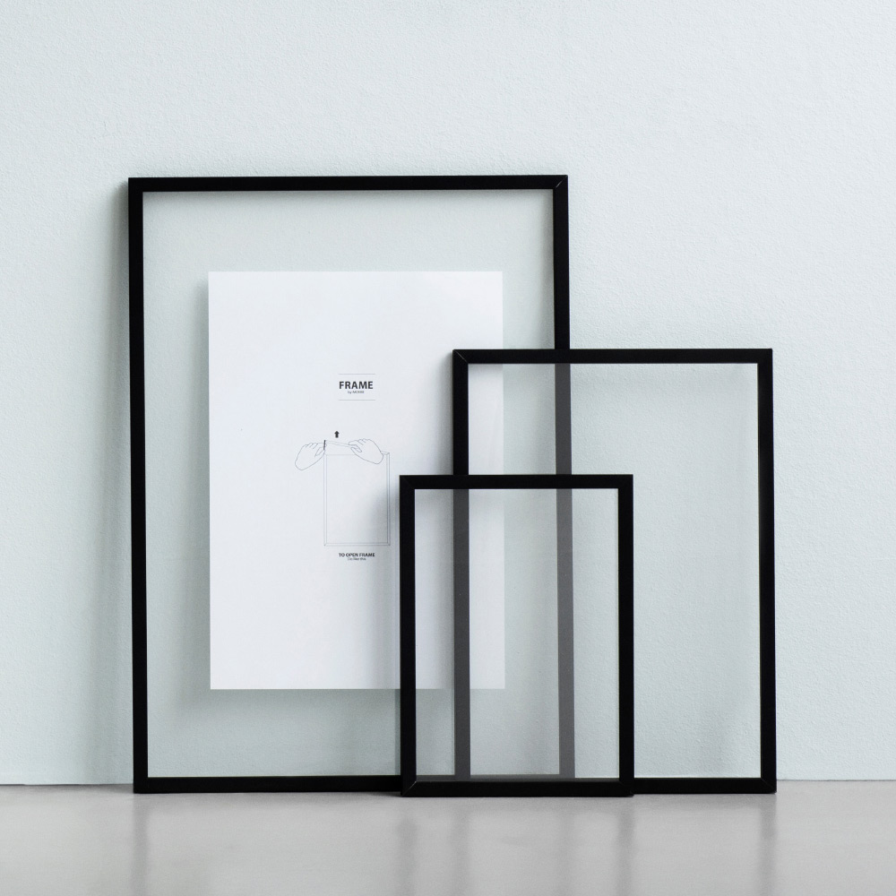 アクリルの板2枚を重ねて枠を付けただけのシンプルなフレーム。板の間へお気に入りのアートを自由にディスプレイできます。透明なので、背景の壁紙を活かすディスプレイも楽しめます。2枚のアクリル板と四辺のフレーム、枠を囲むゴムバンドのみのシンプル&スマートな構造だから、お気に入りのアートや写真がより映えるはず。フレームの素材によって、空間の印象も変わります。壁に掛けたり立てかけたり、表裏の区別がないから、両面に入れて気分で掛ける面を変えたり、吊るしたり。ディスプレイのバリエーションを自由自在に楽しんで。MOEBE(ムーベ)コペンハーゲンを拠点に、プロダクト、家具、インテリアを制作する北欧のデザインスタジオ。2014年より2人の建築家マーティン・ドゥ・ネアガード・クリステンセン (Martin de Neergaard Christensen)、ニコラス・オールドロイド(Nicholas Oldroyd)、そして家具職人のアンダース・タムス(Anders Thams)で活動しています。建築的な思考に基づき、徹底的に考え抜いた構造によるシンプルで美しいデザインを目指してすべて自社で設計を行っています。「良いデザインとは、それ自体がサステナブル(持続可能なもの)である」という信条のもと、簡単にリペア、組立、リサイクルできるパーツで構成されています。アクリル板と枠材をラバーバンドで固定するだけの「FRAME(フレーム)」など、緻密な構造とミニマリズムを追求したプロダクトは発表されるや否やすぐに世界的な人気を博しています。