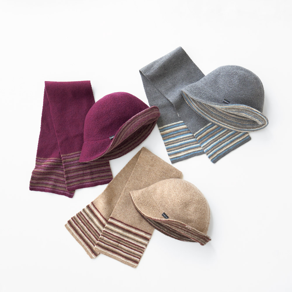 ウール100%のニット生地を縮絨しフェルトのような風合いにした、暖かな帽子と少し寒い時に便利なプチマフラーのセット。くるっと丸めてコンパクトに折りたためるので、旅先で大活躍することまちがいなし。シンプルな無地面とニュアンス豊かなボーダー柄のリバーシブル仕立て。そのままかぶって二通りのイメージで使い分けができるだけでなく、つばの折り返しで印象が変わるので、コーディネートの幅がぐんと広がります。おそろいのプチマフラーとの組み合わせで、着こなしのバリエーションが無限大に! 持って行く荷物が限られる旅行先へ持って行けば、荷物を少なくできるうえ、毎日の洋服に合わせてイメージを変えて身に着けることができるので、帰ってきて撮った写真を見直したときに「なんだかどの写真も同じコーデに見える…」ということにならずに済みます。●ウールニットを縮絨し、風を通さずあったか。●シンプルな無地面とニュアンスのあるボーダー柄のリバーシブル仕立てで、コーディネートの楽しみも広がります。●つばは上げ下げ自由で、さまざまな表情を楽しめます。●お揃いのプチマフラーつきで、ギフトにも喜ばれます。●コンパクトに丸めて持ち運びでき便利です。