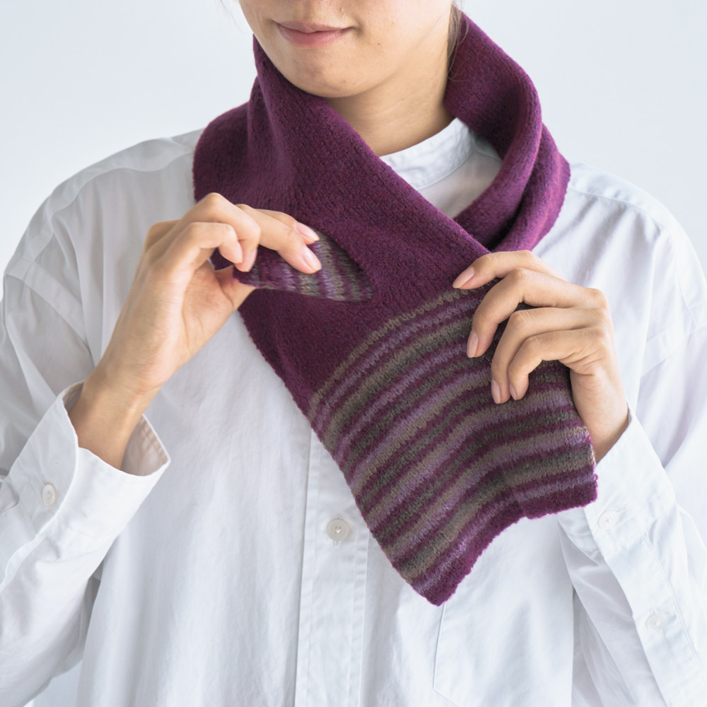 (ア)モーヴ マフラーは片方の端にスリット穴が開いているので、そこへ通すだけで簡単に巻くことができます。