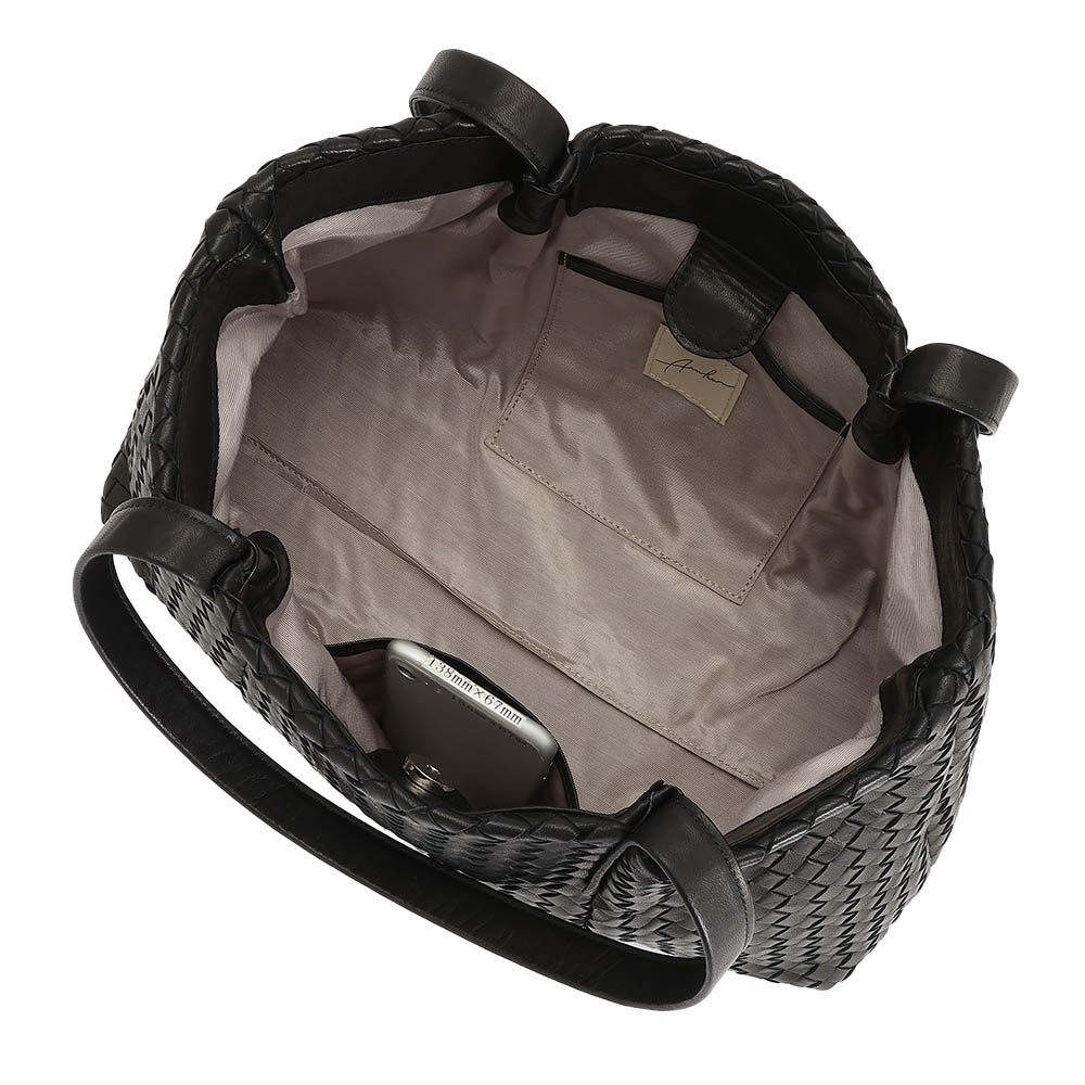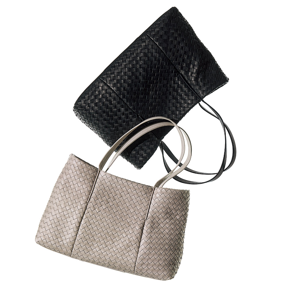 きめ細やかな和心、匠の知恵が使い心地を決める日本の繊細さを宿した、美しく機能するバッグ薄くて柔らかなホースレザーの妙技軽さと美しさを追求した“差しメッシュ”本体の革にバイアスの切り込みを入れ、細い帯状にカットした革を通して丹念に編み上げていく―。熟練した職人の経験や技量が問われる差しメッシュ技法は、日本ブランド「Arukan」ならではの完成度の高さに注目。しなやかな手触りと丈夫さ、何より軽量化を追求したホースレザーのバッグをご紹介。セミショルダーのトートバッグはA4サイズが余裕で収まるタフネスな機能派。平手ハンドルを本体のタックに挟み込む仕様にも、ソリッドな美しさだけでなく機能性の拘りが見られます。肩に掛けたときの収まりのよさ、持ちやすさは格別。≫ POINT手間も技術も要する挟み込みのハンドル。すっきりとしたデザインが端正なディテールを引き立て、さらに持ちやすさも向上。