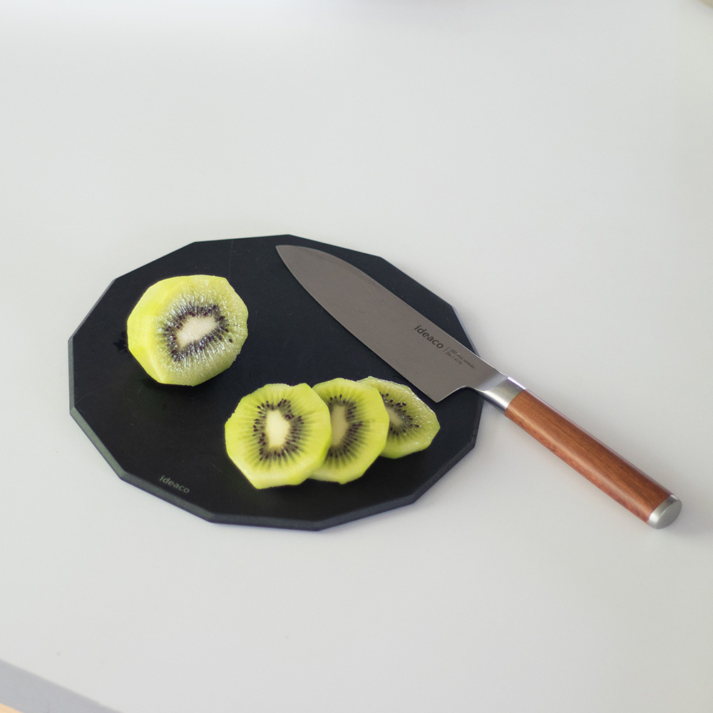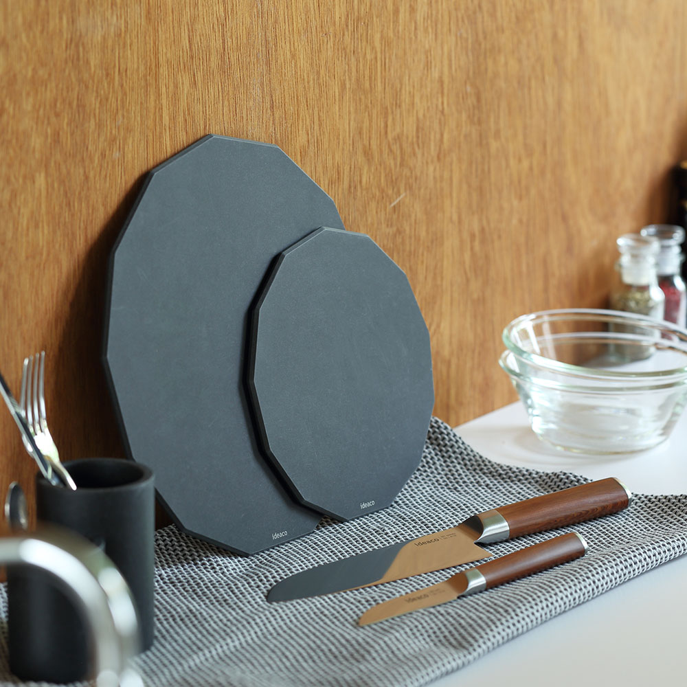 美しく、珍しい13角形の螺旋のカタチのカッティングボード(まな板)。ブレッドナイフのようなギザギザ刃でも傷つきにくく、プレートしても活躍します。見た目に美しく、珍しい13角形の螺旋のカタチ四角でも丸でもない"13角形"の形を採用。”13”という数字は、花びらの枚数やパイナップルや松ぼっくりの螺旋の数など自然界の中で多く見られ、世界でもっとも美しい螺旋と言われる"フィボナッチ数列"をもとに設計しています。角があるのでどの向きからでも切りやすく、奥行きがあるのでまな板の上を広く使えます。食材ごと、切りながらクルクルまな板を回していけば、まな板の上で食材の切り分けができ、バットに移したり、食材ごとに都度まな板を洗う手間も省けます。立てかけておいても転がることなく安定感があるのもポイントです。料理を引き立てる美しいプレートとしても活躍天然木の繊維を合成した樹脂素材でできているので、硬く、ブレッドナイフのようなギザギザ刃でも傷つきにくいのが特徴です。パンやチーズなどを切った後そのまま食卓に並べられ、おしゃれなプレートとしても活躍します!