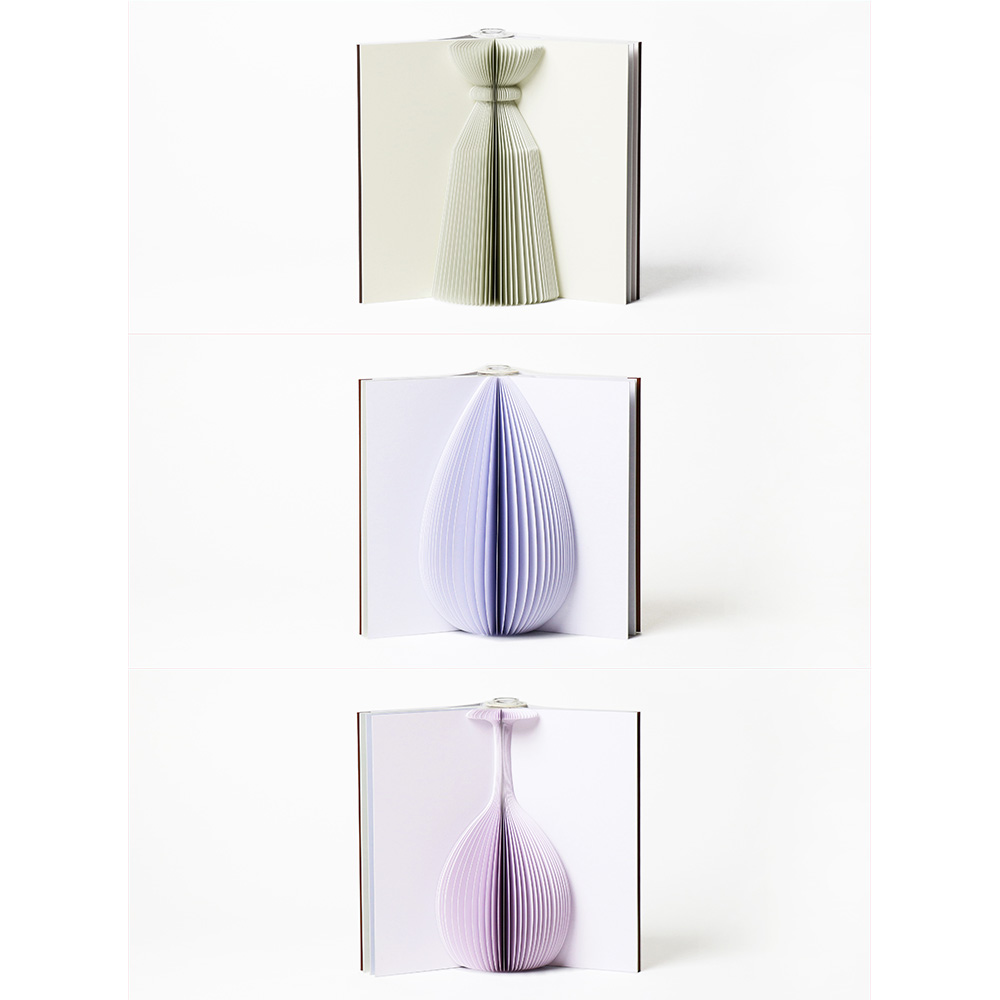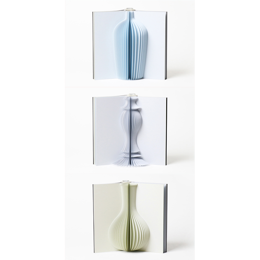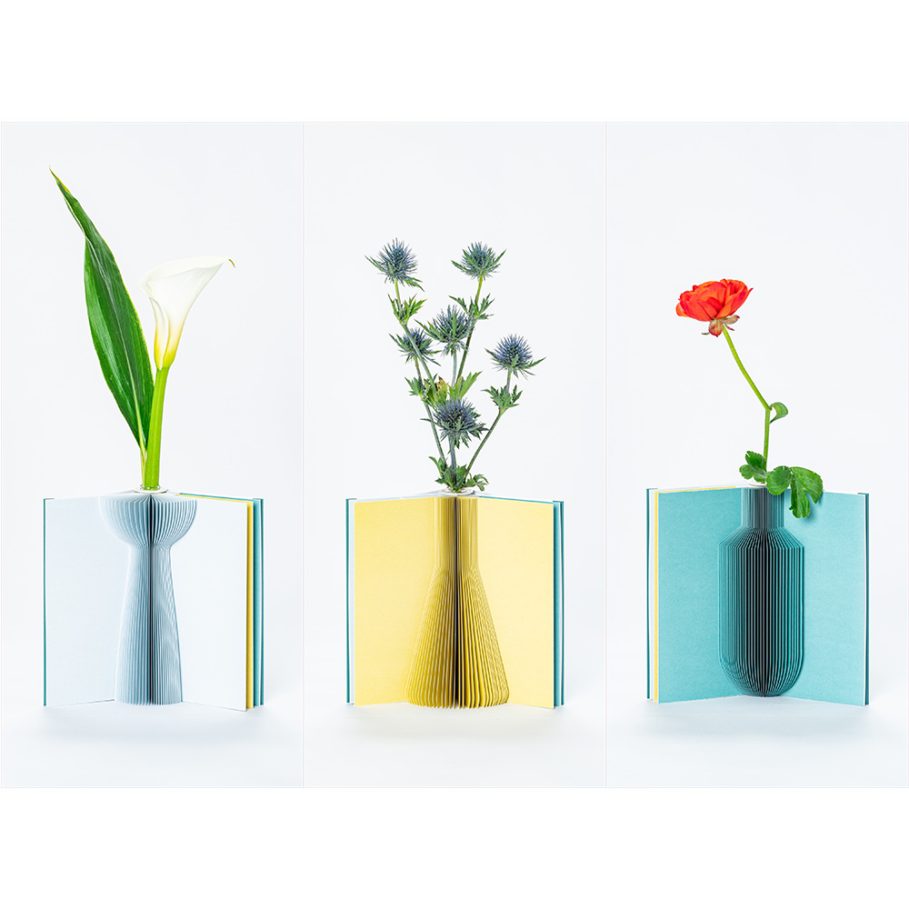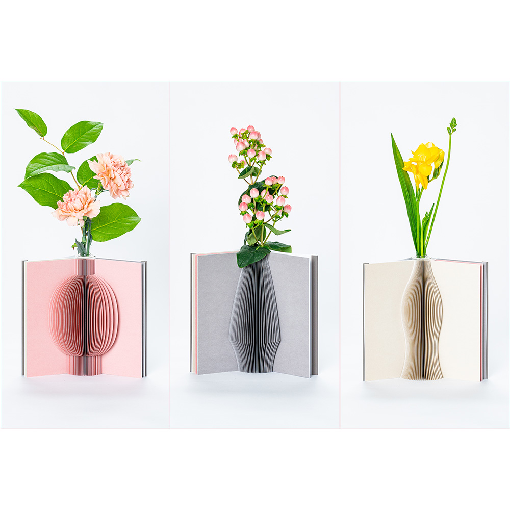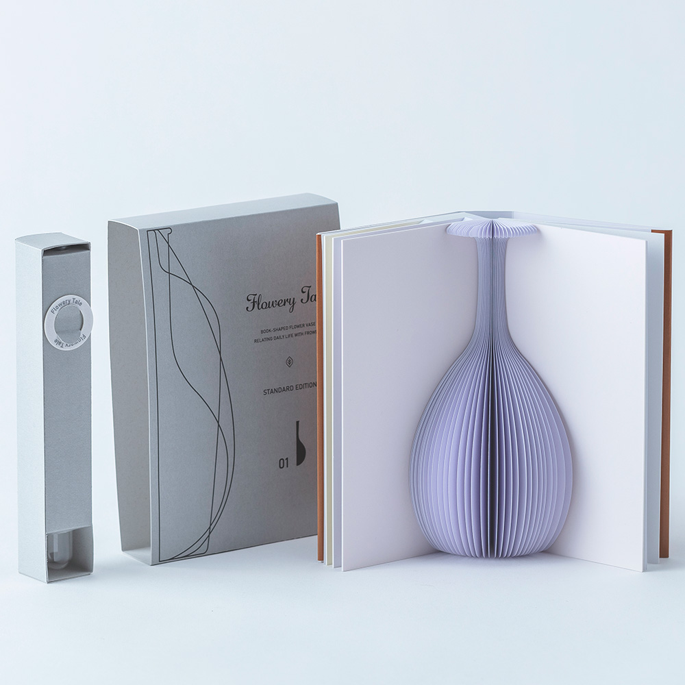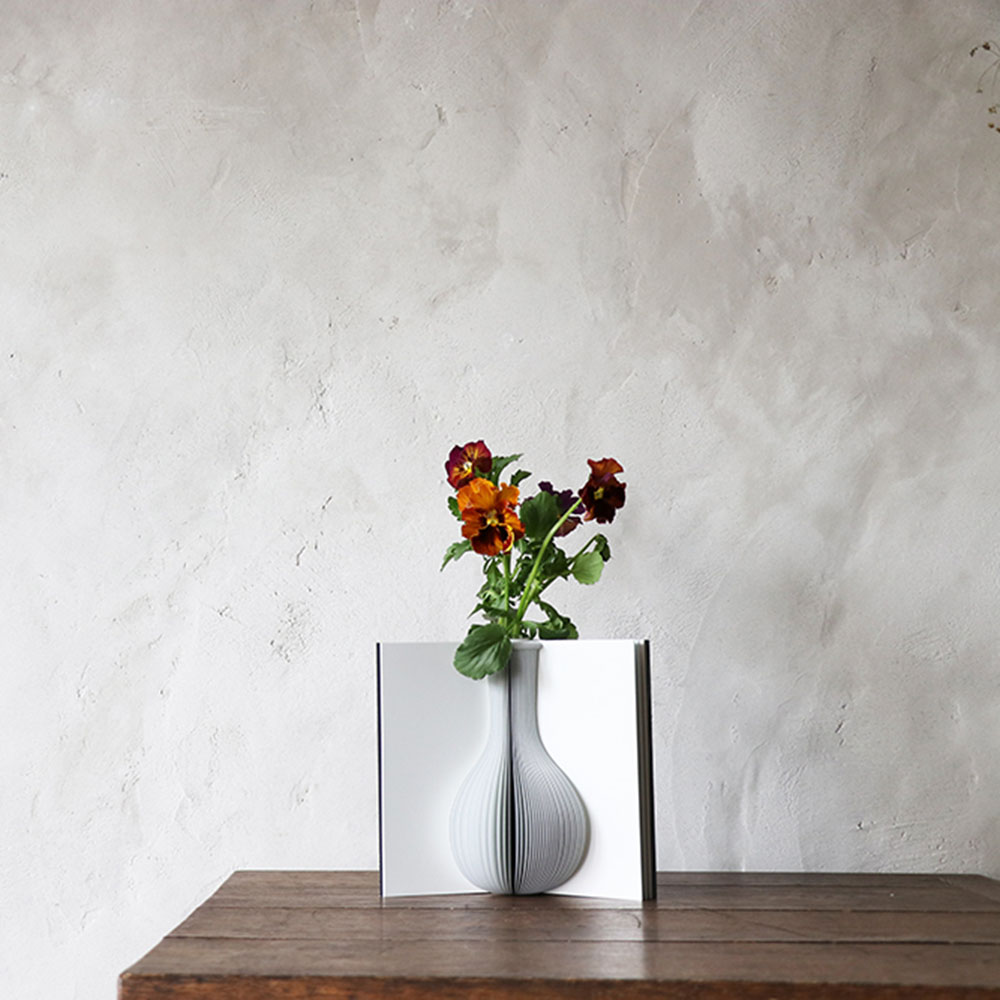 『Flowery Tale −本のように開き、花と暮らす日常を物語る花瓶−』ゆったりと流れる時間。本棚から指先で選び出し、目次にそっと目を落とす。好みのページを開き、お花を添えて一輪挿しに。お好みの形のページを開いて花を活ける、本のような花瓶です。試験管以外はすべて紙でできています。【使用方法】1. 本を開くと花瓶のシルエットが浮かび上がります。2. 試験管にストッパーを取り付け、これをカバーと背表紙の隙間に上から差し込むことで、実際に使用できる一輪挿しの花瓶となります。【選べるカタチ】1冊の本に3パターンの花瓶シルエットを収蔵しています。花瓶の上下は、片方は細め、もう片方は広めの設計となっています。本を上下逆さにしてもご使用いただけますので、花瓶シルエットは全部で6パターンの使用が可能。お花の種類やボリュームに合わせて、アレンジをお楽しみください。使用しない時は洋書のインテリアとして楽しんでいただいたり、本棚に収納いただくことが可能です。