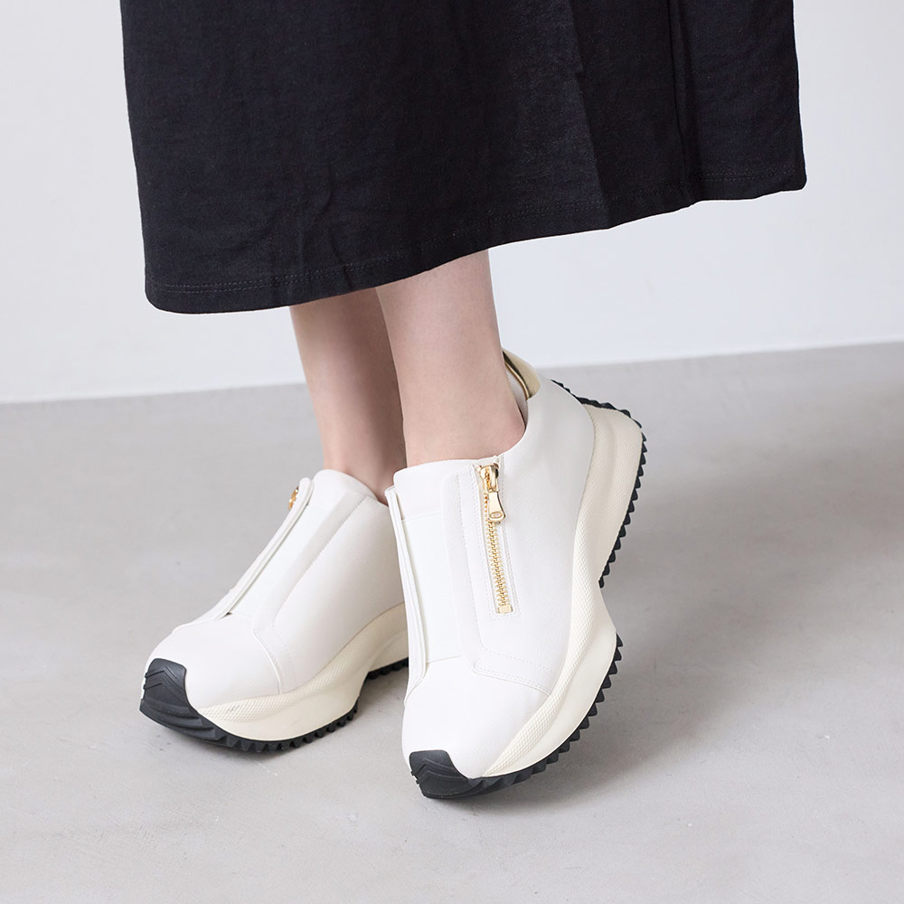 厚底でスラっと見え。デイリーに活躍する一足。厚底ソールながら前後の高低差が少なく歩きやすいスニーカーファスナーとセンターゴアで脱ぎ履きしやすく、シンプルなデザインでパンツ、スカートどちらにも合わせやすいから、デイリーユースにぴったり。重くないのも嬉しいポイントです。