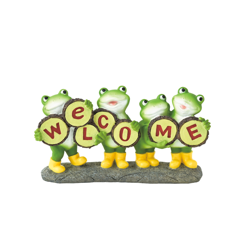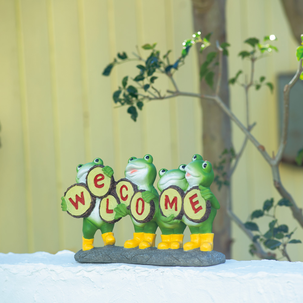 個性的で表情豊かなカエルたちが出迎えるウェルカムスタンド。庭入り口のアイコンに。