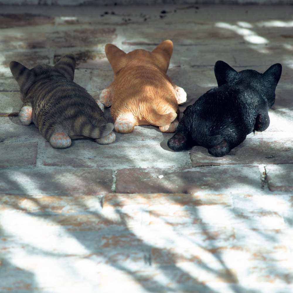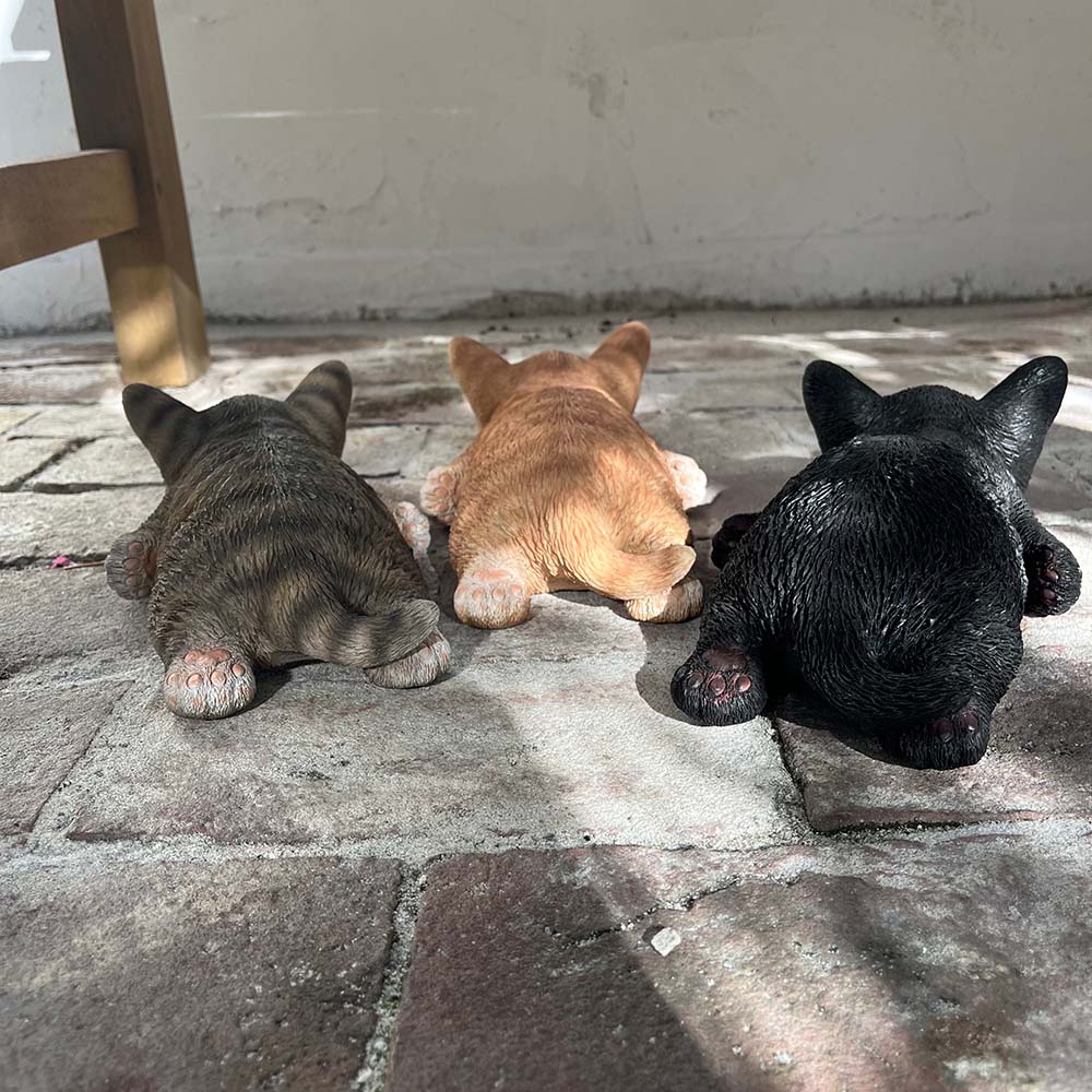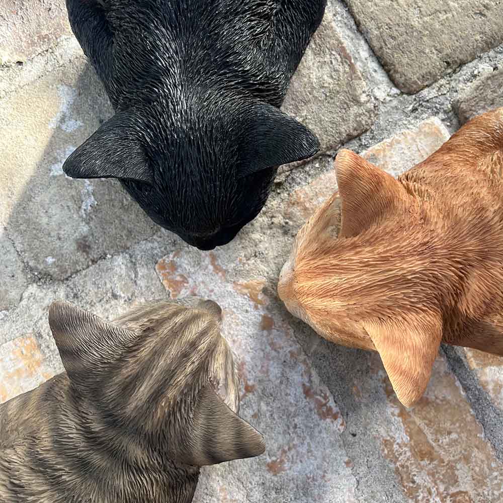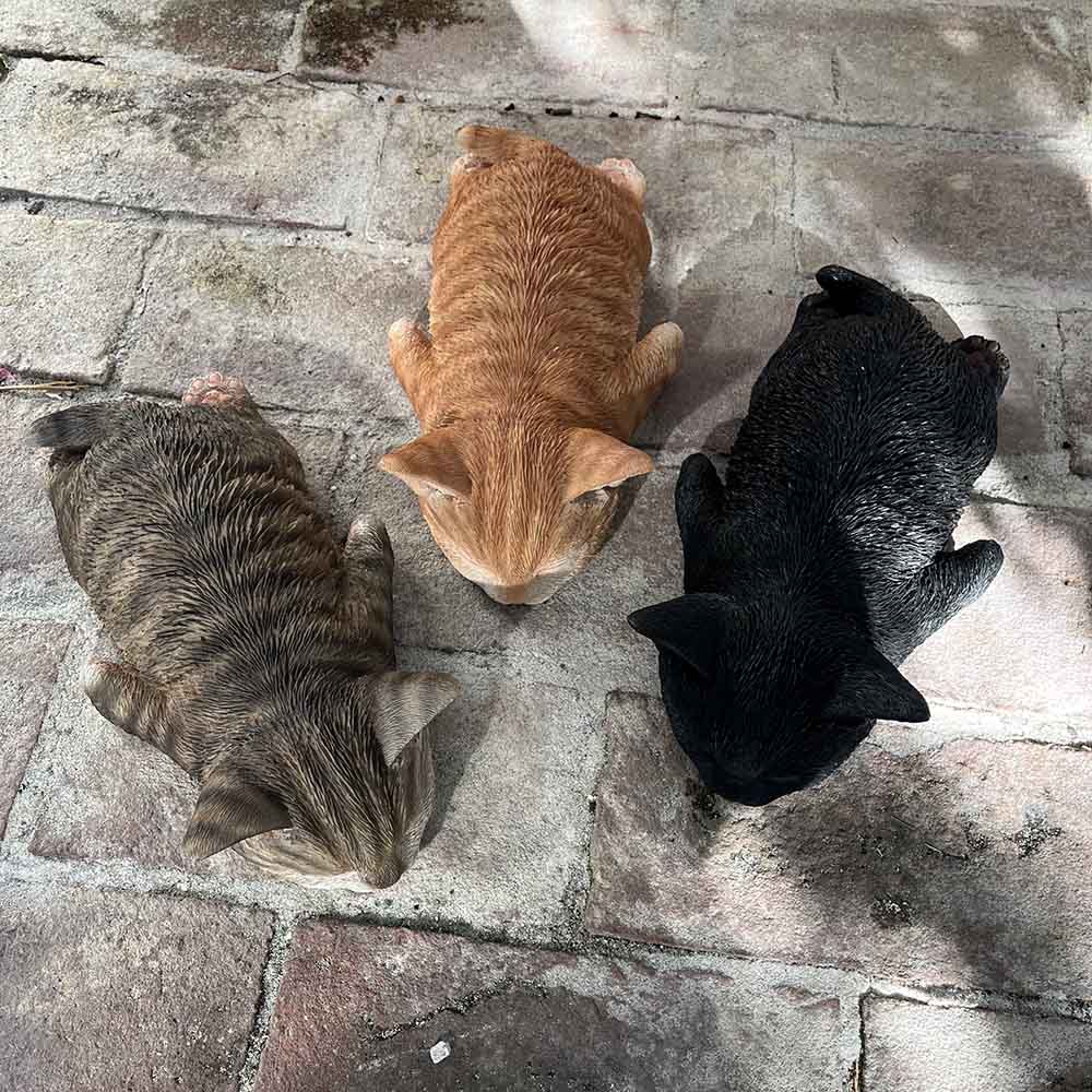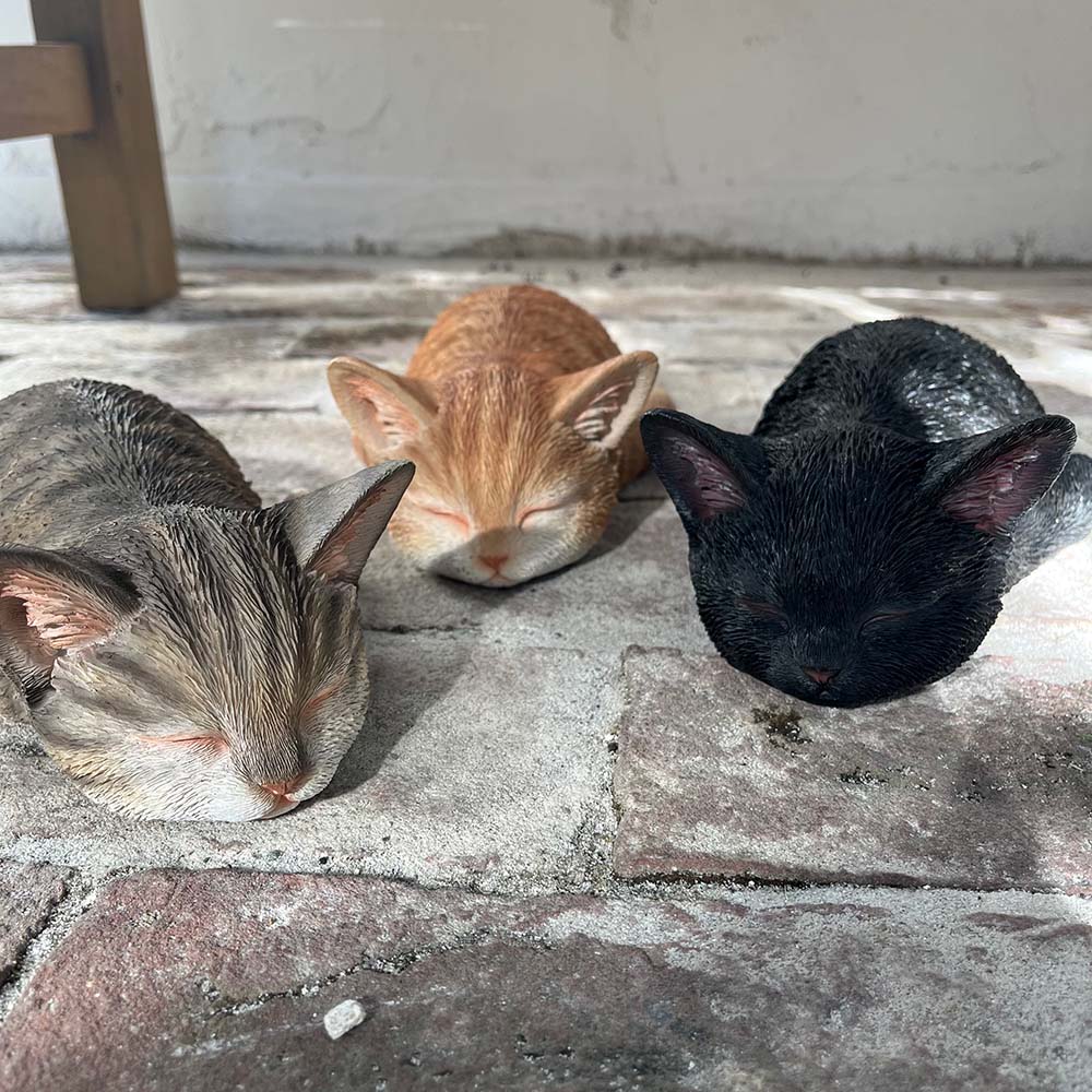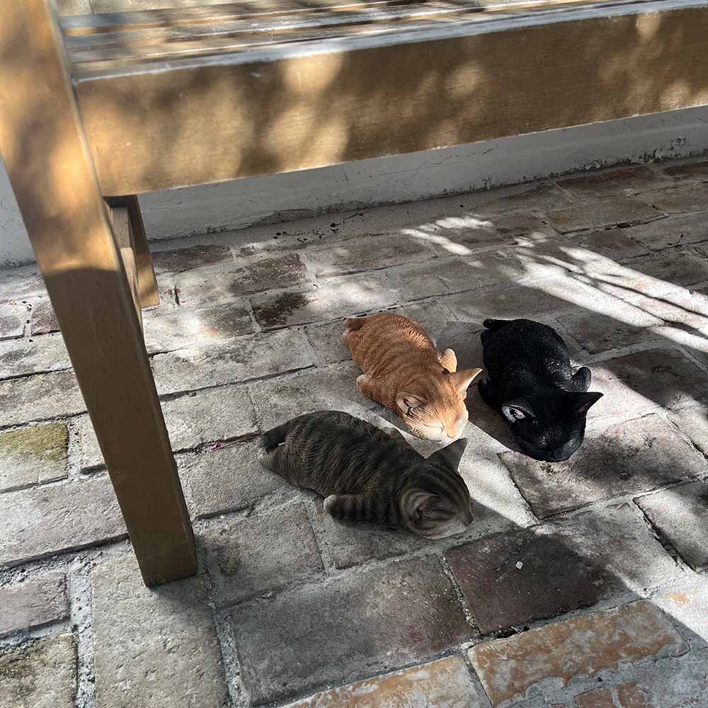 木陰で休んでいる猫3匹のオブジェ。本物さながらの毛並みや夏バテ気味の表情がとってもリアル。